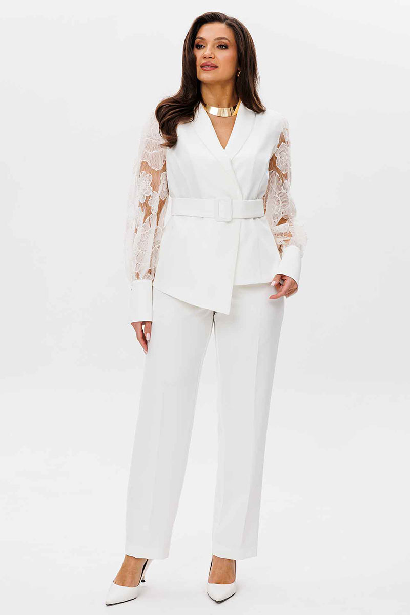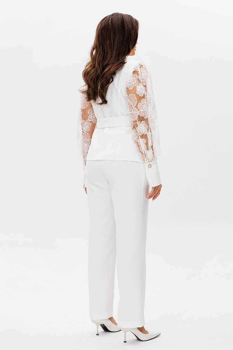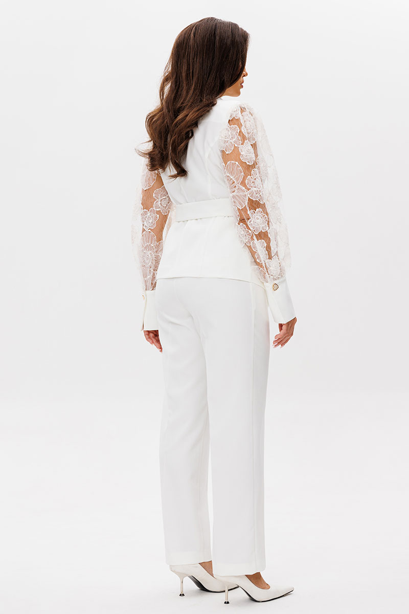Жакет полуприлегающего силуэта, двубортный, с застежкой на две пуговицы. Воротник английский. Рукав втачной, из кружевной ткани, заканчивается манжетой на пуговице. По бокам рельефные швы, формирующие силуэт. На уровне груди предусмотрены нагрудные вытачки.