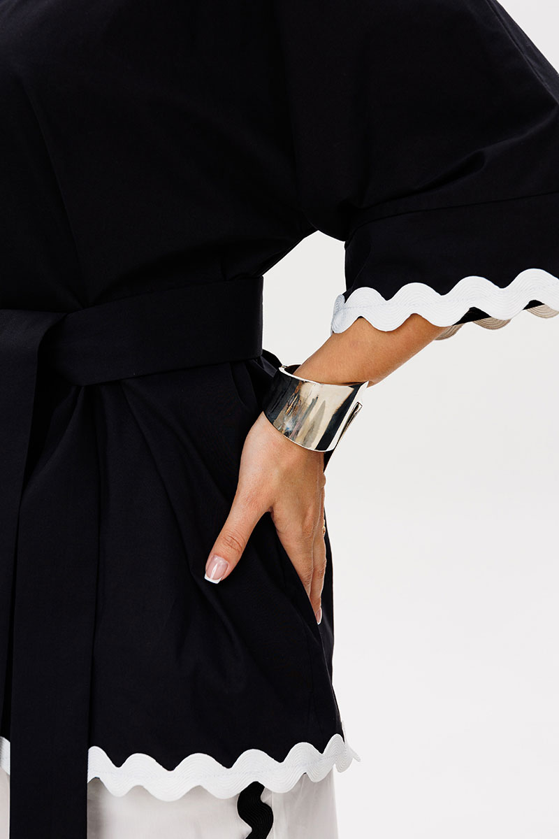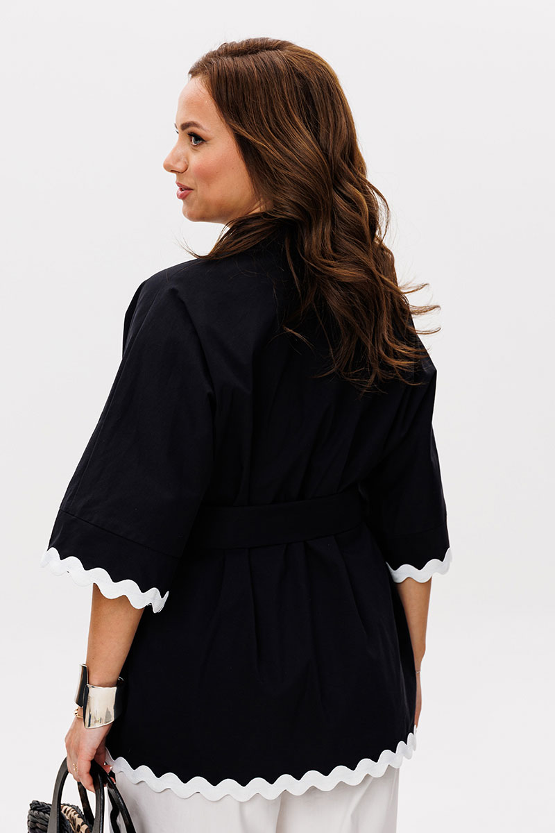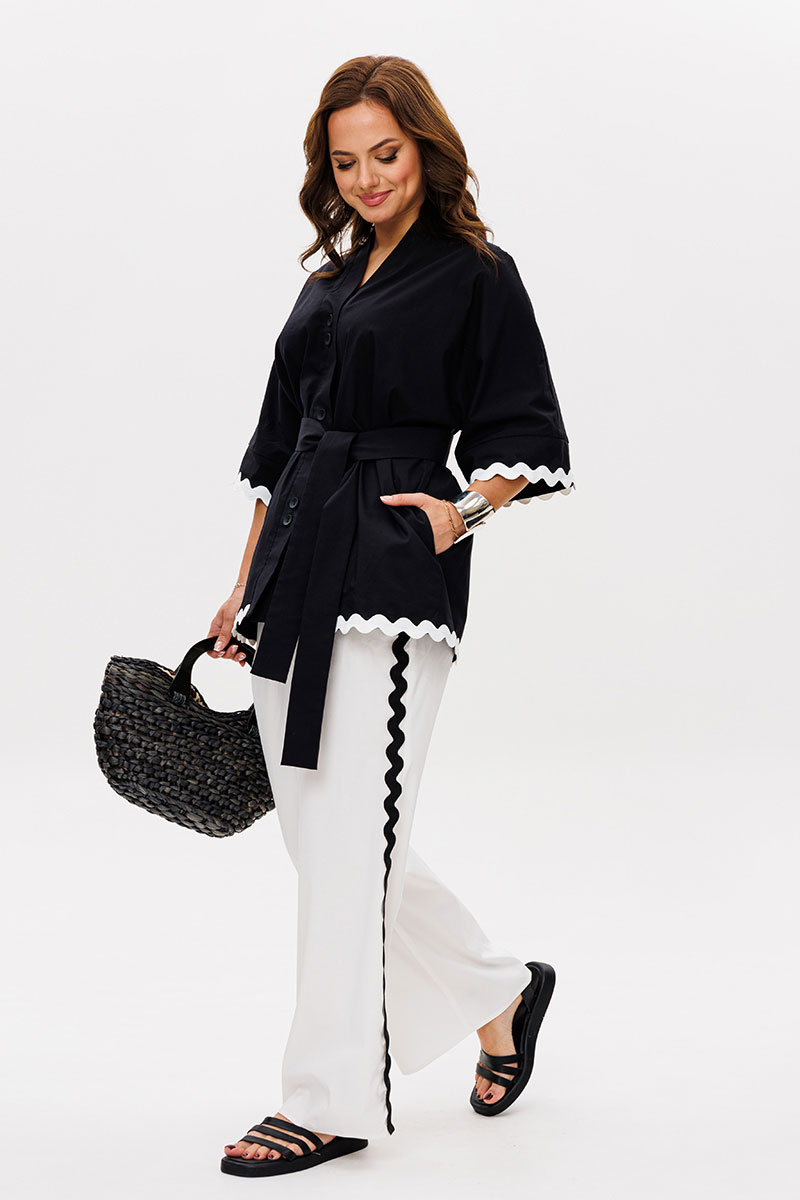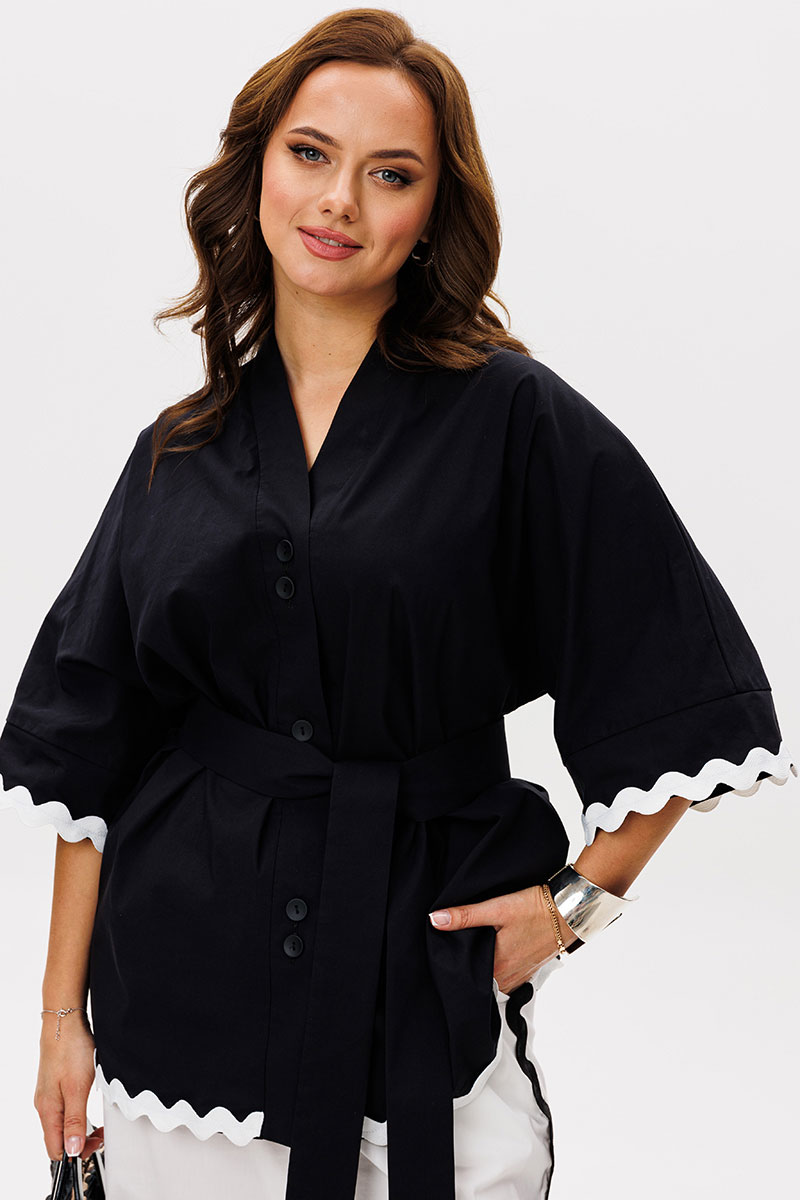 Блуза свободного силуэта с центральной застежкой на 6 пуговиц. Борта и горловина обработана широкой планкой. Карманы в боковых швах. Рукав цельнокройный, по низу рукава и низу изделия настрочена декоративная тесьма.