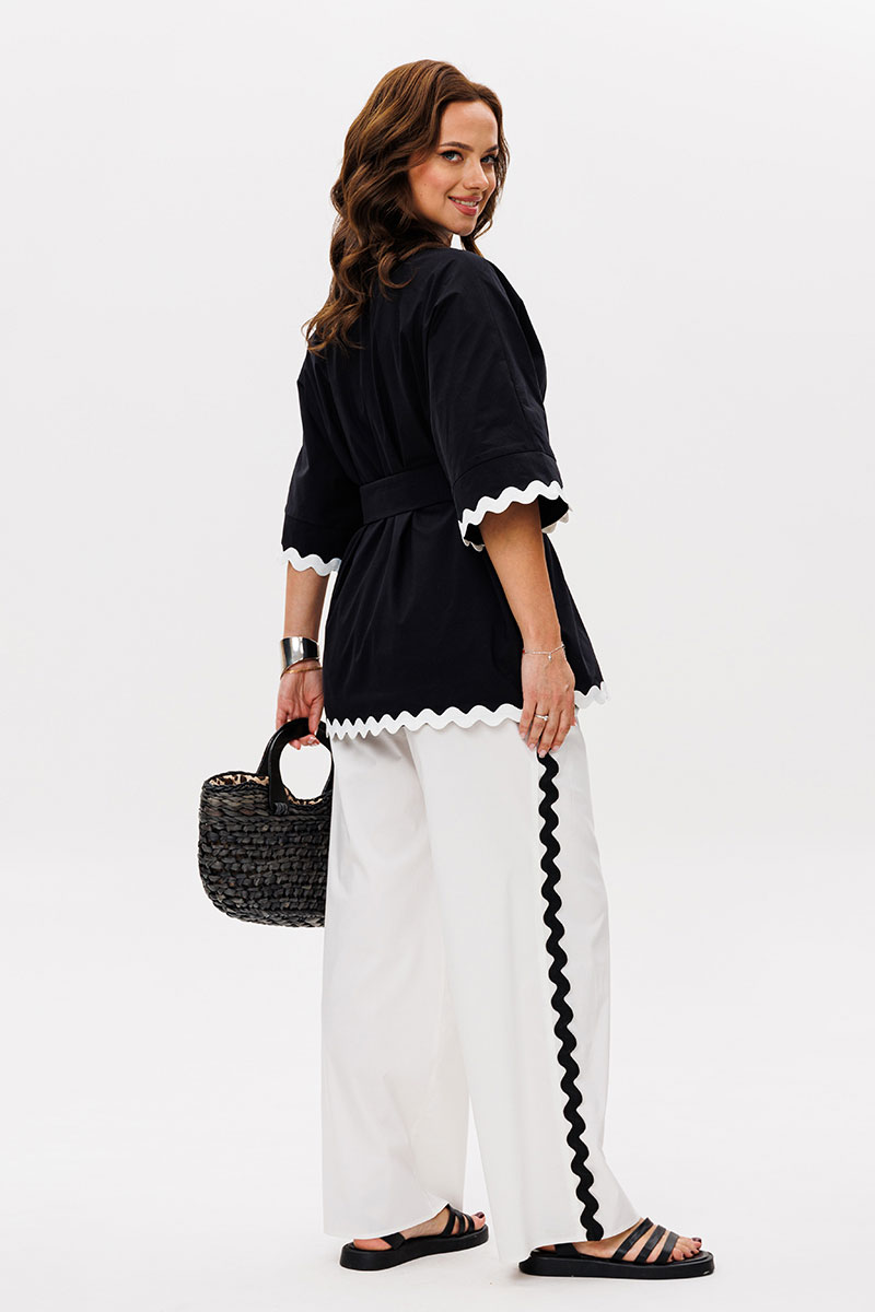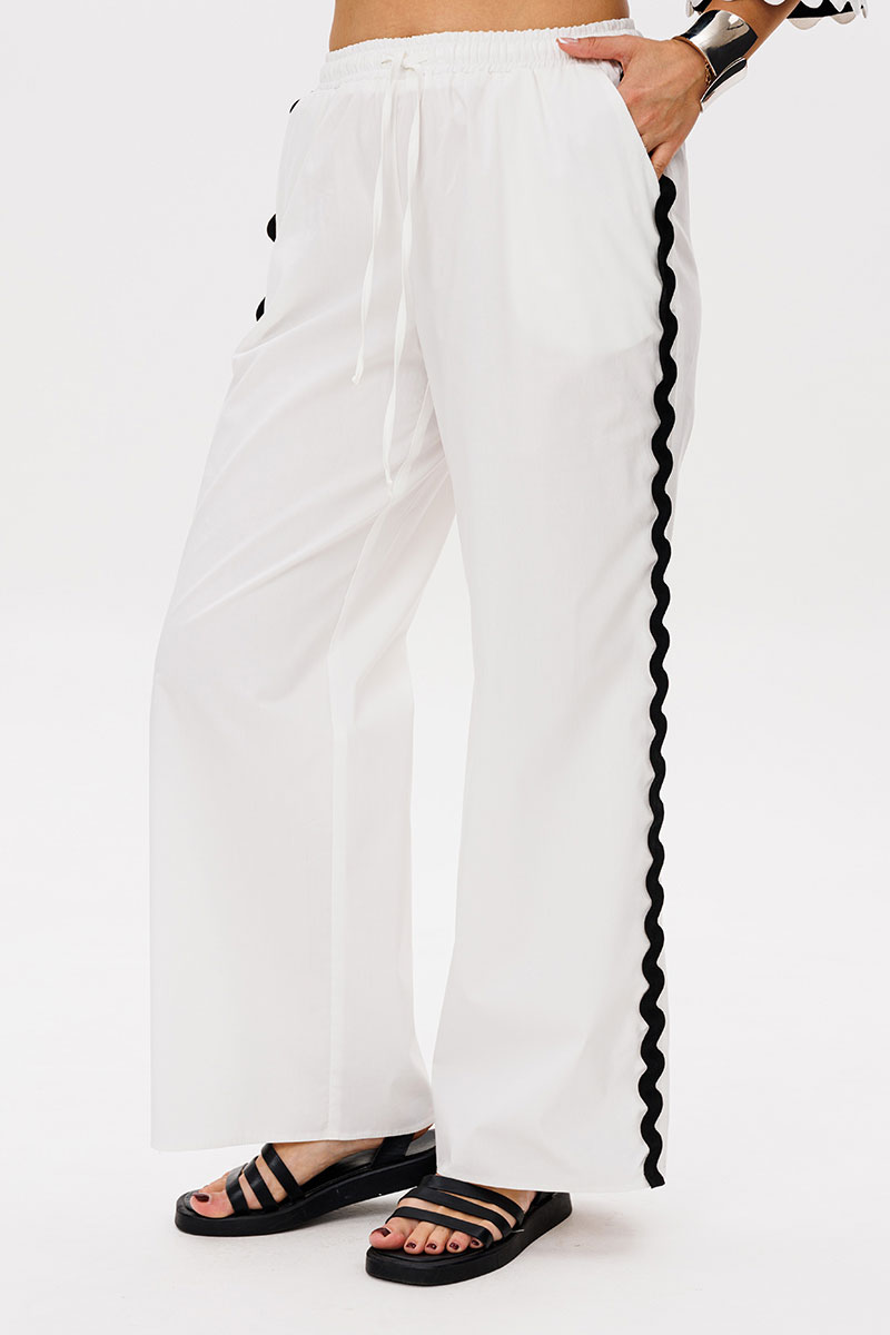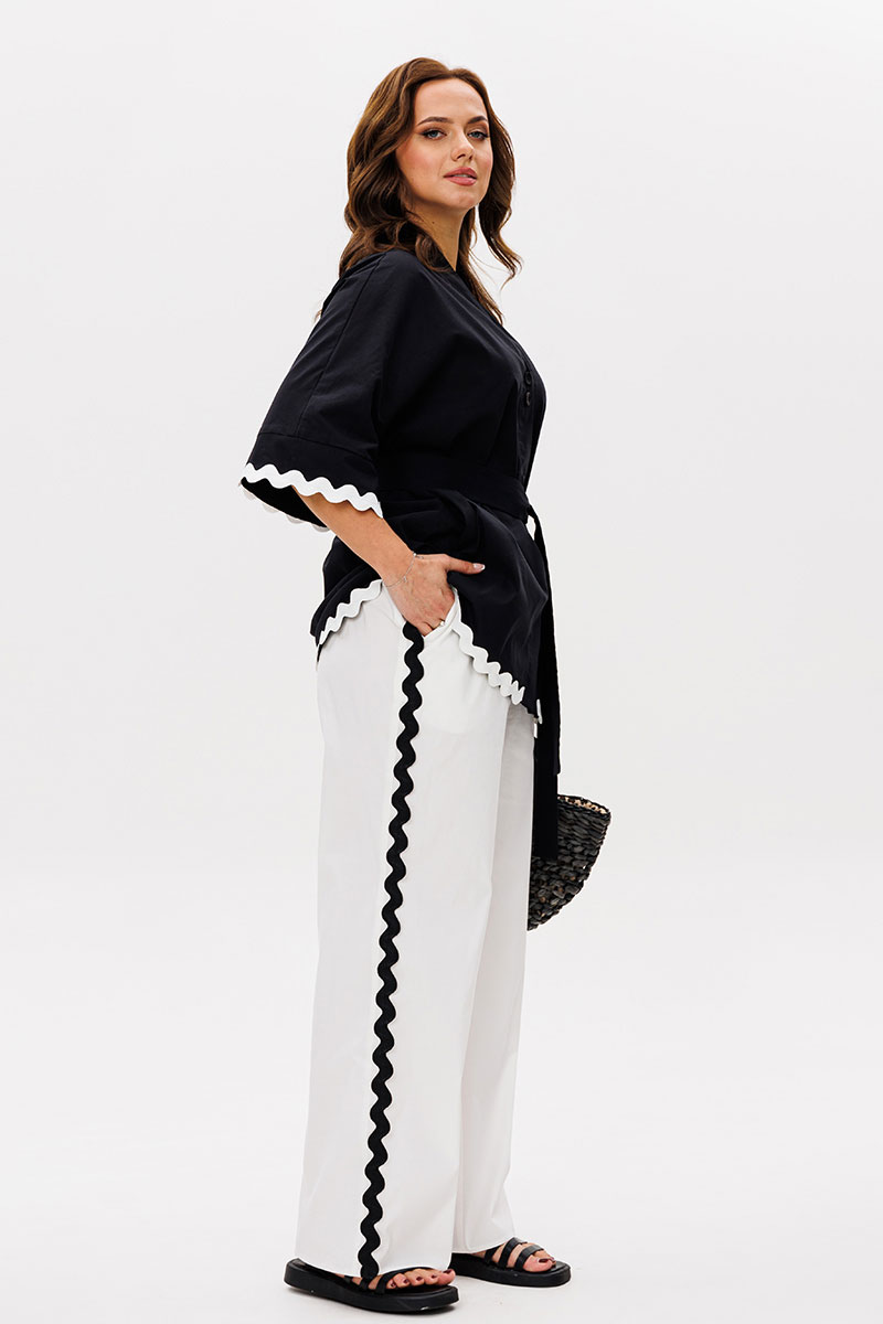Брюки прямые на резинке со шнурком, свободные, прямые, с боковыми карманами. На боковые швы настрочена декоративная тесьма. Дополняет модель пояс.