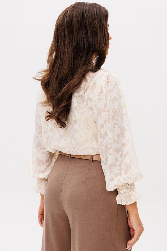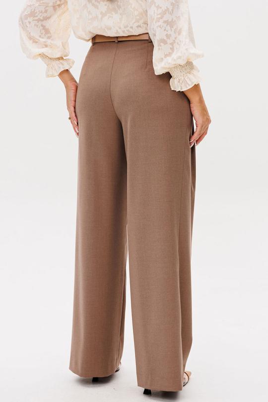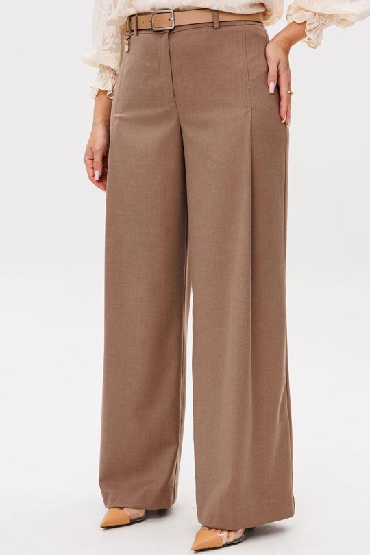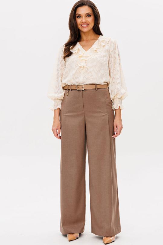 Брюки женские свободного силуэта с высокой посадкой, максимальным расширением от бедра (палаццо). Брюки на притачном поясе. По переду складки в центрах половинок брюк и застёжка на молнию с гульфиком и откоском. Талевые вытачки по задним половинкам брюк.