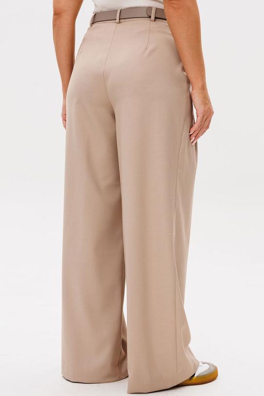 Брюки женские свободного силуэта с высокой посадкой, максимальным расширением от бедра (палаццо). Брюки на притачном поясе. По переду складки в центрах половинок брюк и застёжка на молнию с гульфиком и откоском. Талевые вытачки по задним половинкам брюк.