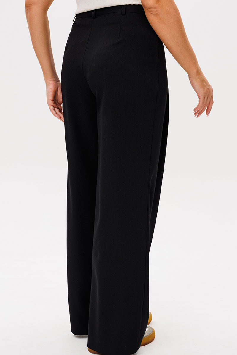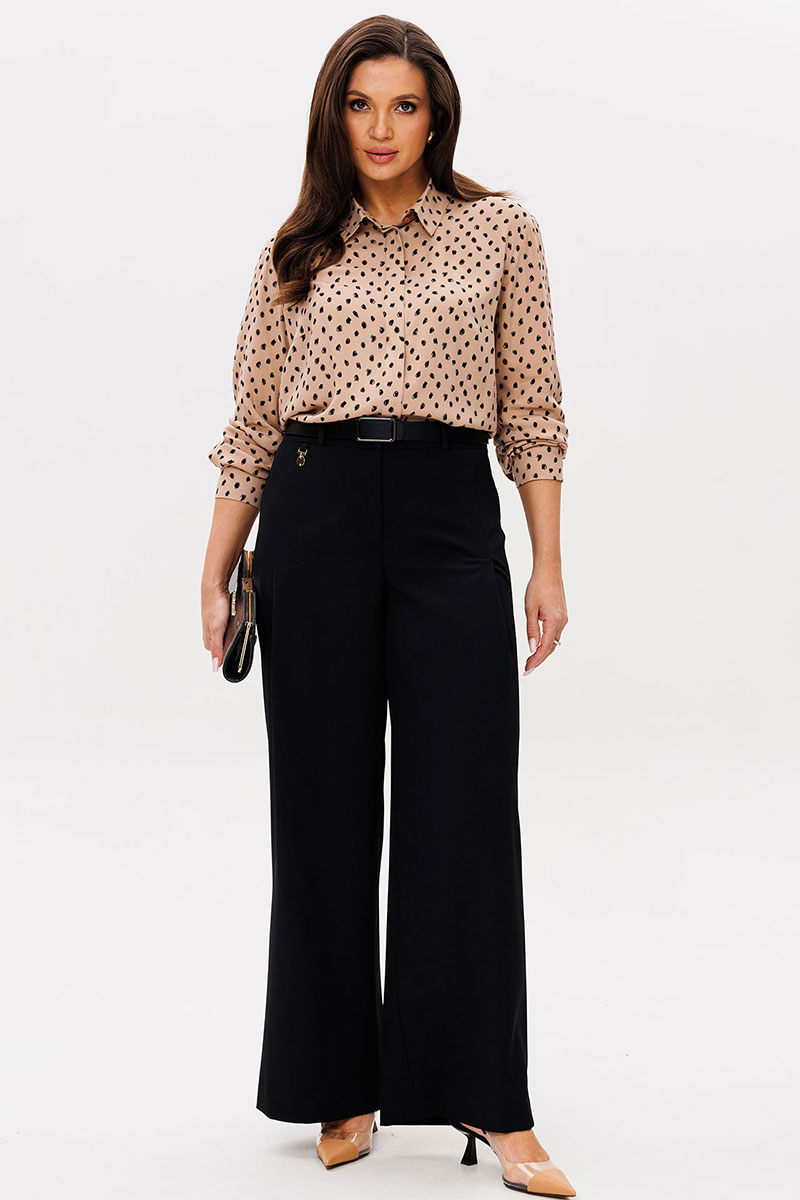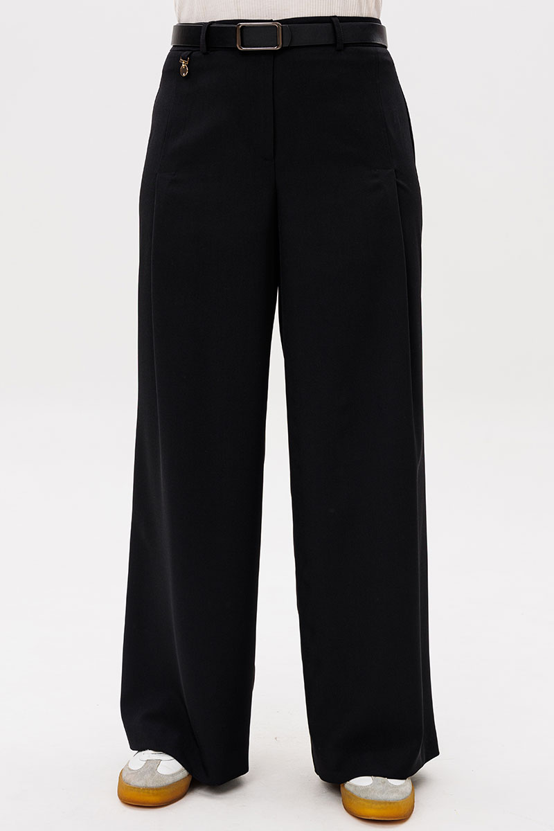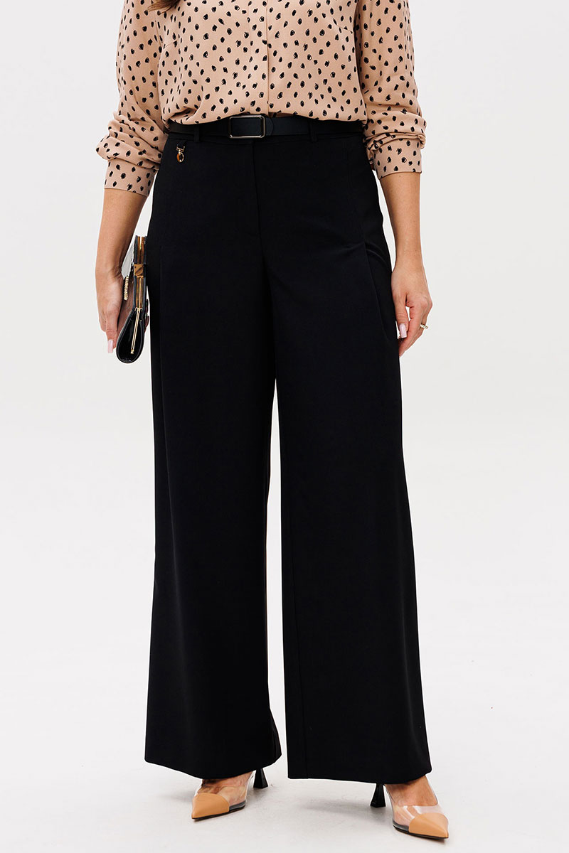 Брюки женские свободного силуэта с высокой посадкой, максимальным расширением от бедра (палаццо). Брюки на притачном поясе. По переду складки в центрах половинок брюк и застёжка на молнию с гульфиком и откоском. Талевые вытачки по задним половинкам брюк.