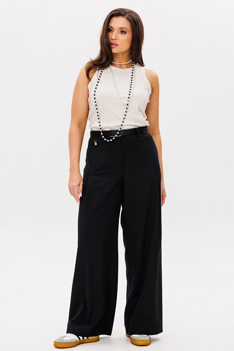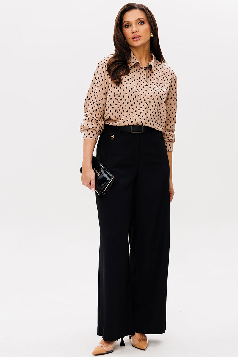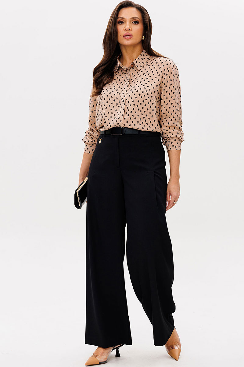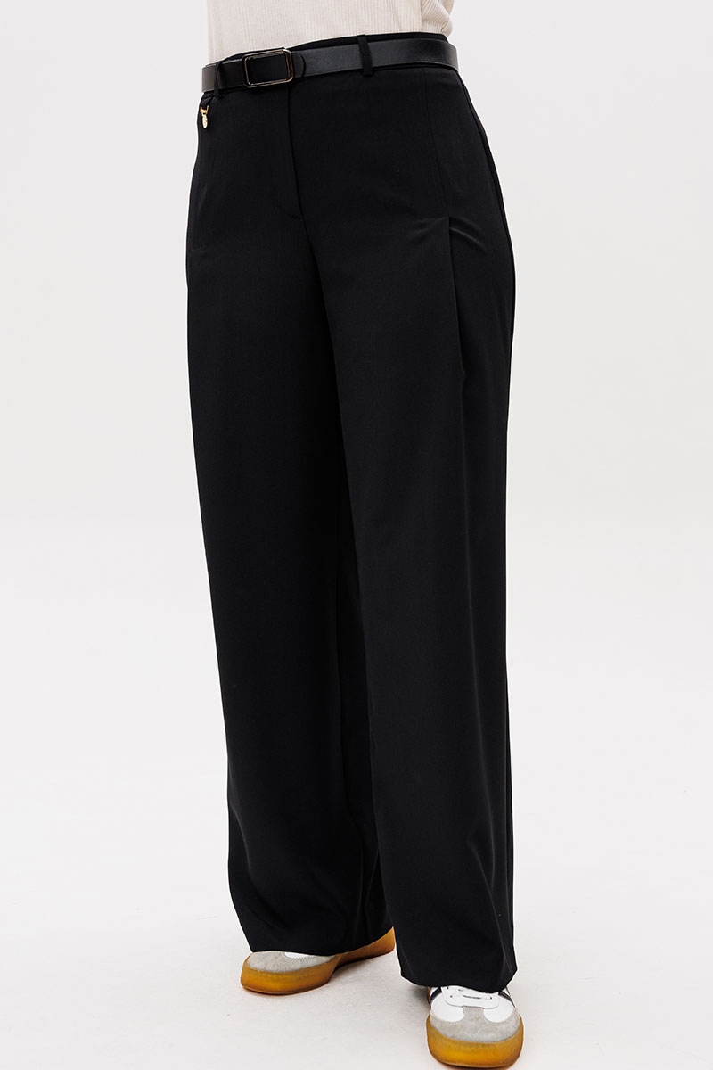 Брюки женские свободного силуэта с высокой посадкой, максимальным расширением от бедра (палаццо). Брюки на притачном поясе. По переду складки в центрах половинок брюк и застёжка на молнию с гульфиком и откоском. Талевые вытачки по задним половинкам брюк.