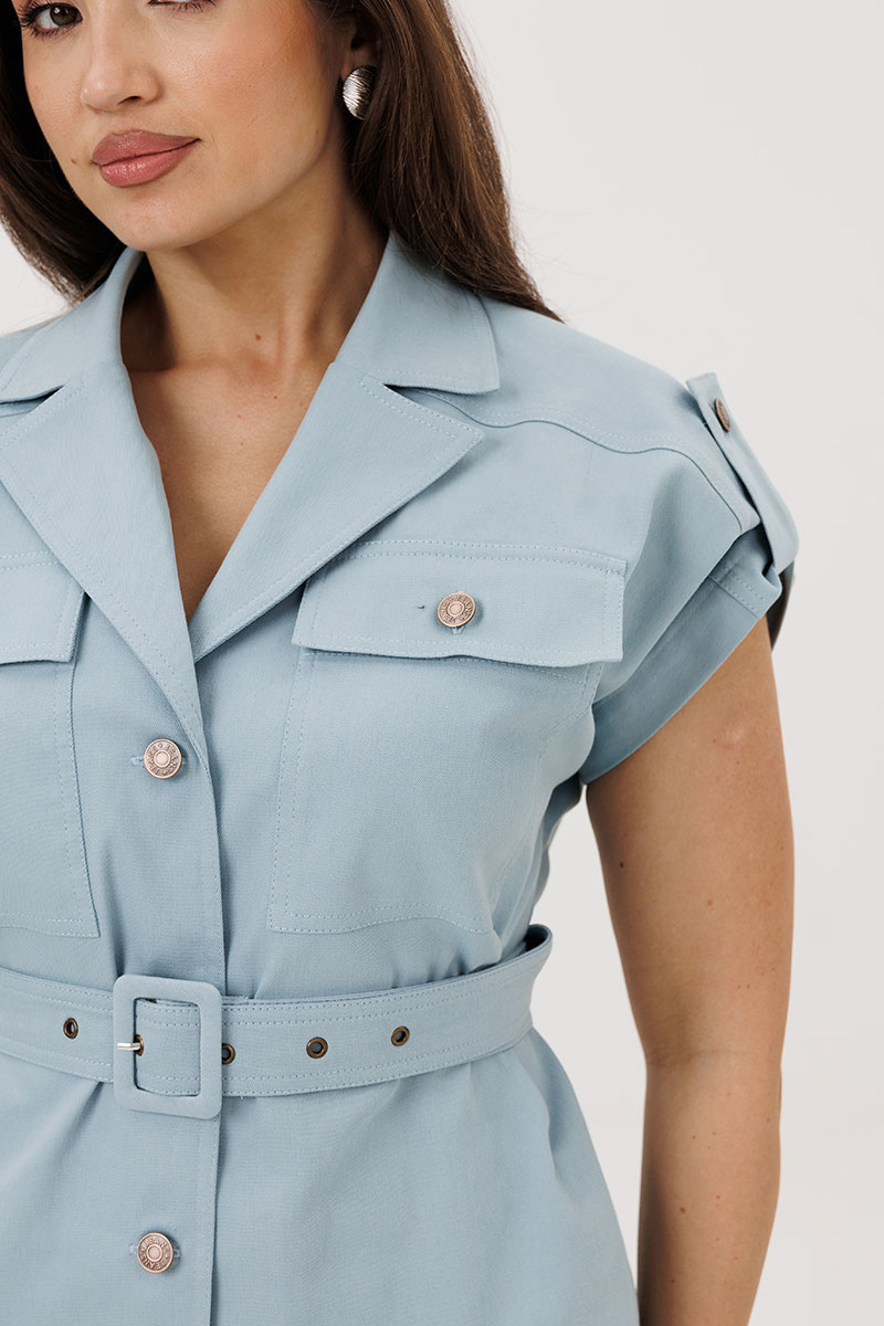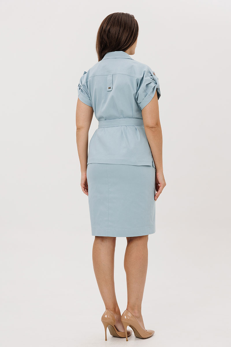 Украшает костюм отделочные строчки. Дополняет костюм пояс с пряжкой.