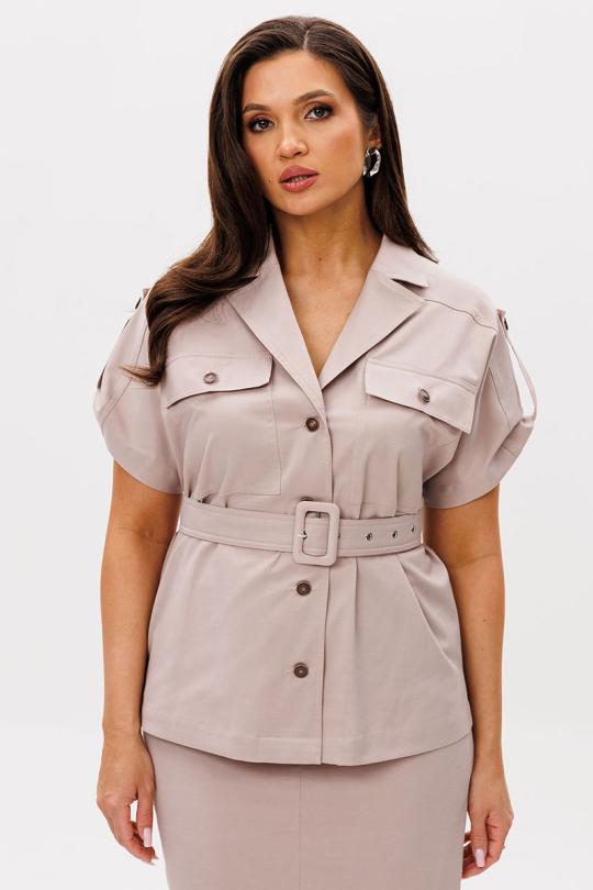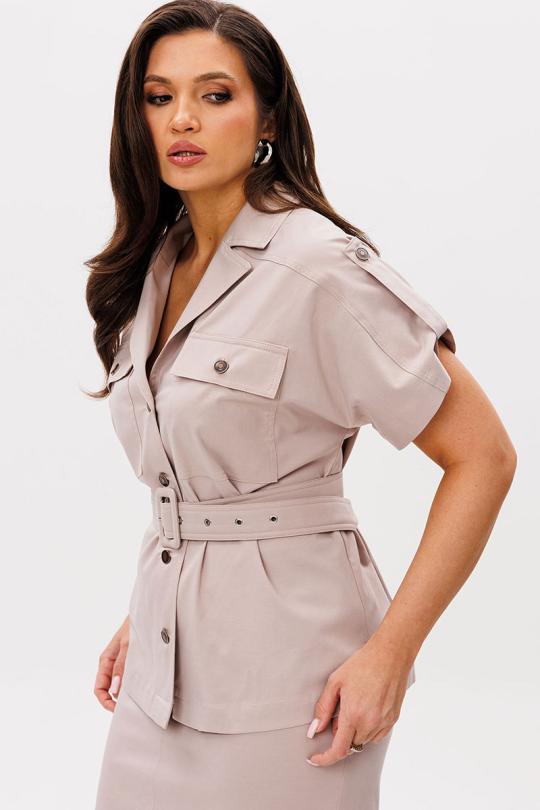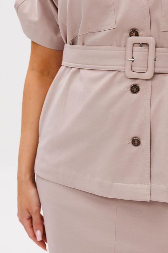 Жакет со спущенными рукавами и патами. Перёд жакета с кокетками, накладными карманами с клапанами на застёжках металлических пуговицах. Воротник отложной на стойке с лацканами