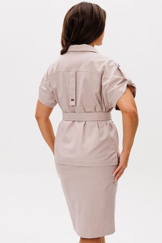 Юбка, зауженная к низу, на обтачке. Перёд с талевыми вытачками и центральным швом, который заканчивается разрезом. По заднему полотнищу талевые вытачки, центральный шов и застёжкой на