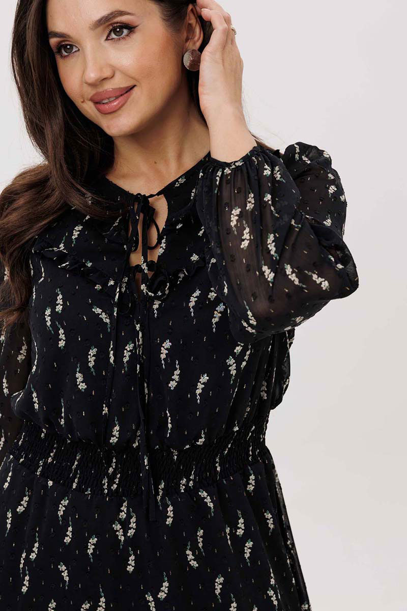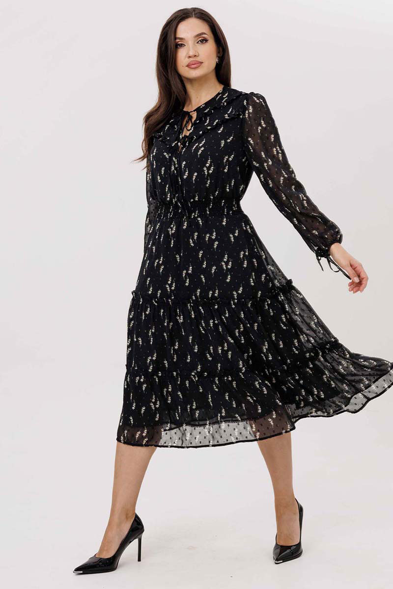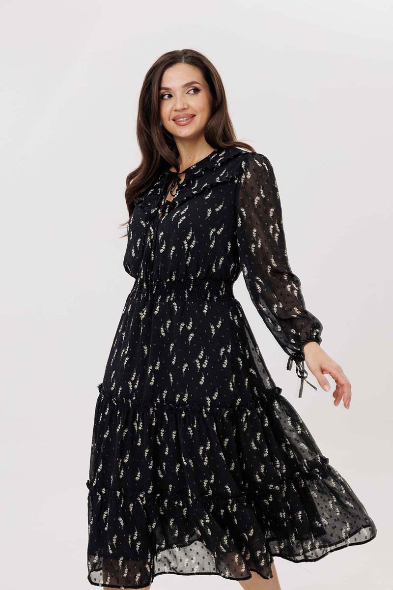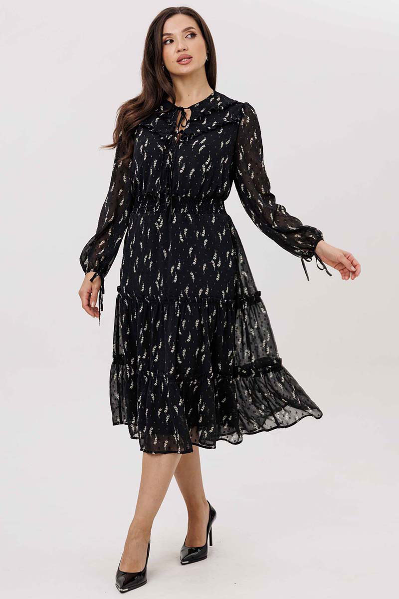 Платье женское свободного силуэта, отрезное по линии талии, расклешённое к низу, выполнено из ткани шифон. По линии талии сборка на резинку «венгерку» с отделкой рюшами. Горловина v-образная с небольшими рюшей по переду до линии талии на завязках. Передняя полочка дополнительно украшена рюшами. Рукава одно шовные втачные, по низу сборка на резинку-венгерку. Платье на тонкой трикотажной подкладке.