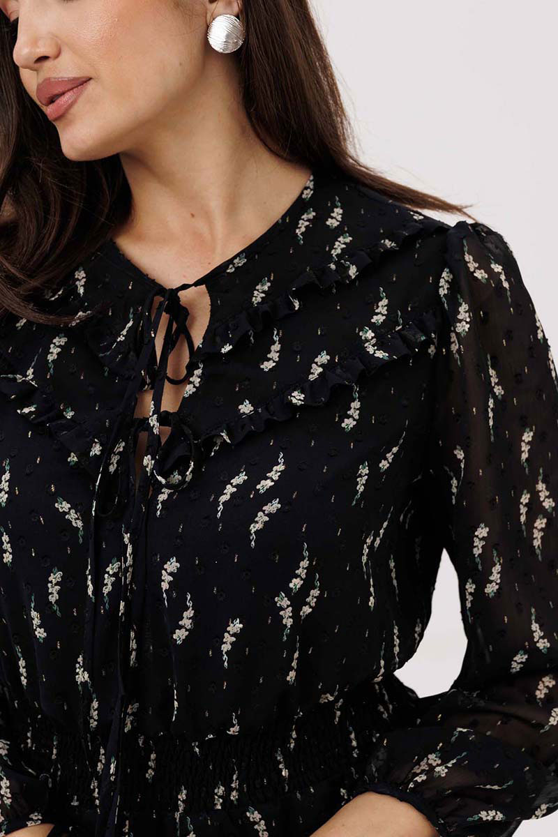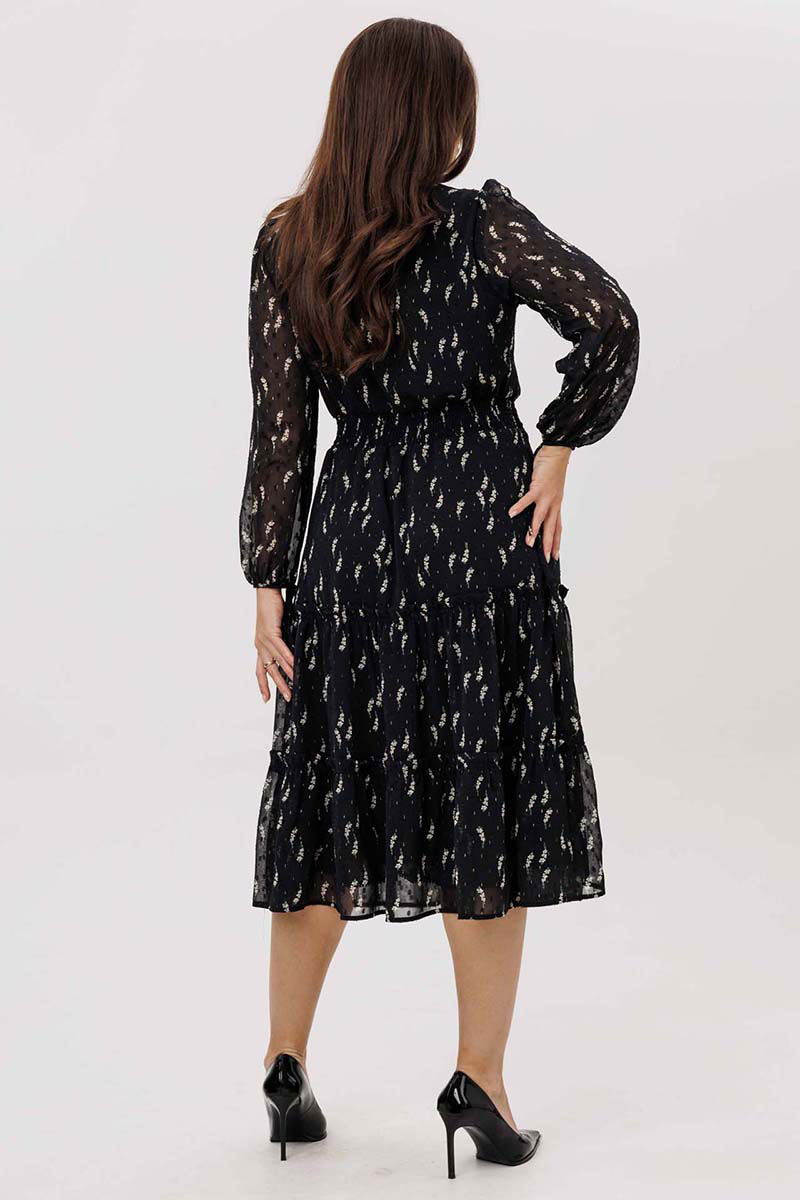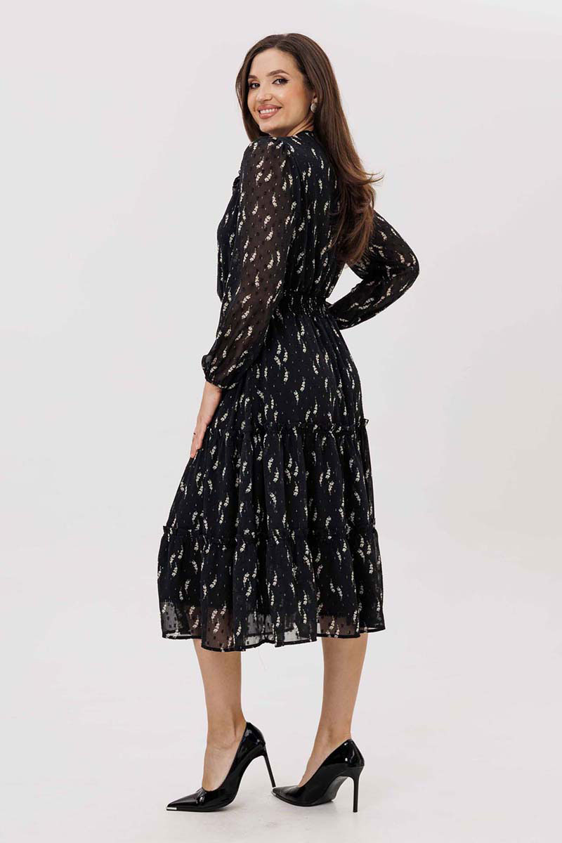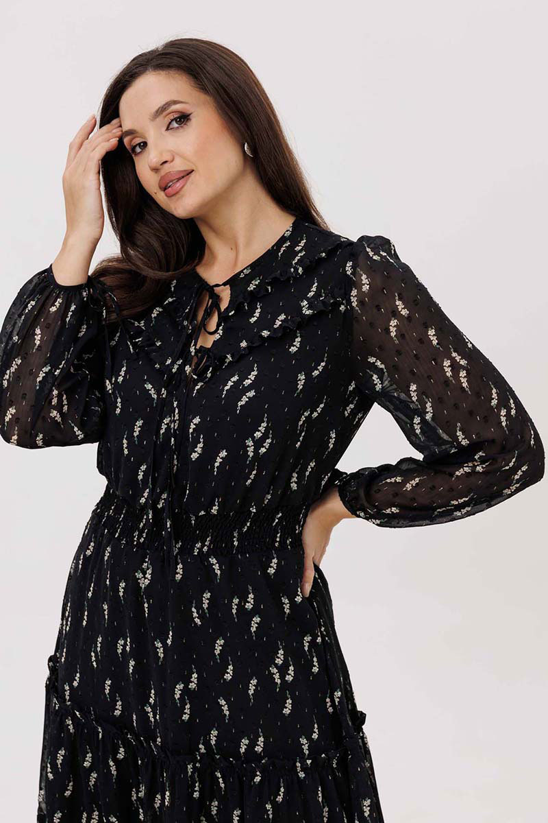 Платье женское свободного силуэта, отрезное по линии талии, расклешённое к низу, выполнено из ткани шифон. По линии талии сборка на резинку «венгерку» с отделкой рюшами. Горловина v-образная с небольшими рюшей по переду до линии талии на завязках. Передняя полочка дополнительно украшена рюшами. Рукава одно шовные втачные, по низу сборка на резинку-венгерку. Платье на тонкой трикотажной подкладке.