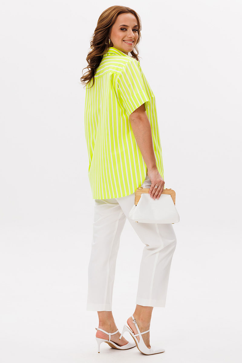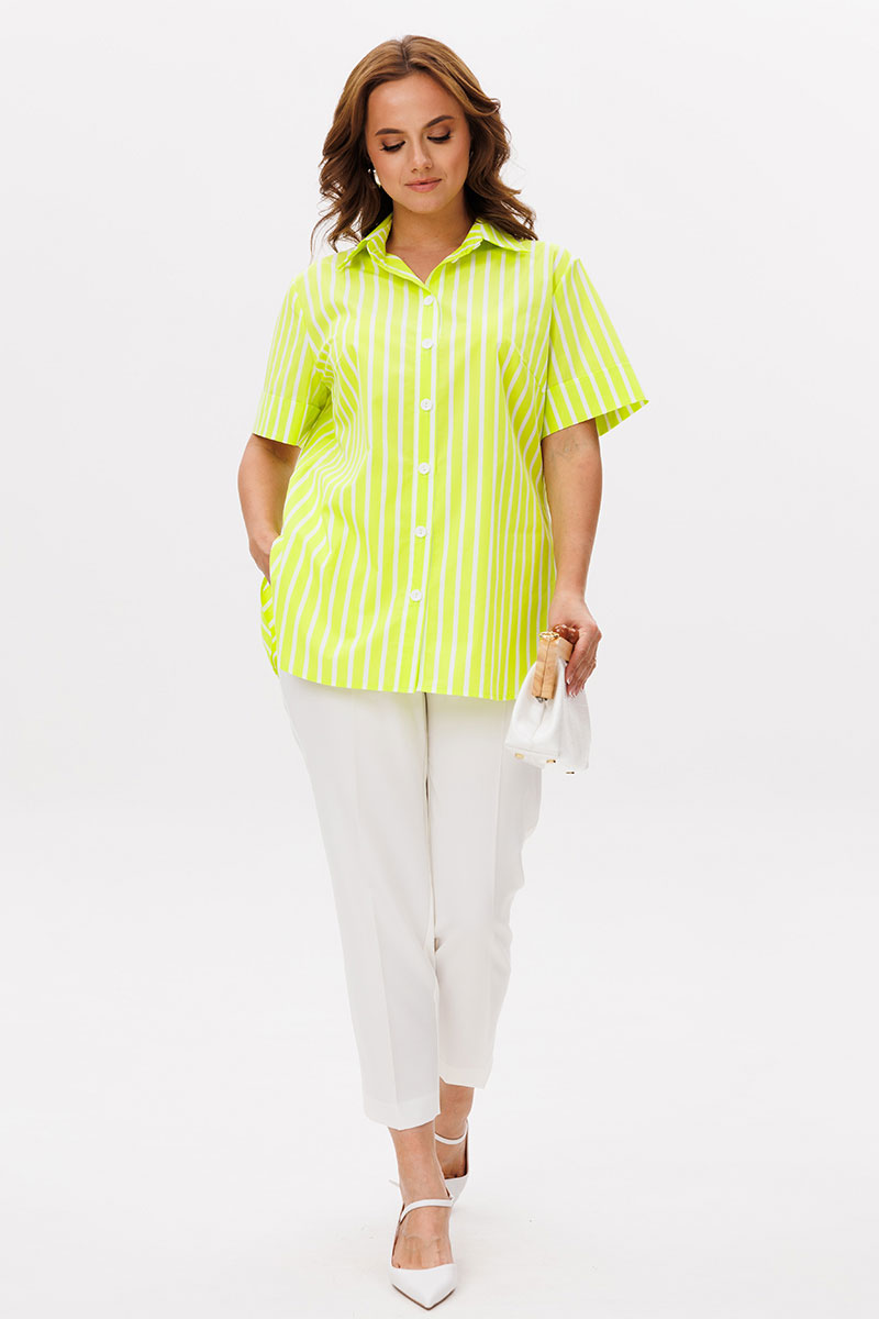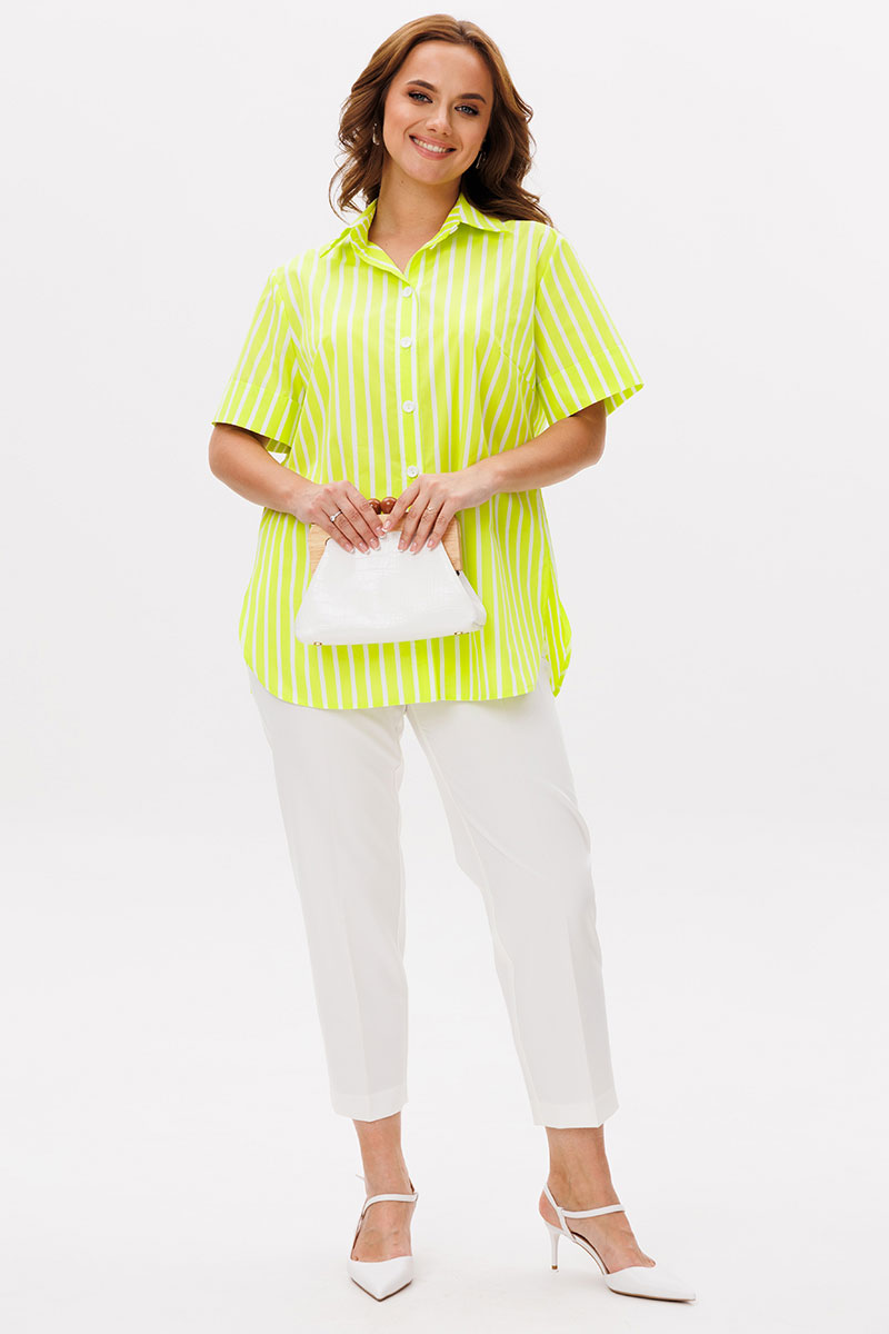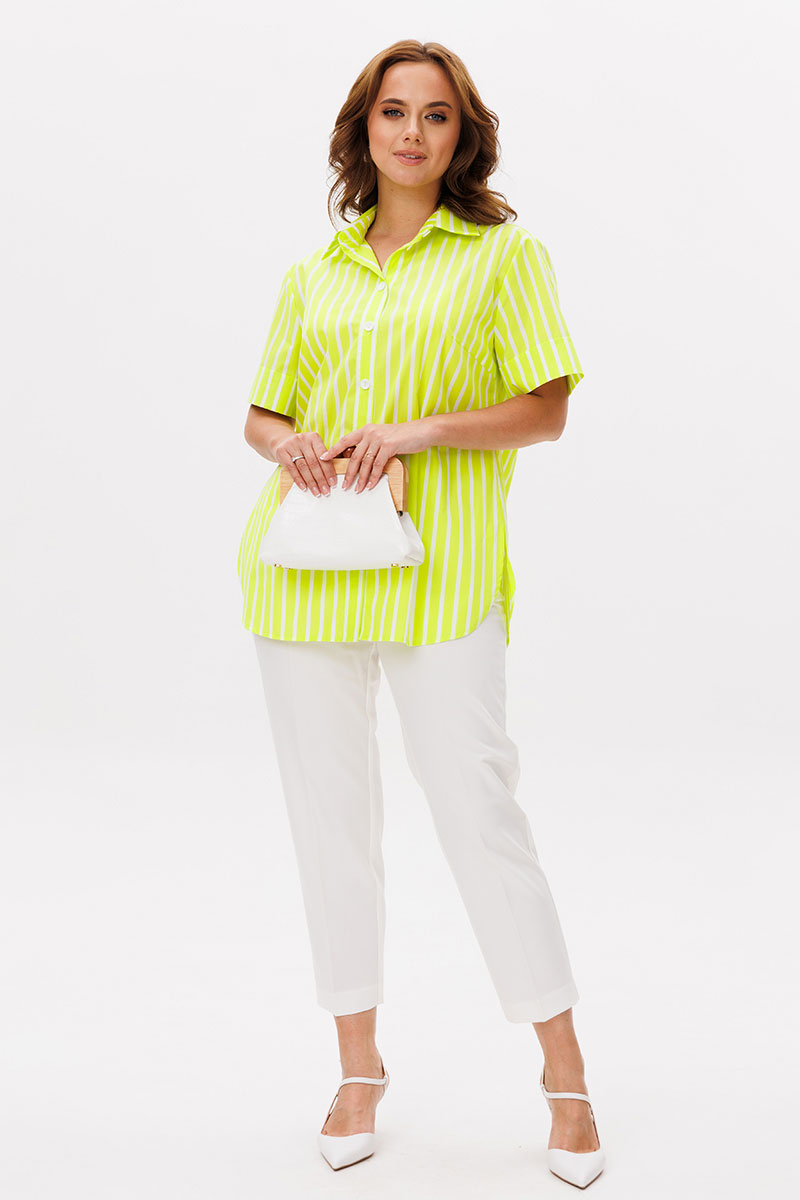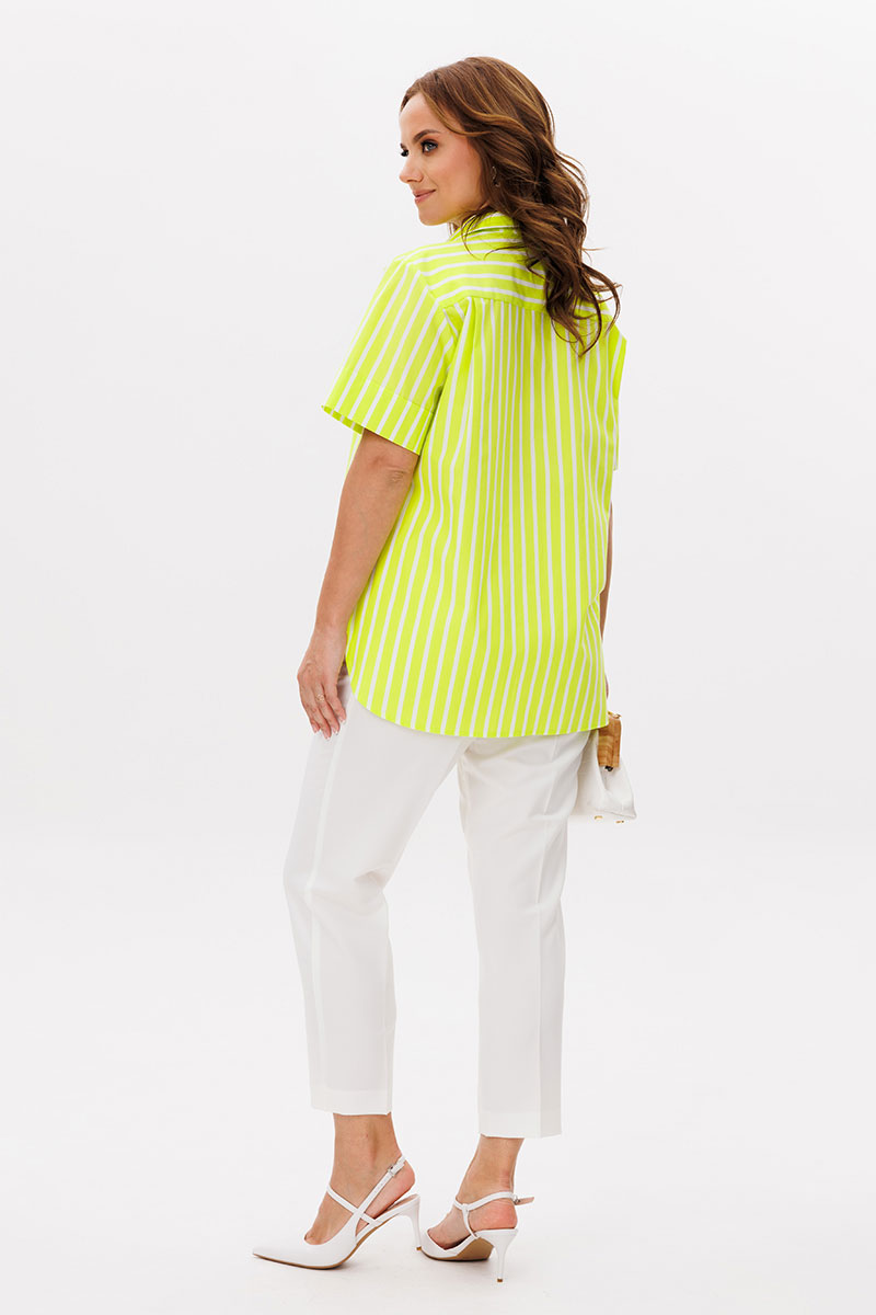Блуза свободного силуэта. Перед с нагрудными вытачками. Спинка с отрезной кокеткой и двумя складками, рукав втачной, одношовный, до локтя. Низ фигурный, с разрезами в боковых швах. Застежка центральная на петли-пуговицы. Воротник с отрезной стойкой.