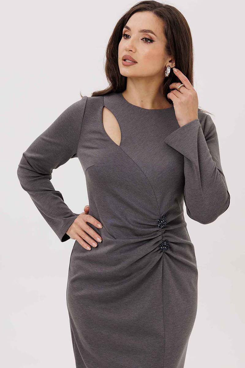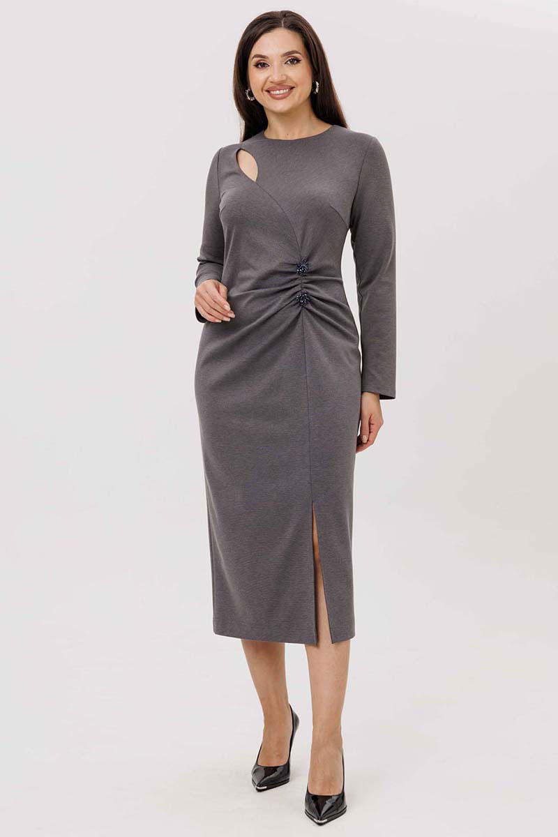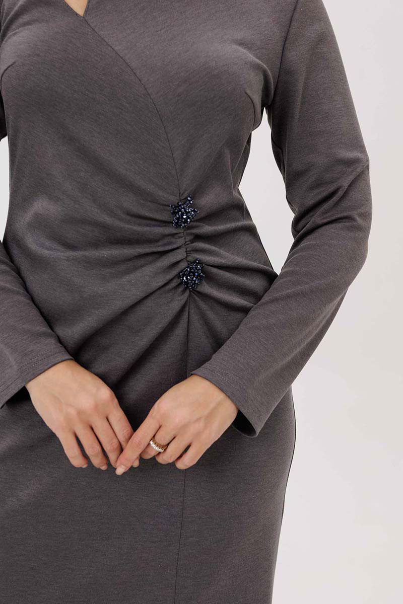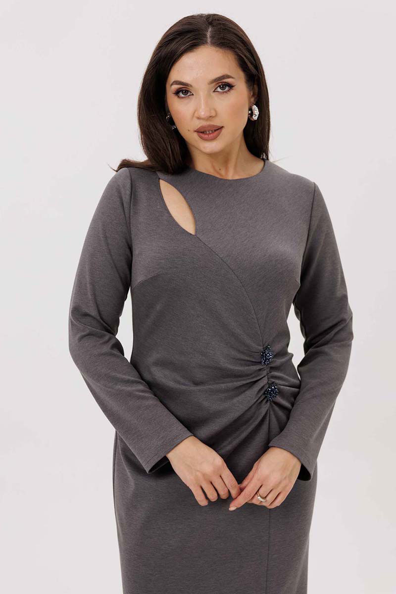 Платье полуприлегающего силуэта с ассиметричным фигурным подрезом, в верху которого расположен фиругрый вырез. Подрез заканчивается разрезом. В середине подреза сборка. По переду нагрудные вытачки. Спинка со средним швом, в который вставлена тесьма-молния. По спинке талиевые вытачки. Рукав одношовный, втачной. Горловина на обтачке. Дополняют модель пришитые декоративные броши.