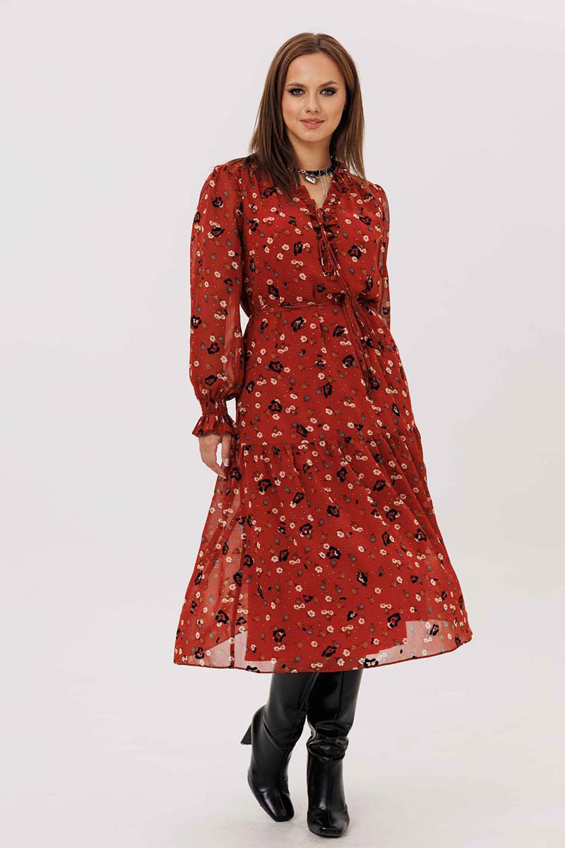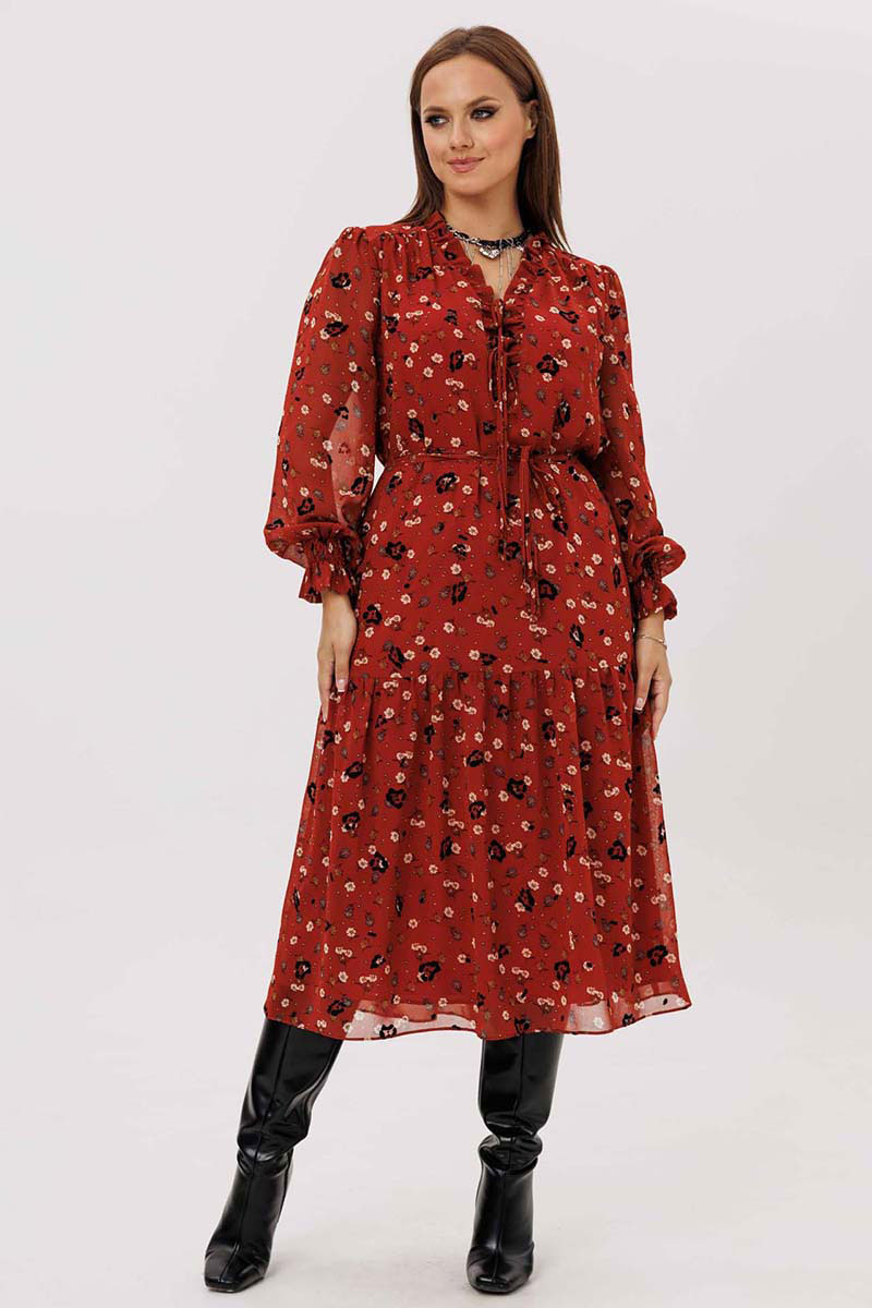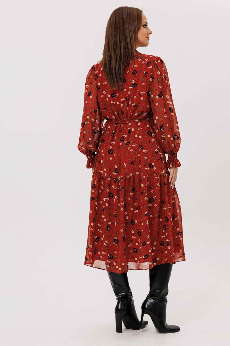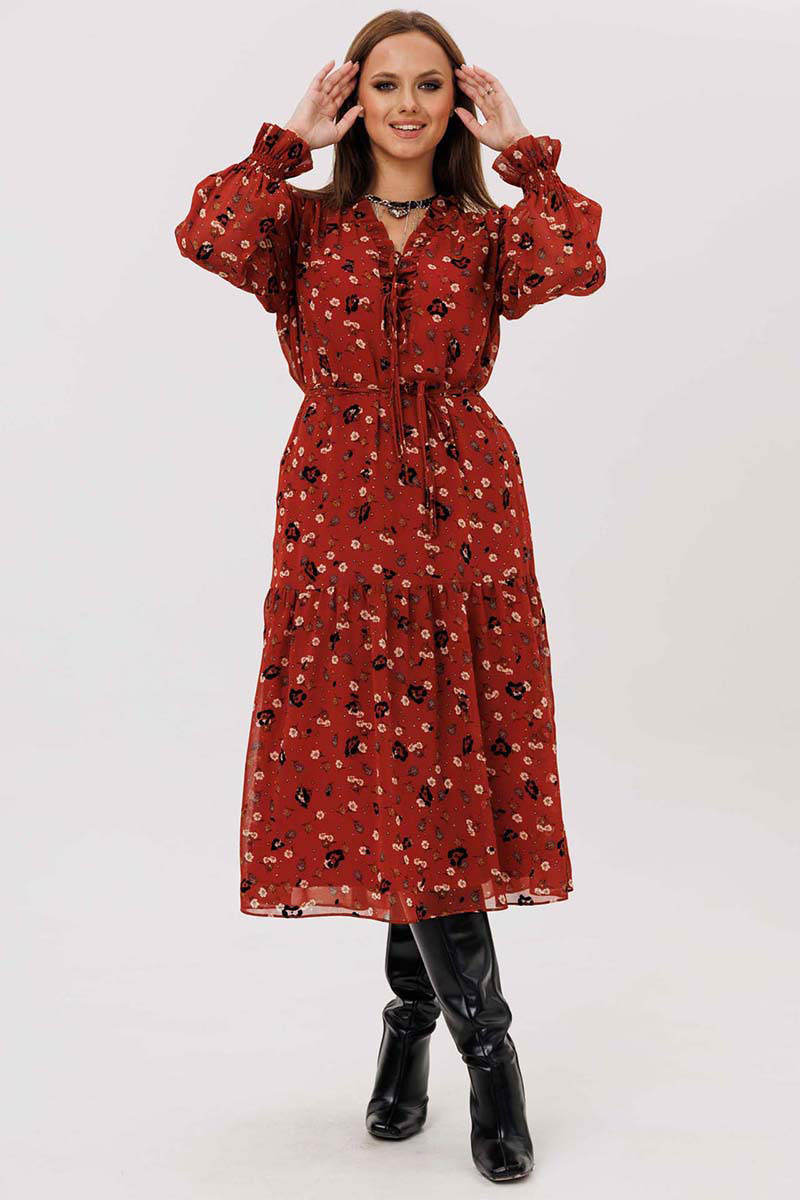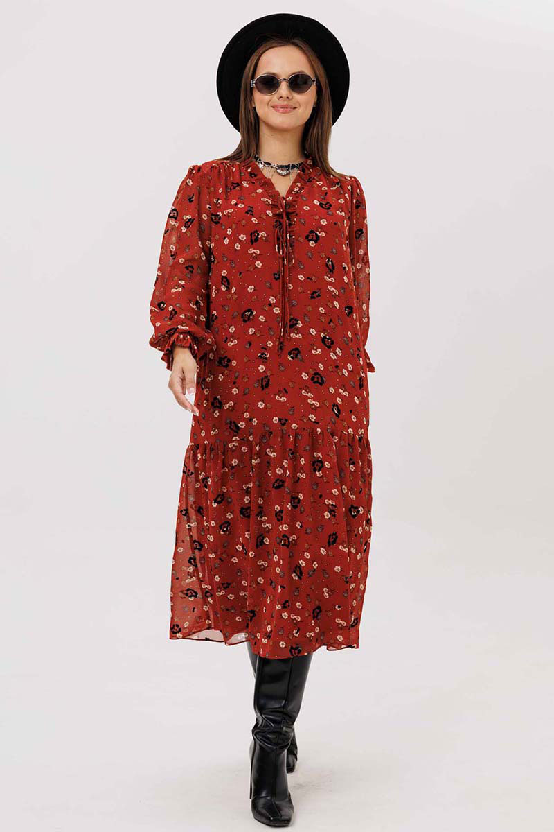 Платье свободного силуэта с подрезом ниже линии бедер. Перед с кокеткой. Горловина обработана рюшей и завязками. Рукав одношовный, заканчивающийся манжетой на венгерке. По окату рукава сборка. Платье на подкладке. Дополняет модель пояс.