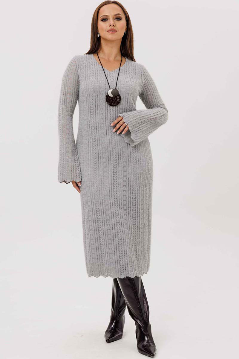Платье трикотажное на подкладке. Платье выполнено из трикотажного полотна с ажурным (кружевным) рисунком. Полотно средней плотности, эластичное, с мягким прилеганием по фигуре. Изделие полуприлегающего силуэта, длиной миди, с V-образным вырезом горловины и длинным втачным рукавом. Низ рукавов и низа изделия обработан фигурным краем полотна, что придаёт модели завершённый декоративный акцент. Для комфортной посадки предусмотрена трикотажная подкладка по всей длине изделия.