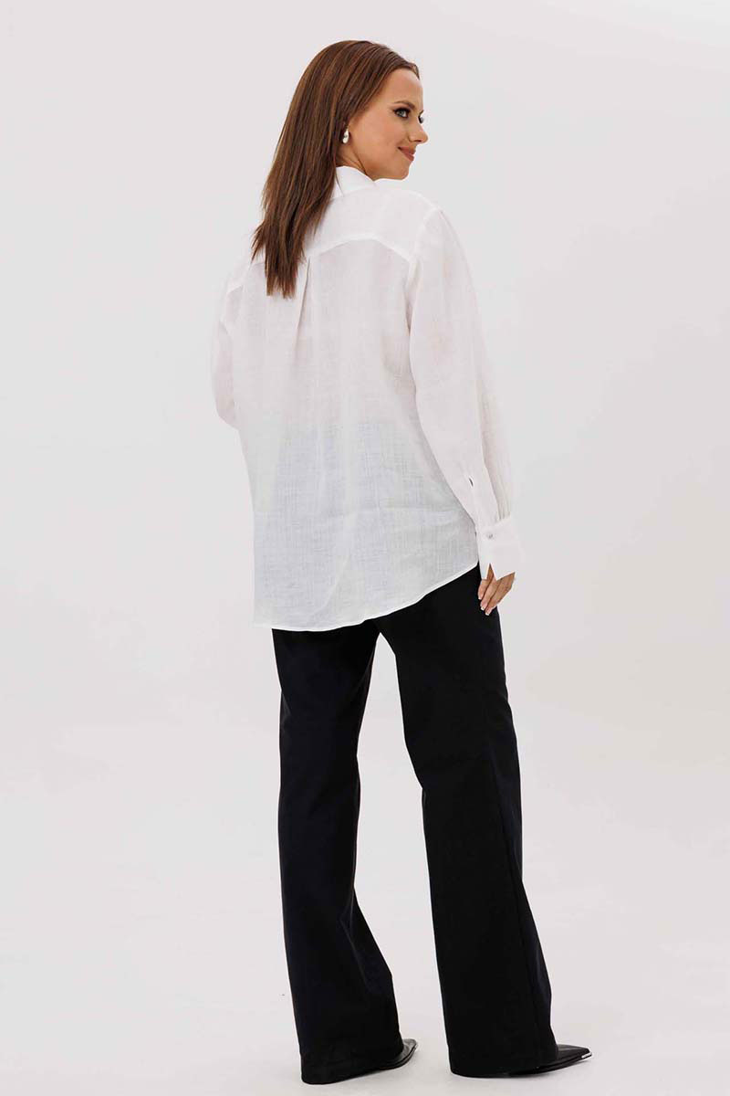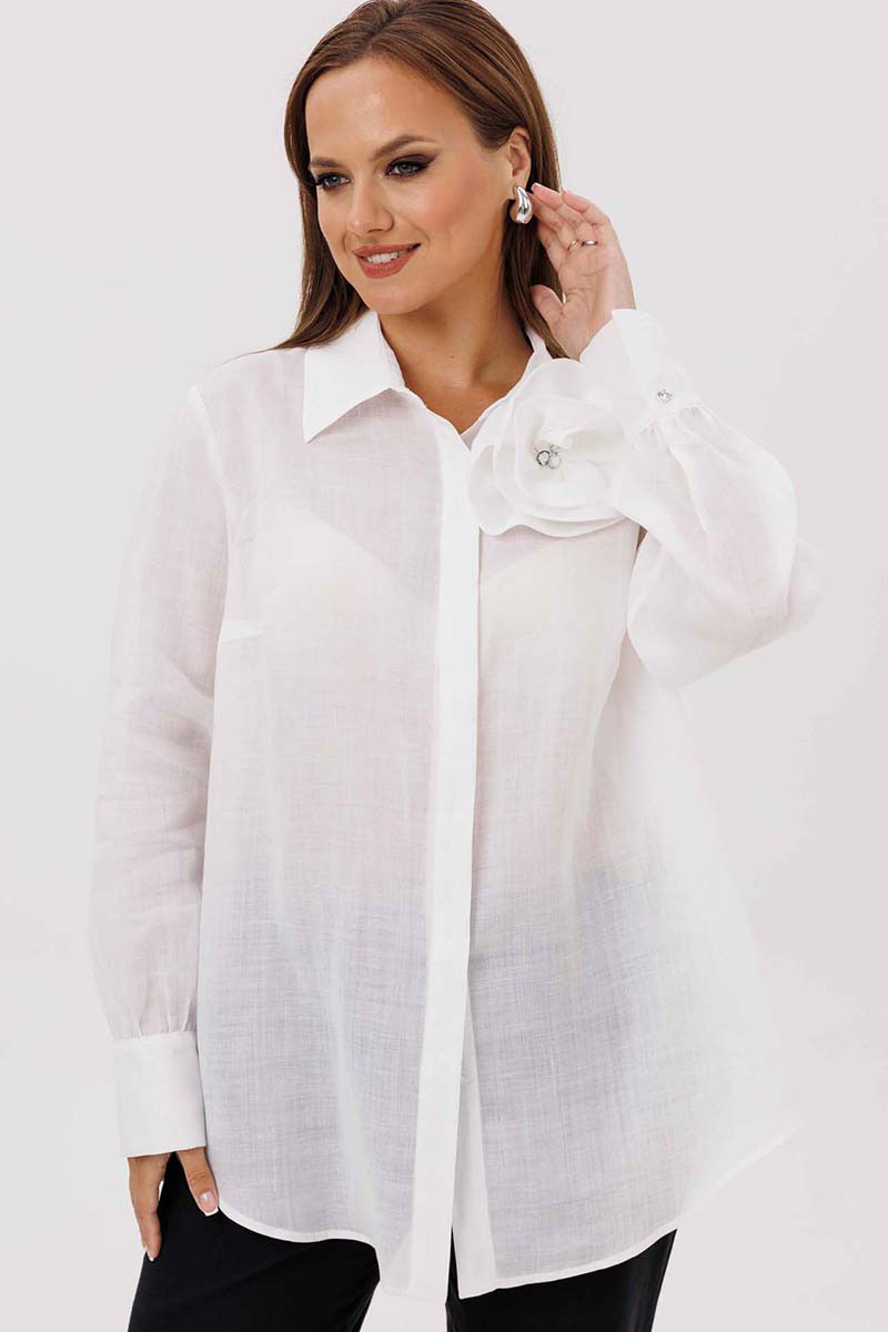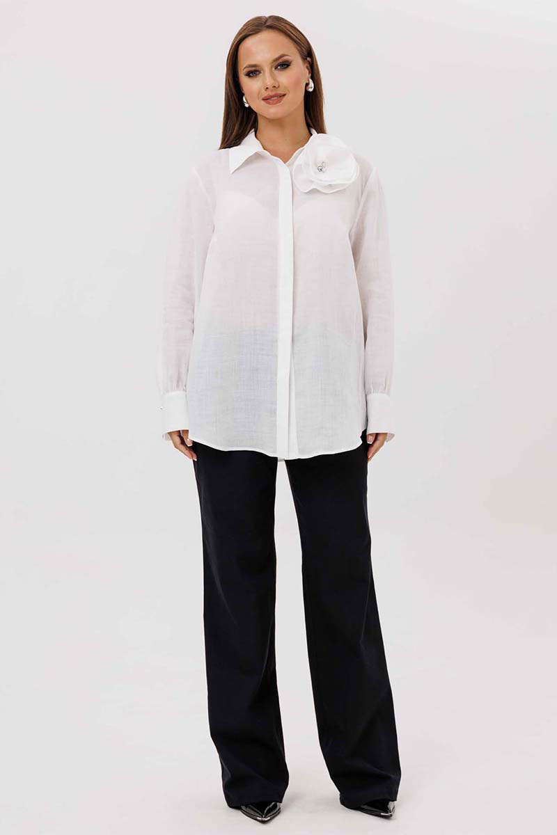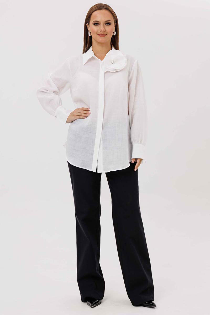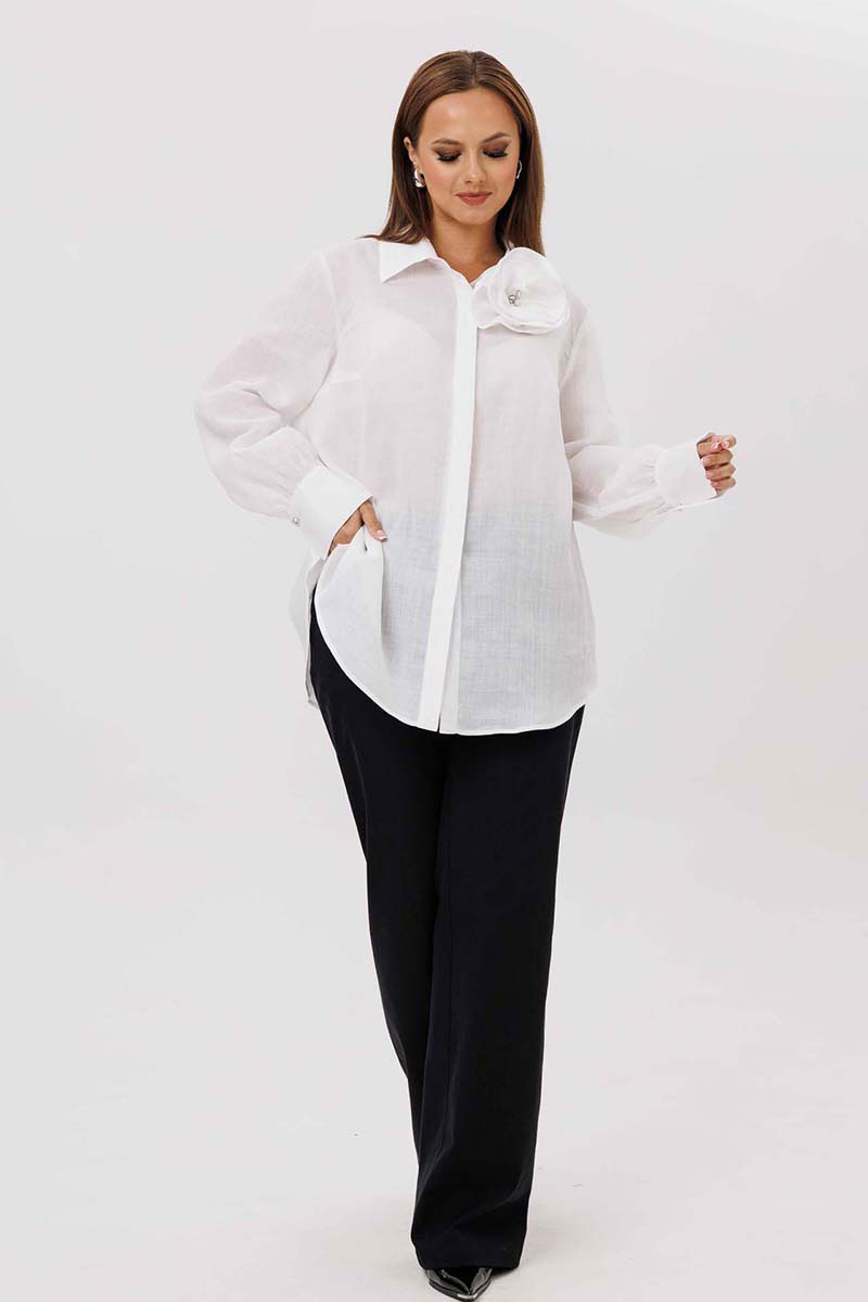 Блуза женская, прямого силуэта с потайной застежкой. Перед с нагрудными вытачками. Спинка с отрезной кокеткой. Воротник рубашечного типа, с отрезной стойкой. Рукав тачной, одношовный, с манжетой по низу. Низ фигурный. Дополняет модель декоративный цветок (съемный, пуговица).