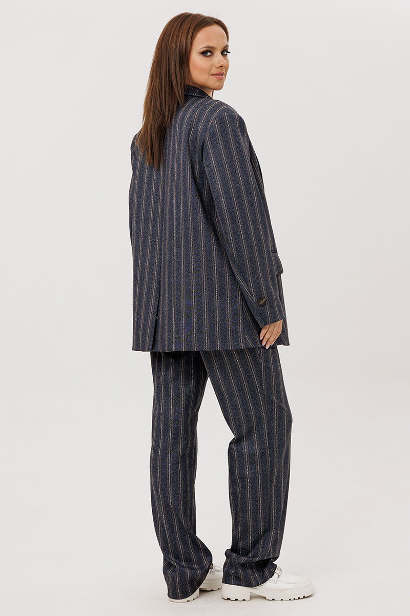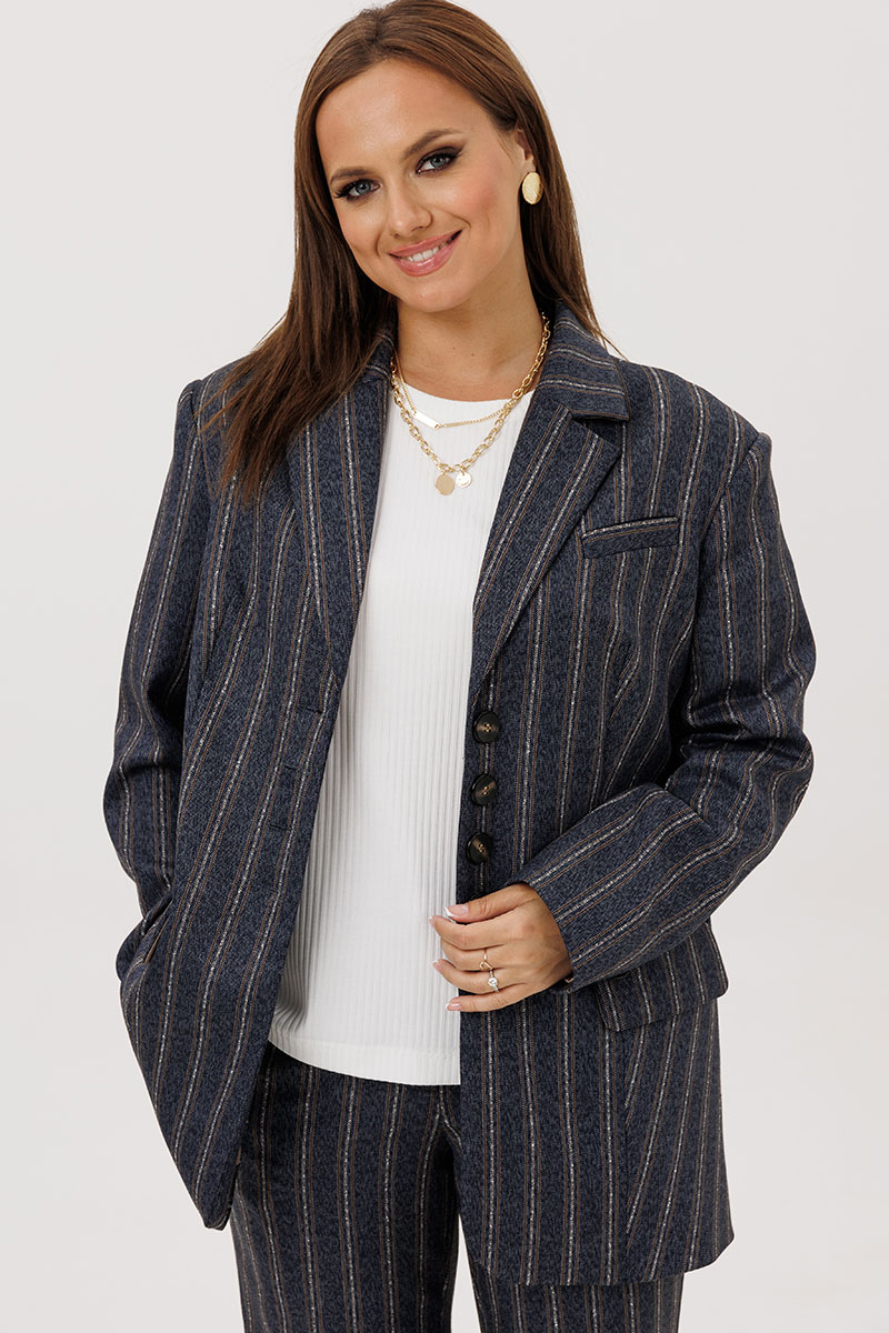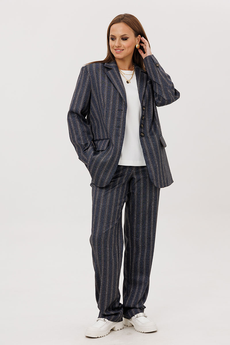 Жакет полуприлегающего силуэта удлинённый, с центральной застёжкой на две прорезные петли и пуговицы. Перёд жакета с талевыми вытачками и прорезными карманами с клапанами. Лацканы классической формы. Спинка со средним швом и шлицей с разрезом. Рукава втачные двух шовные, по низу декоративная отделка. Жакет на подкладке.