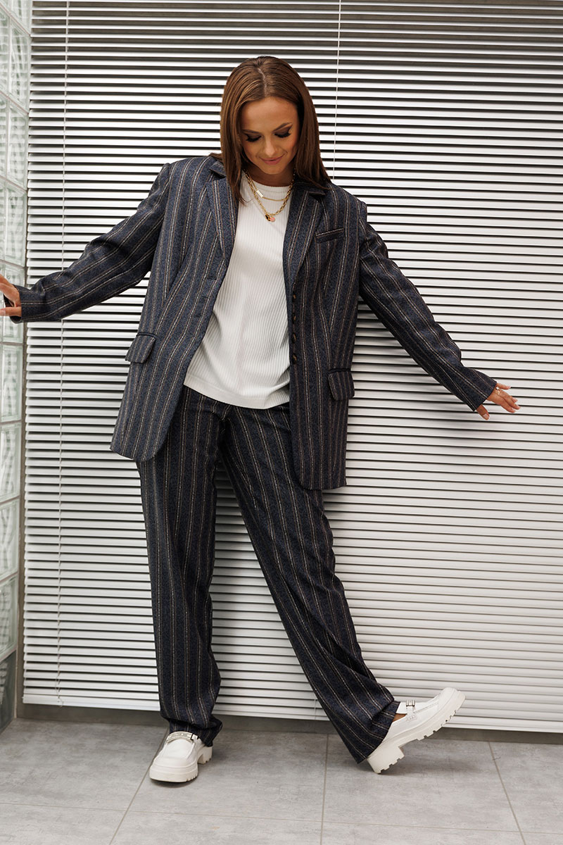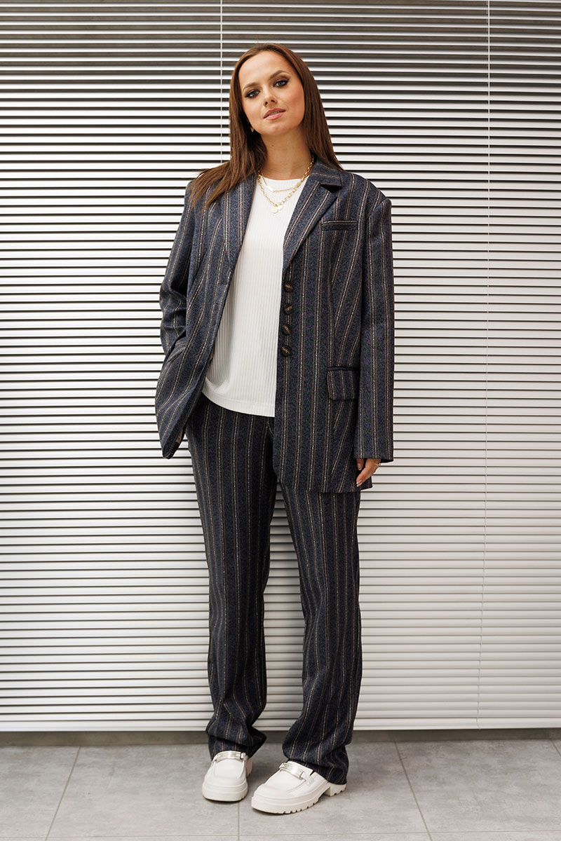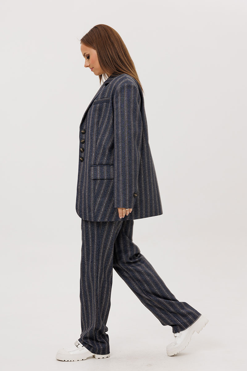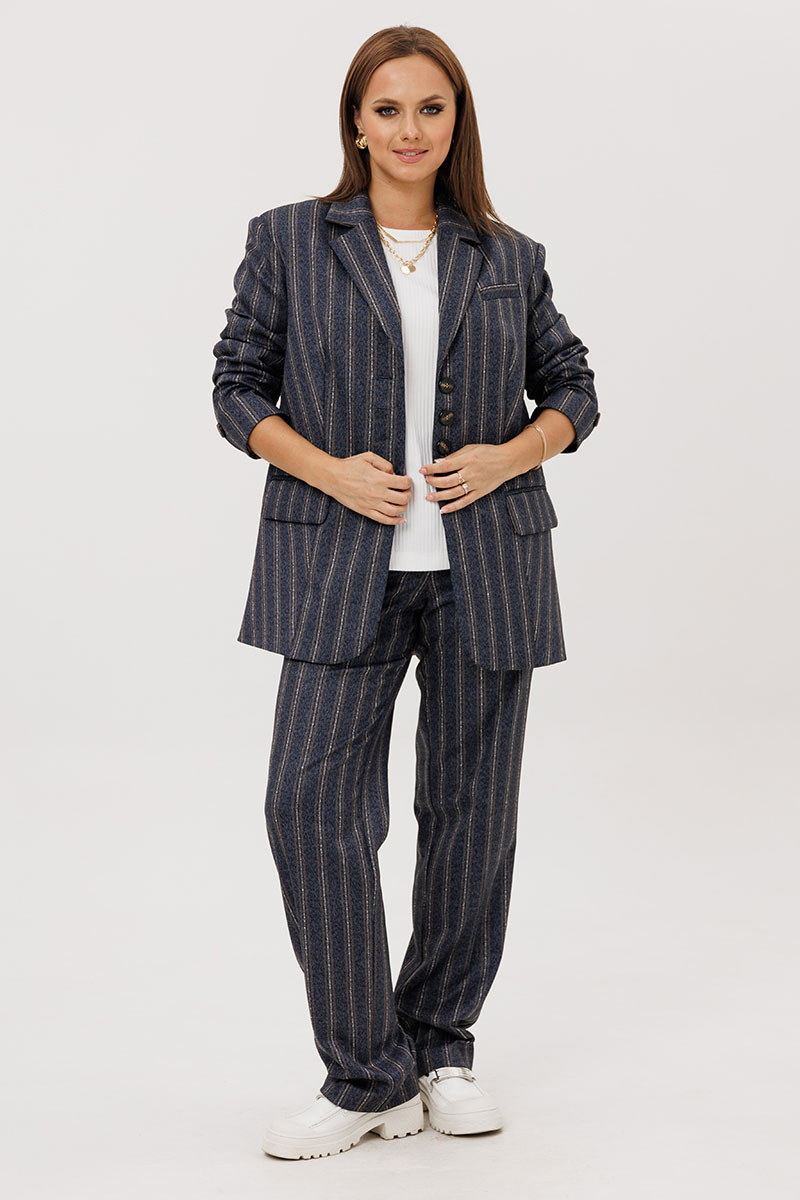 Жакет полуприлегающего силуэта удлинённый, с центральной застёжкой на две прорезные петли и пуговицы. Перёд жакета с талевыми вытачками и прорезными карманами с клапанами. Лацканы классической формы. Спинка со средним швом и шлицей с разрезом. Рукава втачные двух шовные, по низу декоративная отделка. Жакет на подкладке.