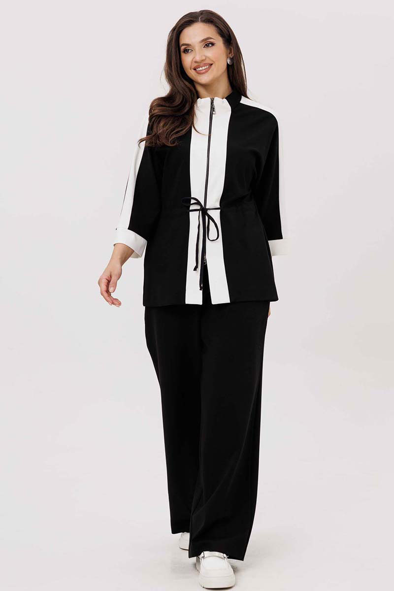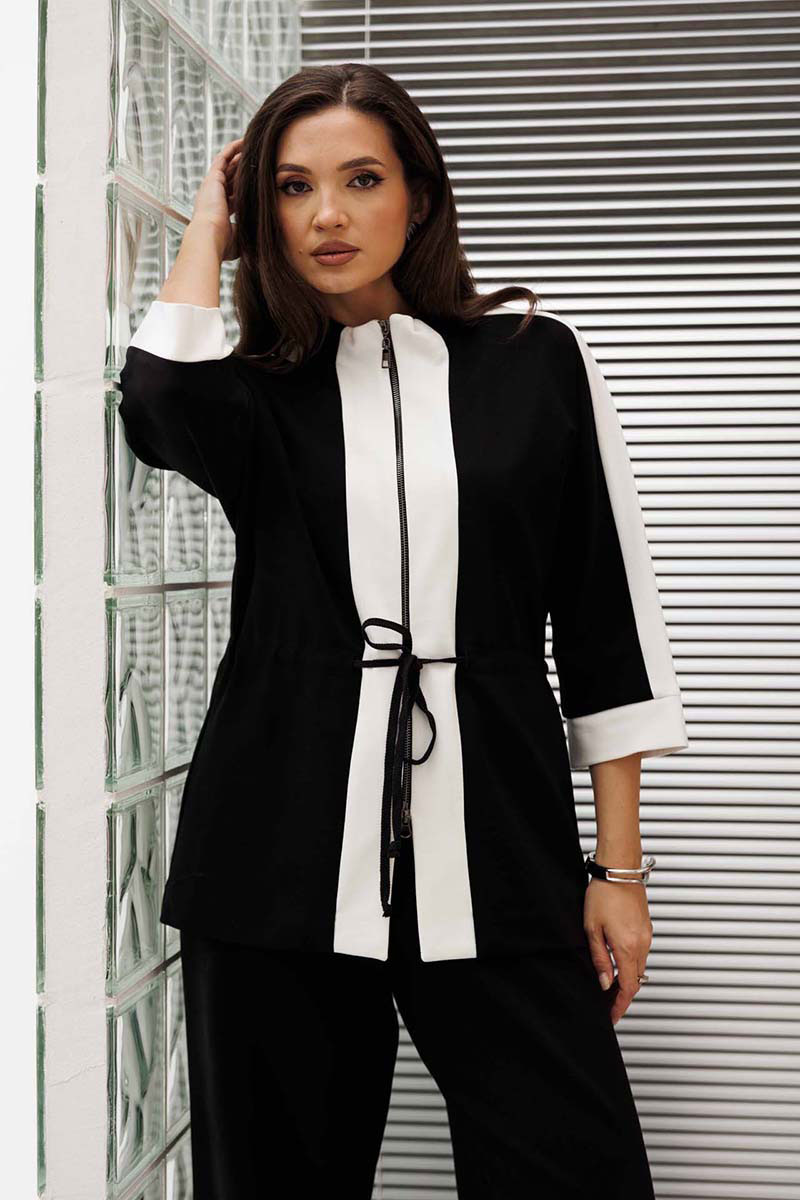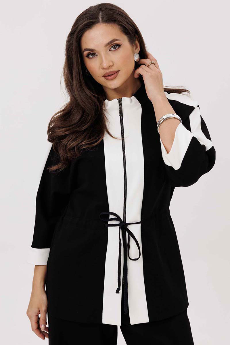 Жакет прямого силуэта, с застежкой на декоративную тесьму-молнию по центру. На талии кулиса на завязке. Рукав «Летучая мышь», низ рукава обработан притачной манжетой. По верху рукава и центру переда контрастные вставки. Жакет без подкладки.