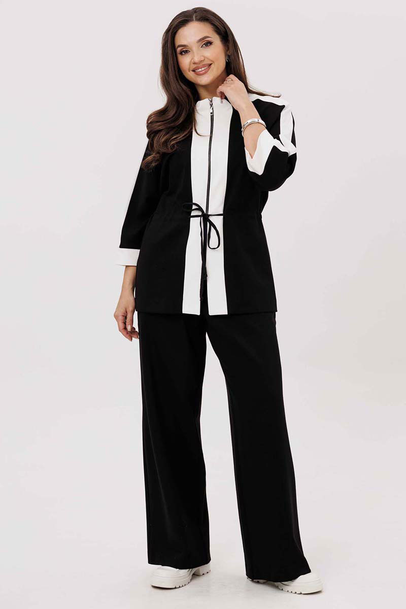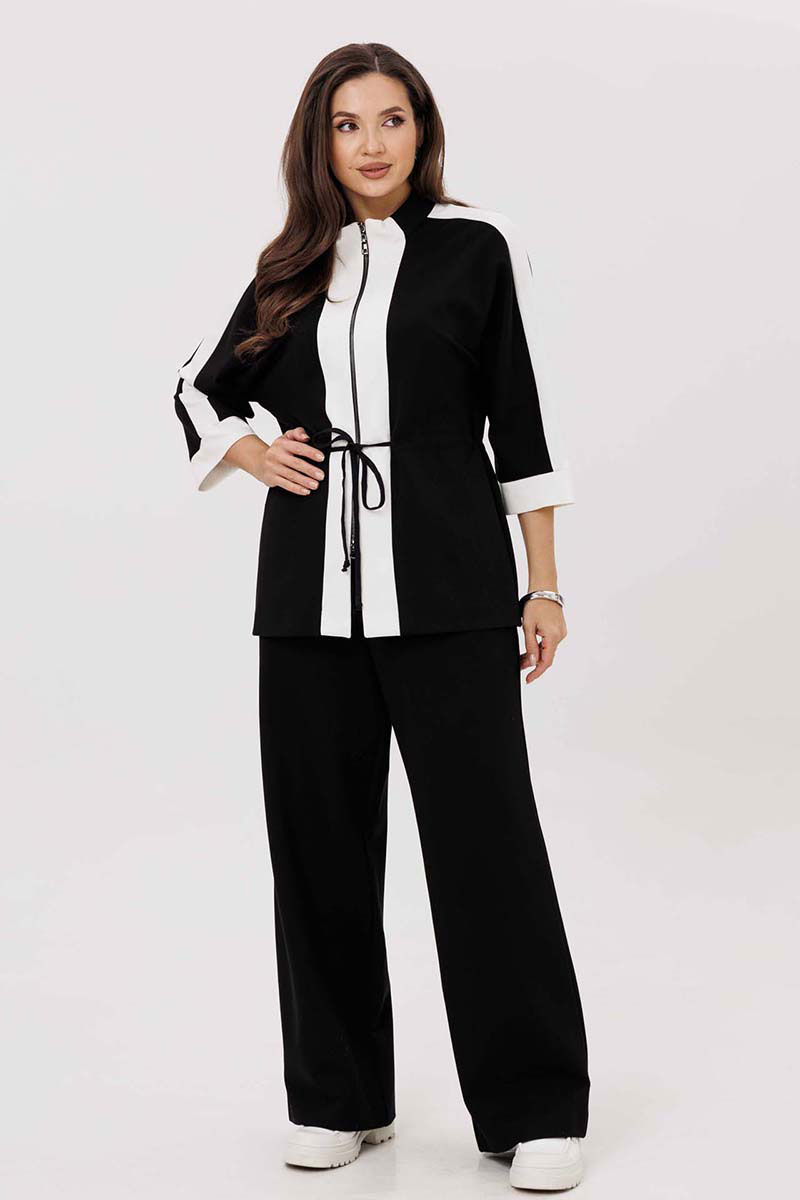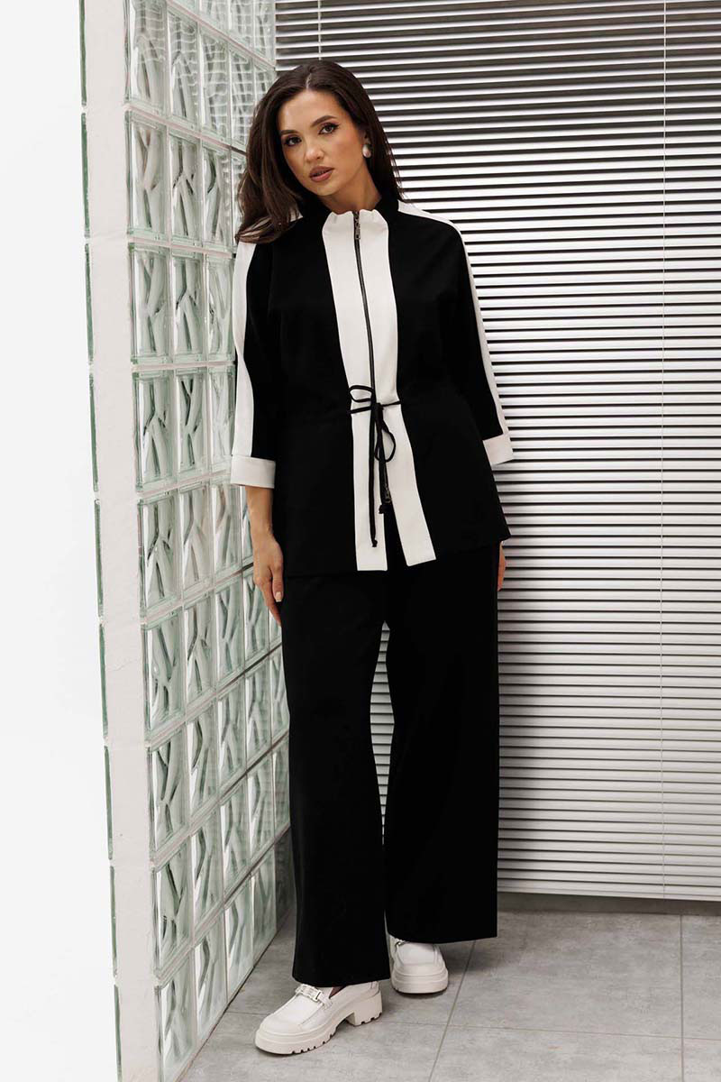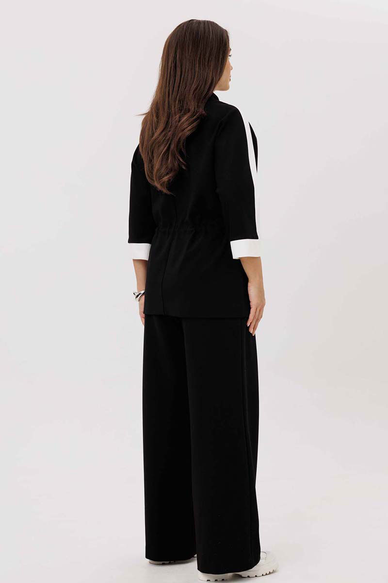 Жакет прямого силуэта, с застежкой на декоративную тесьму-молнию по центру. На талии кулиса на завязке. Рукав «Летучая мышь», низ рукава обработан притачной манжетой. По верху рукава и центру переда контрастные вставки. Жакет без подкладки.