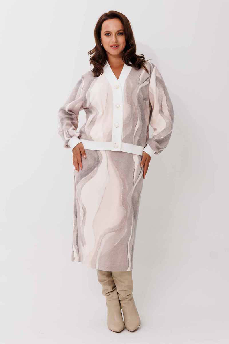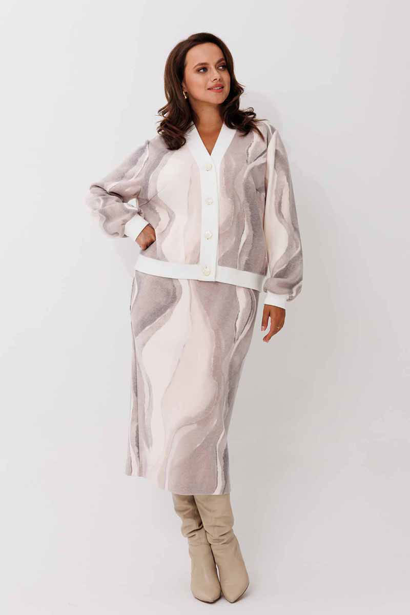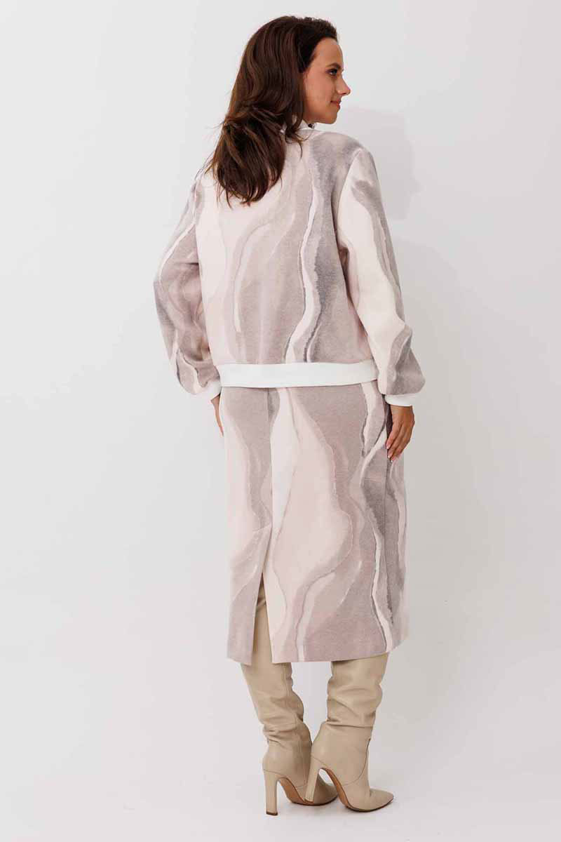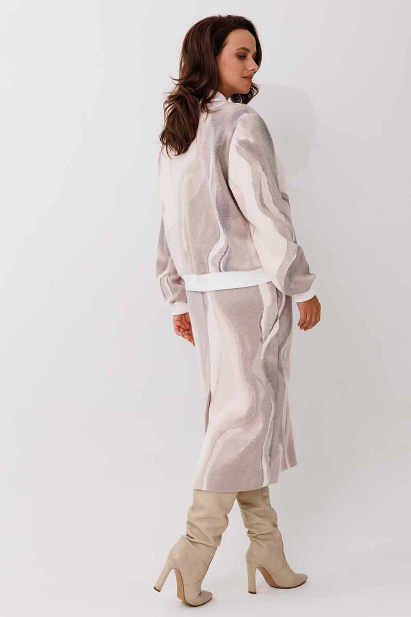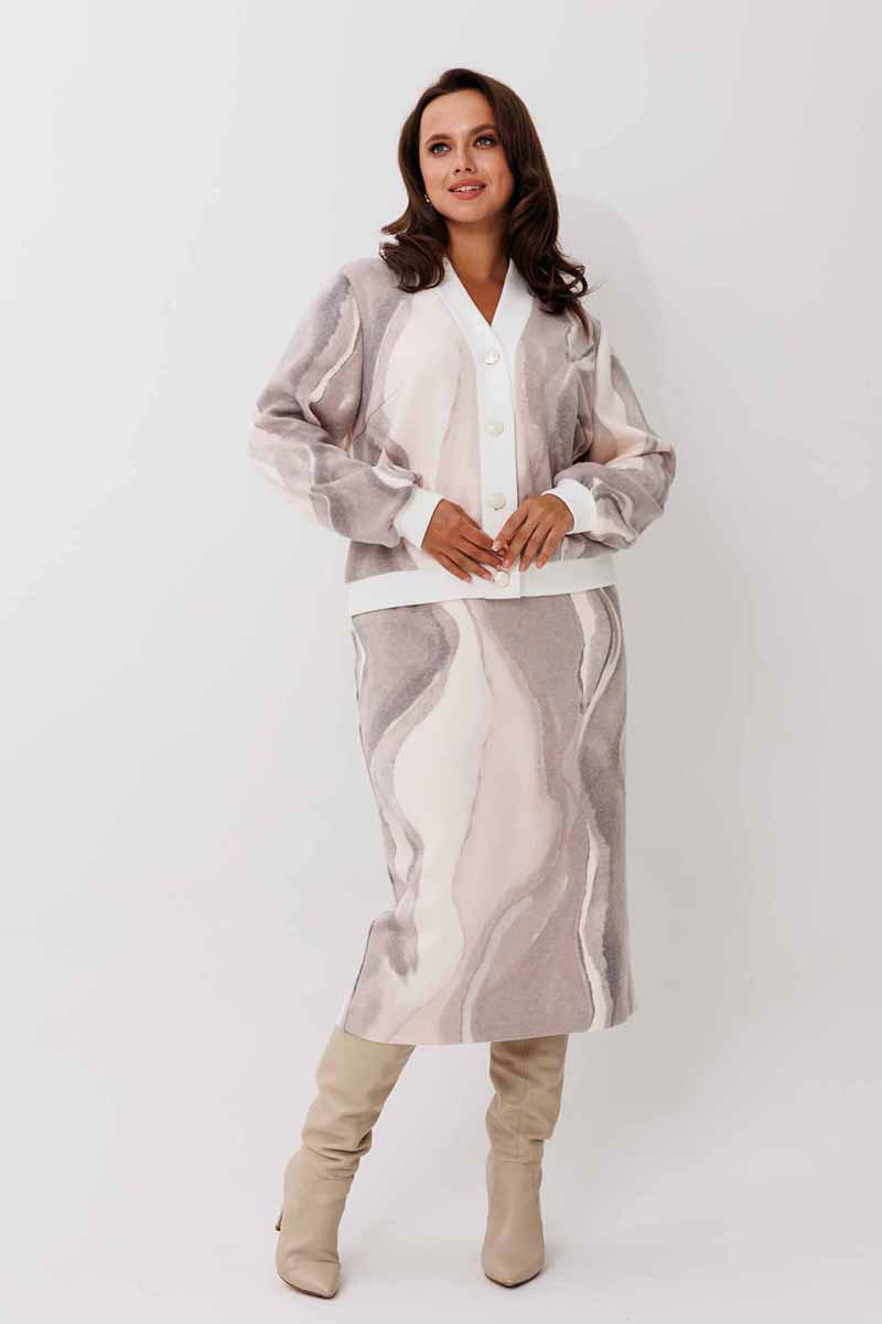 Костюм женский трикотажный (жакет + юбка). Костюм выполнен из мягкого трикотажного полотна с оригинальным принтом в плавных пастельных тонах. Комплект состоит из жакета и юбки