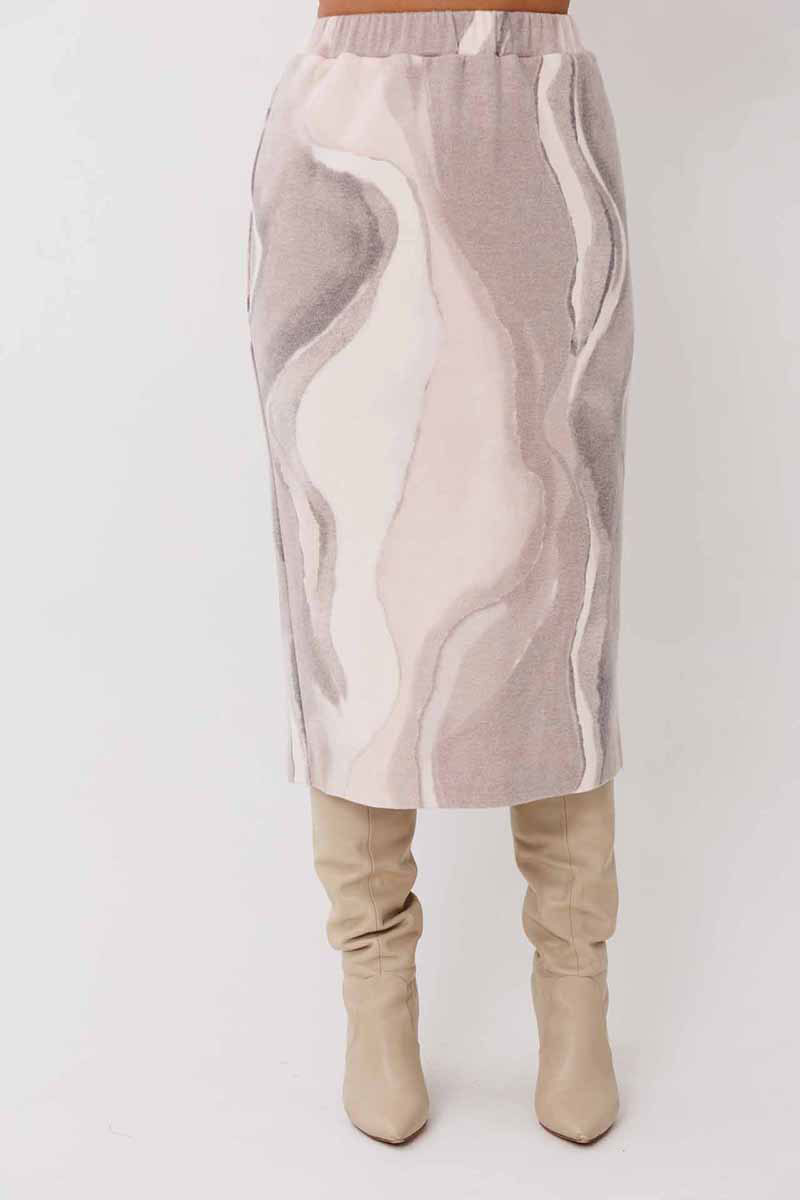 Юбка — прямого кроя, на подкладке, на эластичном поясе, без застёжки. Длина — миди. Полотно мягко облегает фигуру, сохраняя комфорт при движении. Трикотажное полотно средней плотности, эластичное, не деформируется в носке.