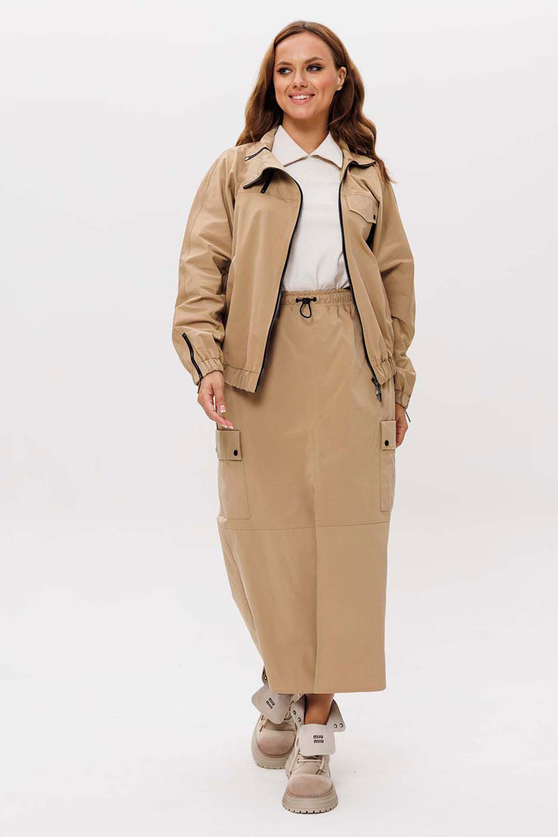 Костюм женский состоит из жакета и юбки выполнены из плащевой ткани. Жакет свободный с цельнокроеными рукавами, без подкладки, по низу притачная планка, в которую продета резинка. По переду горизонтальный подрез, прорезные карманы с листочкой , клапан с кнопкой, молния и застёжка на тесьму молния. Воротник стойка. По низу рукава резинка и застёжка небольшая молния. Юбка прямого силуэта на притачном поясе на резинке с фиксирующей затяжкой. По переду центральный шов заканчивается разрезом. Горизонтальный подрез по переду и спинке. По бокам большие накладные карманы с клапанами на кнопках. Юбка на подкладке.