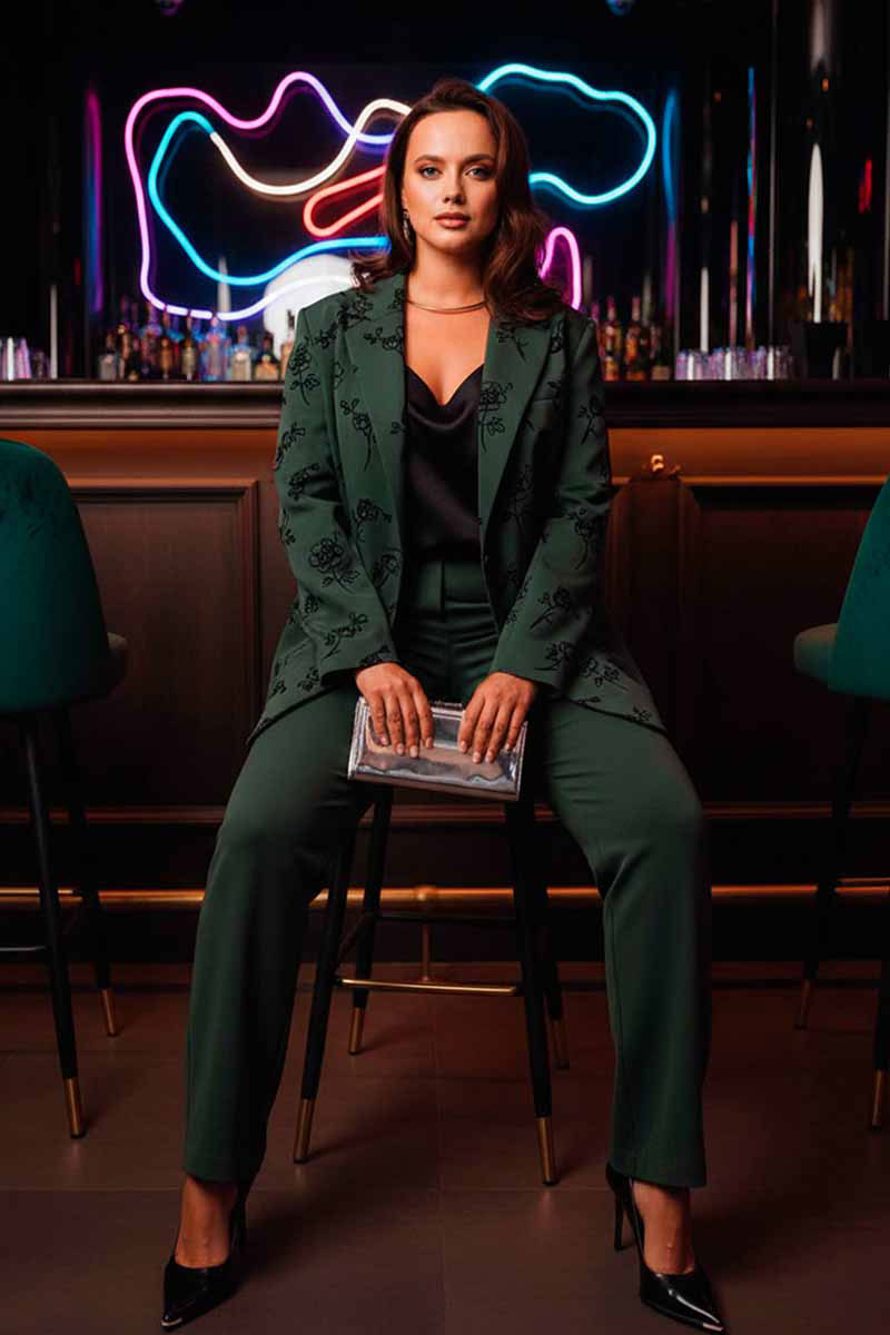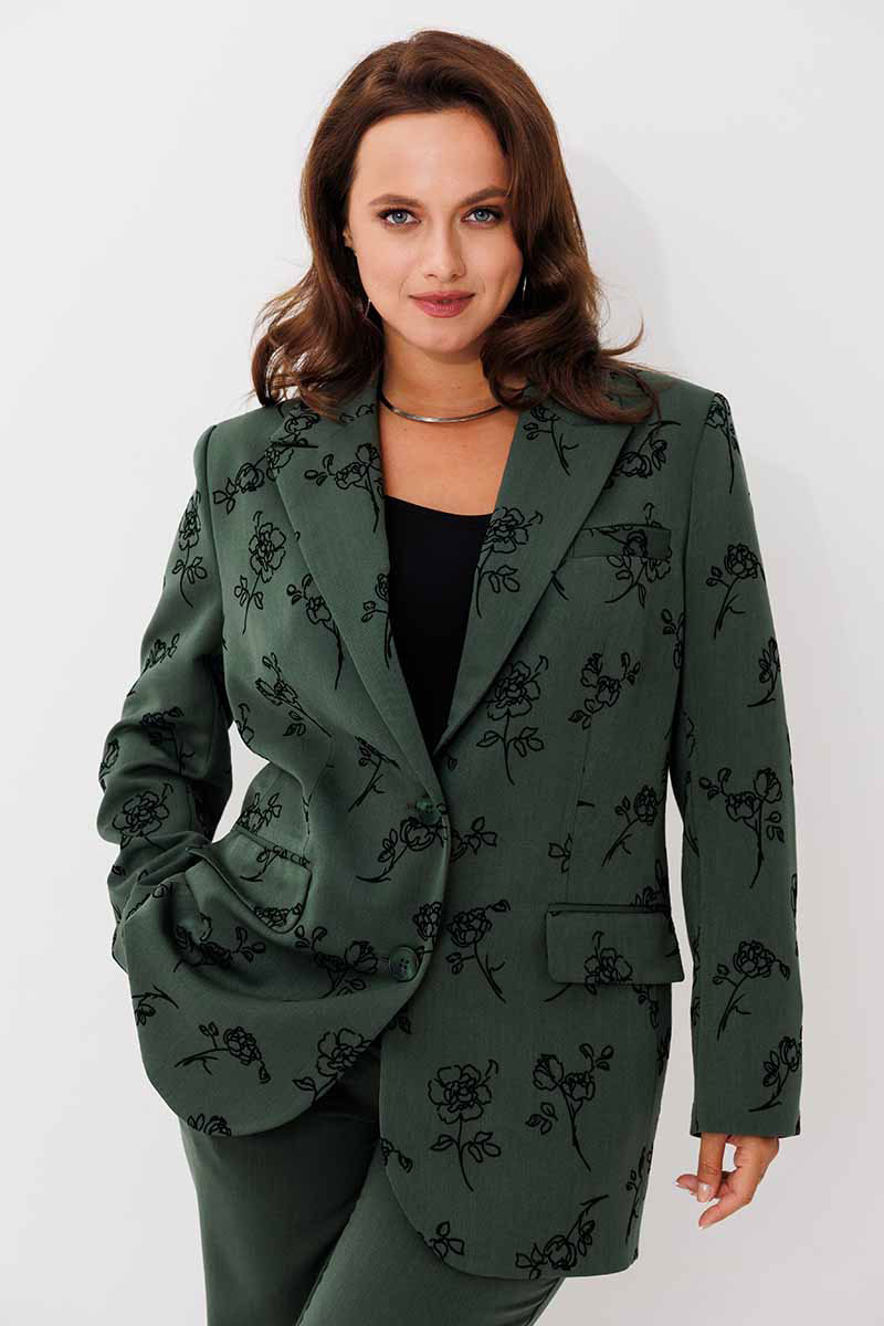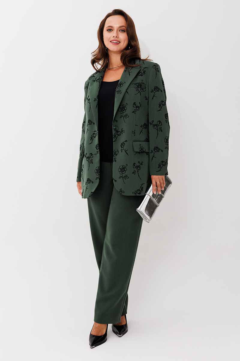 Элегантный женский костюм, состоящий из жакета и прямых брюк, выполнен из костюмной ткани с флоковым напылением — материал стабилизирован, не растягивается и отлично держит форму.