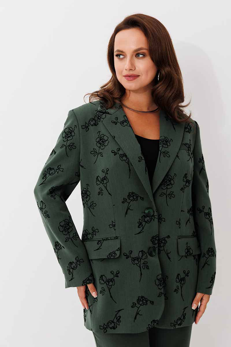 Жакет однобортный, на петлях и пуговицах, с английским воротником и клапанами по бокам. Рукав втачной, длина — полная. Посадка свободная, что обеспечивает комфорт и стильный силуэт.