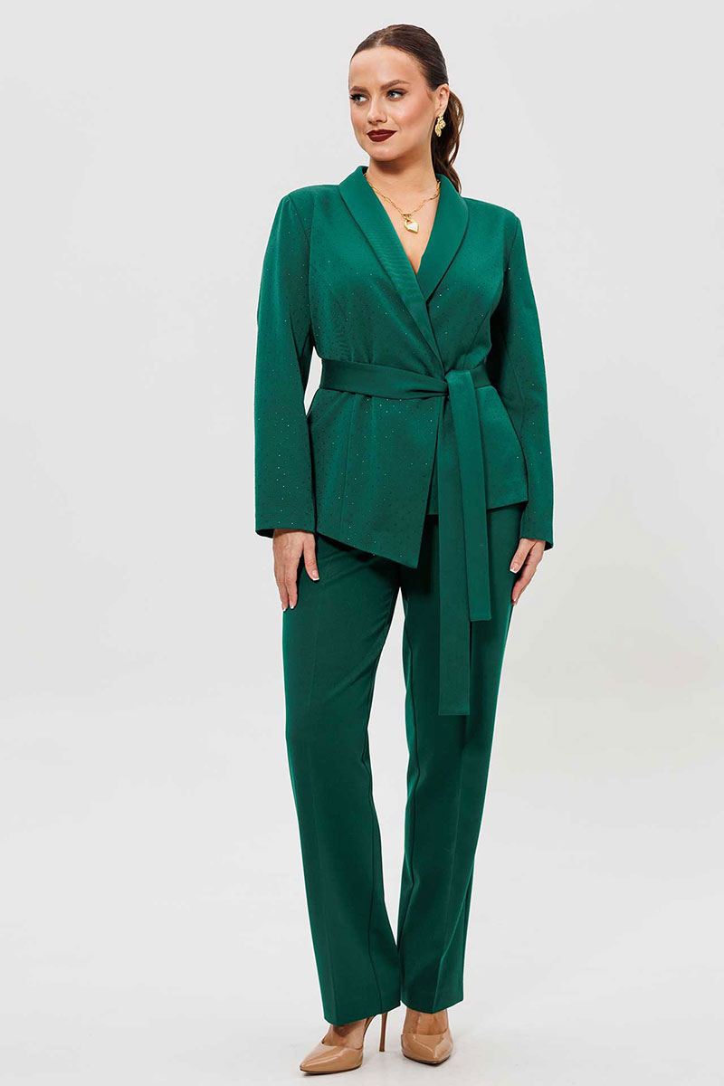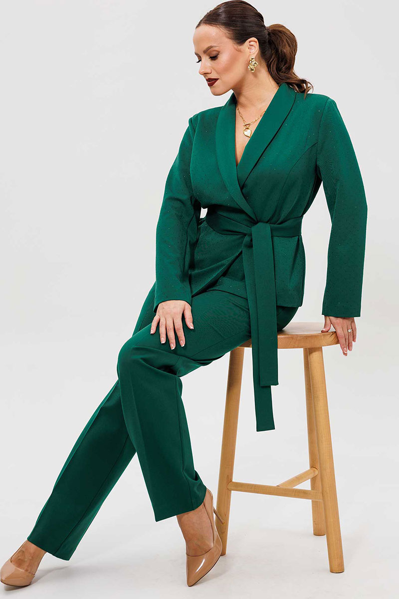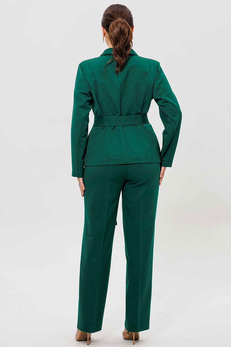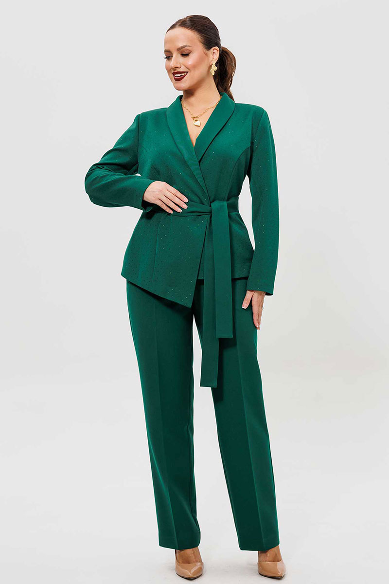 Элегантный женский костюм из зеленой костюмной ткани — идеальный выбор для тех, кто ценит комфорт и стиль в повседневной жизни. Женский брючный костюм, состоящий из жакета и брюк.