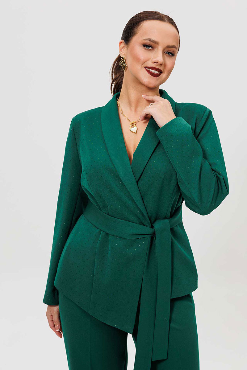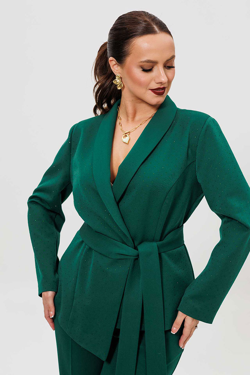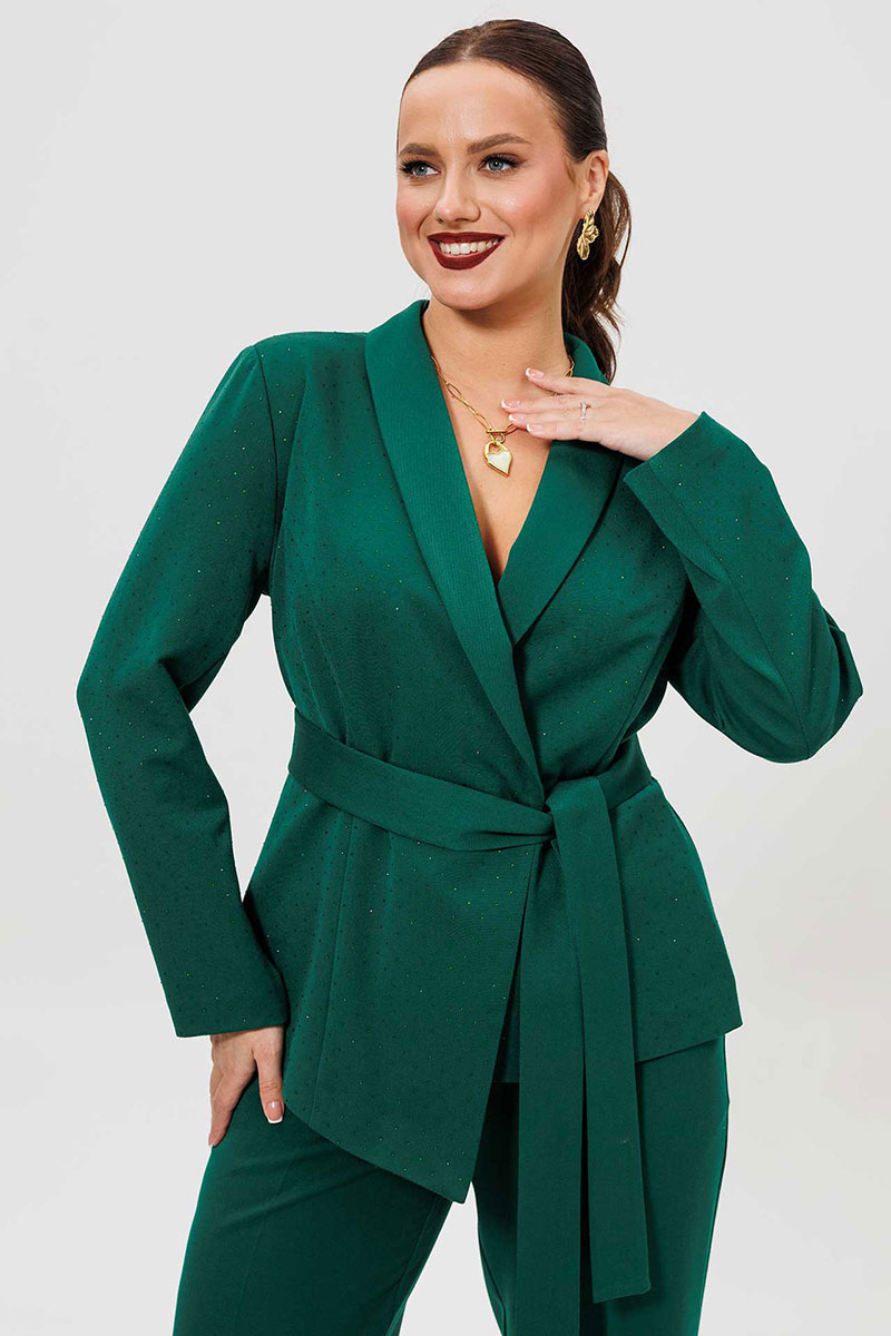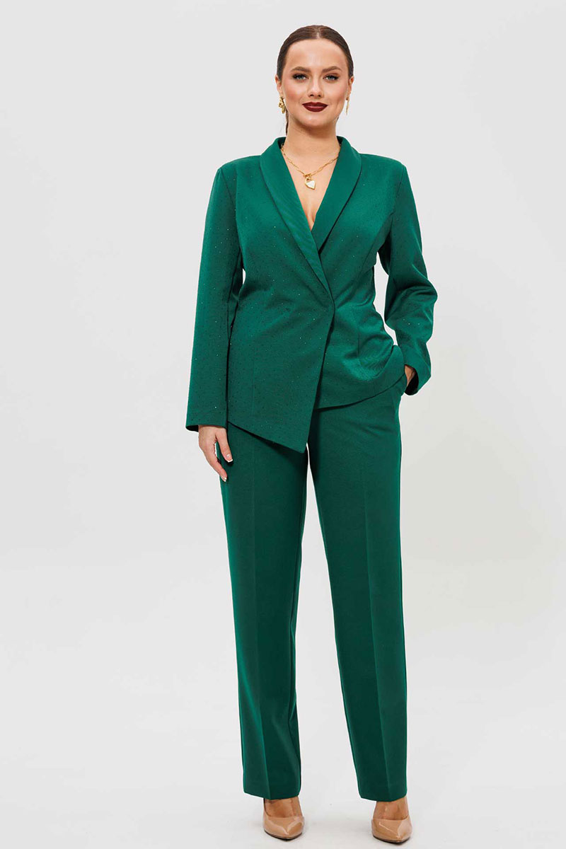 Элегантный женский костюм из зеленой костюмной ткани — идеальный выбор для тех, кто ценит комфорт и стиль в повседневной жизни. Женский брючный костюм, состоящий из жакета и брюк.