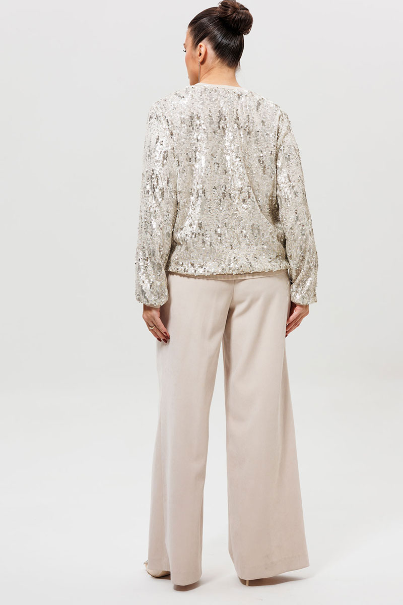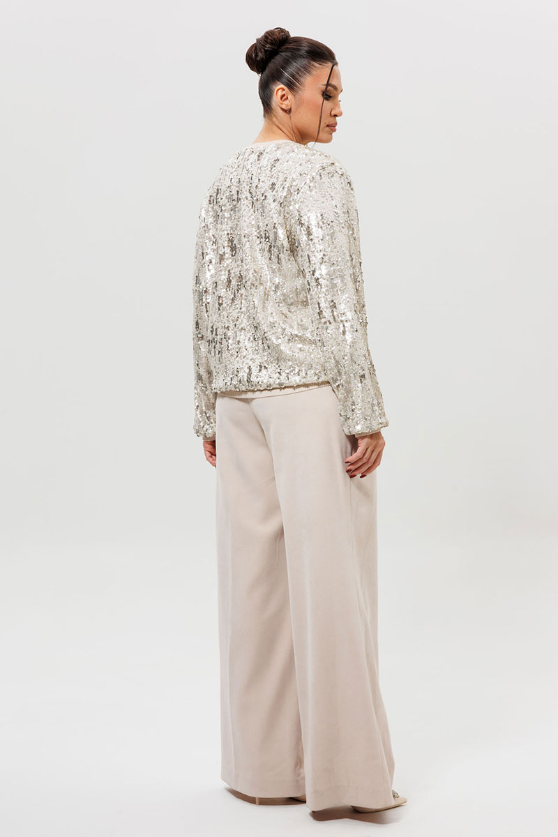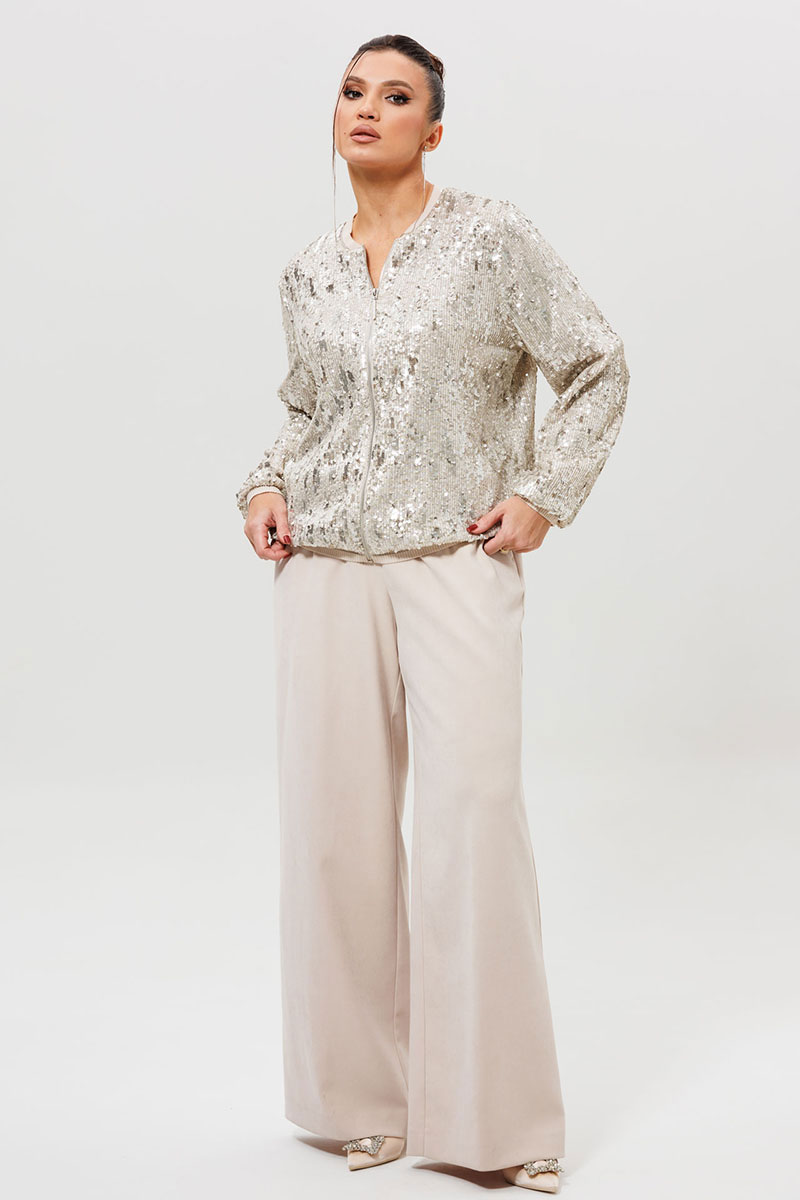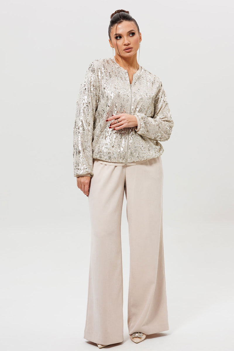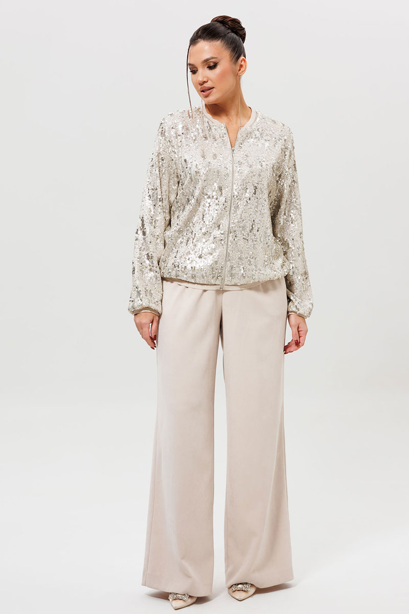 Этот готовый костюм с бомбером из пайеток (Арт. 1279) — идеальное решение для тех, кто хочет выглядеть ярко и стильно. Комплект включает в себя бомбер с пайетками и соответствующие ему брюки из костюмной ткани с напылением. Мерцающая куртка и светлые брюки создают целостный и дерзкий ансамбль, который не останется незамеченным. Такой костюм для вечеринки станет вашим лучшим выбором для посещения клуба, тематического мероприятия или любого события, где важно подчеркнуть свою индивидуальность.