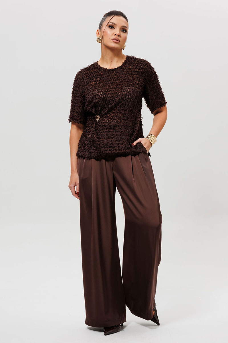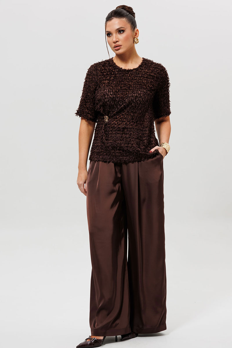 Брюки выполнены из атласной ткани, расширены к низу. На передних половинках брюк обработаны 2 складки и боковые карманы. На задних – талиевые вытачки. Застёжка на молнию и 2 потайных крючка. Эти атласные брюки (Арт. 1282) — Must Have для создания безупречного вечернего или праздничного образа. Модель представлена в двух богатых оттенках: насыщенном красном и глубоком шоколадном. Брюки выполнены из атласной ткани, которая мягко струится, подчеркивая изящество каждого движения. Универсальный крой позволяет сочетать их как с атласными топами (арт.1164) и блузами (например арт.1280) для выхода в свет, так и с кашемировыми джемперами для создания смарт-кэжуал образа. Атласные брюки с завышенной талией обеспечивают комфортную посадку и визуально вытягивают силуэт.