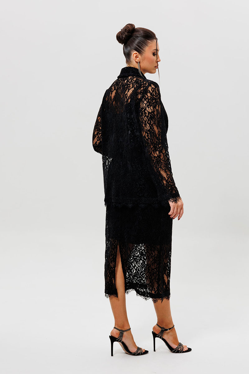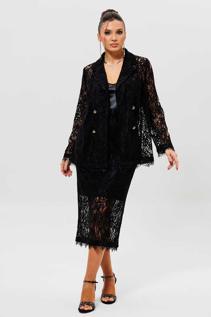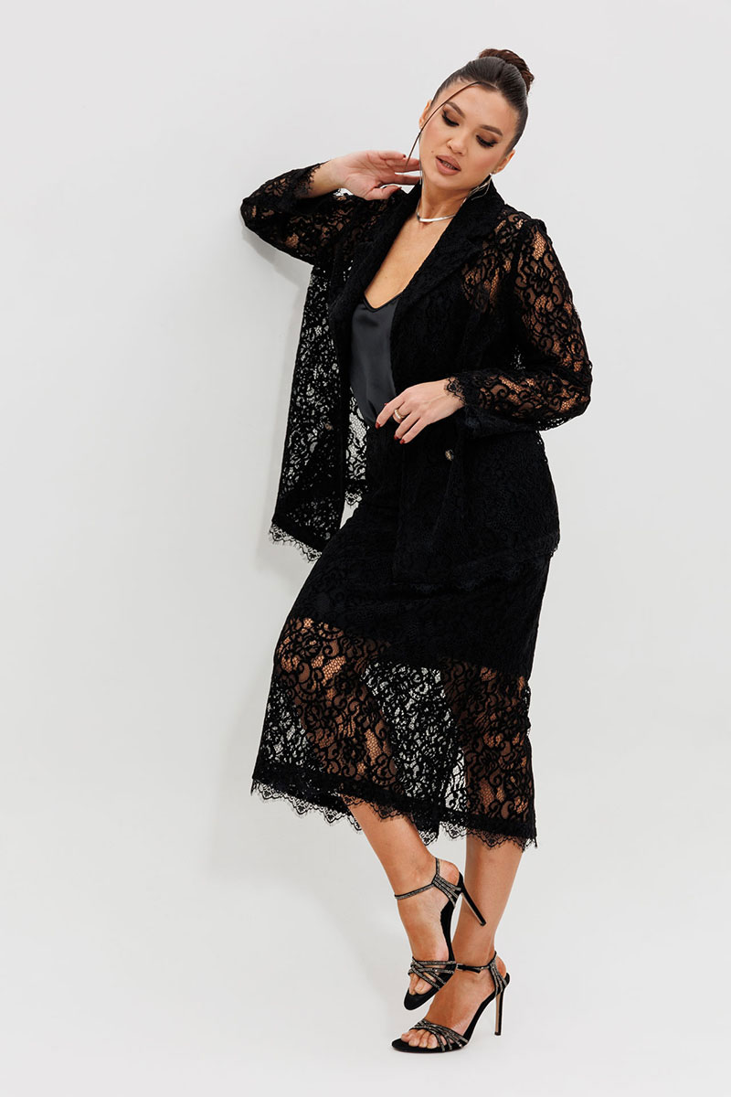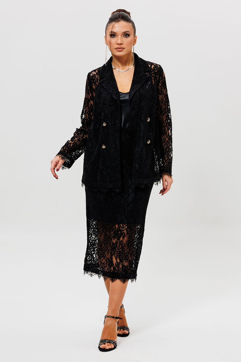 Этот гармоничный кружевной костюм с юбкой (Арт. 1284) выполнен в соблазнительной черной гамме. Комплект сочетает полуприлегающий жакет на подкладке и элегантную юбку из эластичной сетки с ажурным бархатным узором. Жакет с кружевными рукавами и лаконичным кроем создает утонченный верх, в то время как кружевная юбка подчеркивает женственность силуэта. Как и в других моделях коллекции, ткань обладает небольшой прозрачностью, поэтому для полного образа мы рекомендуем дополнить комплект однотонным топом (арт.1164) или бюстье. Этот ажурный костюм — идеальный выбор для романтического свидания, торжественного ужина или любого события, где вы хотите выглядеть неотразимо.