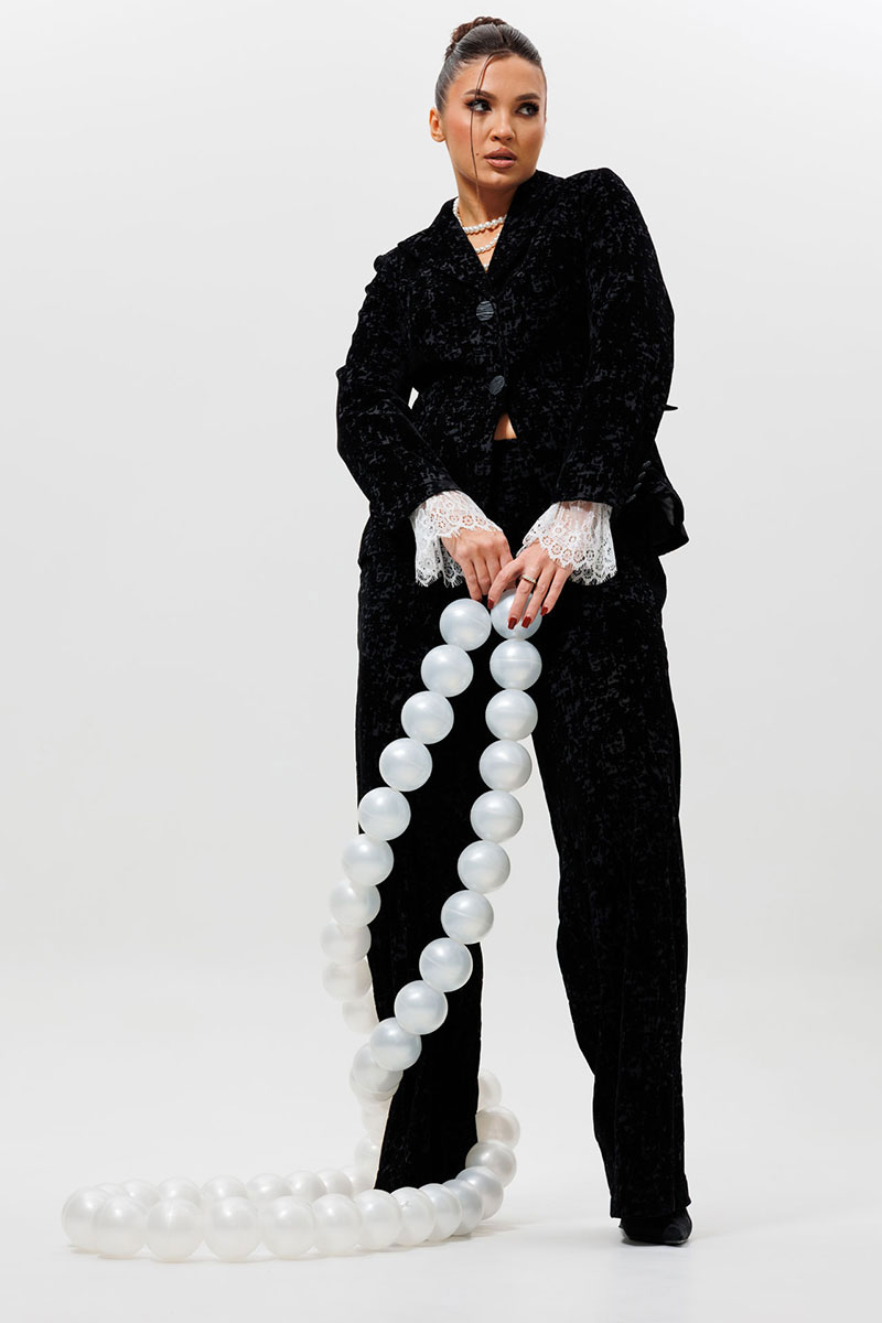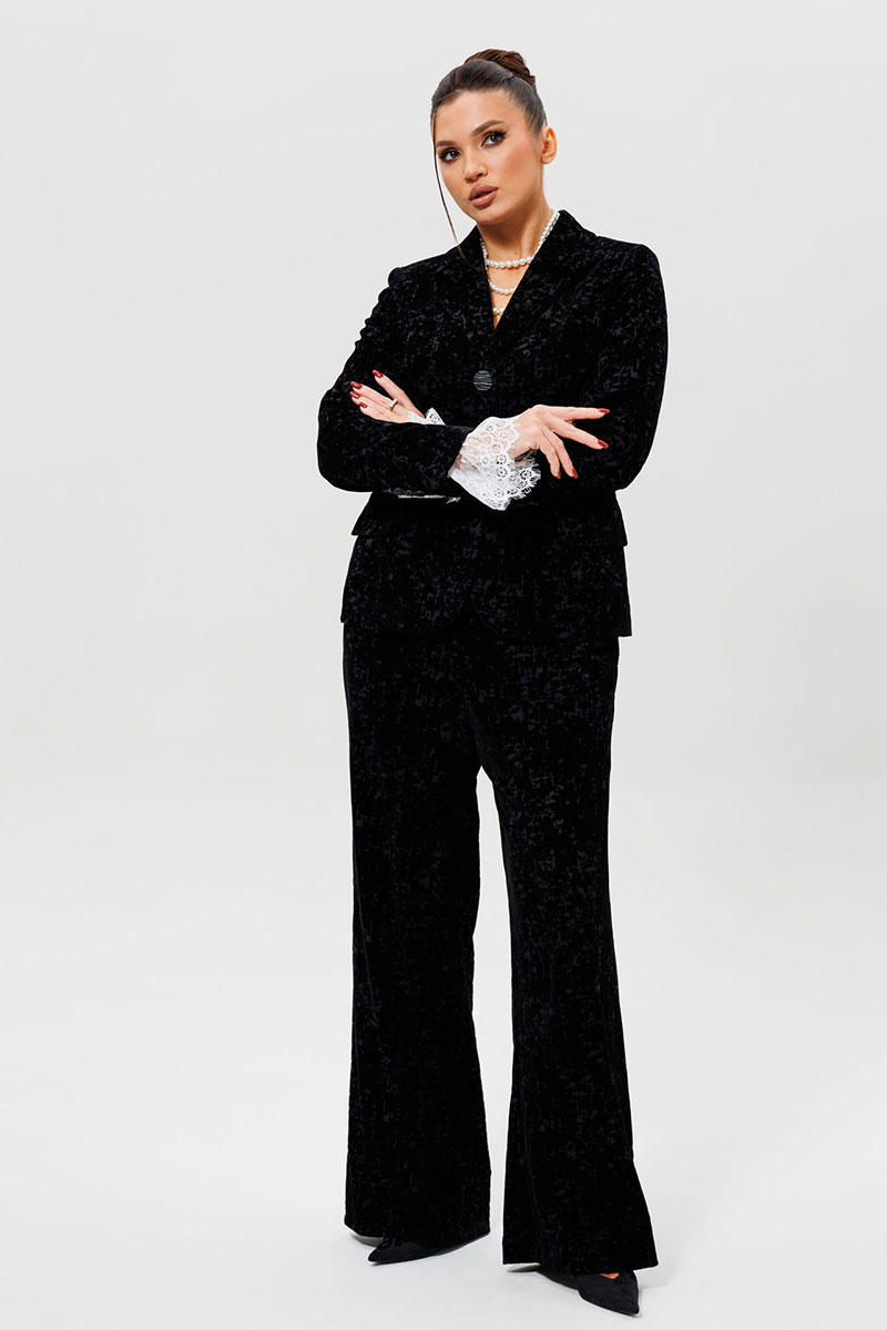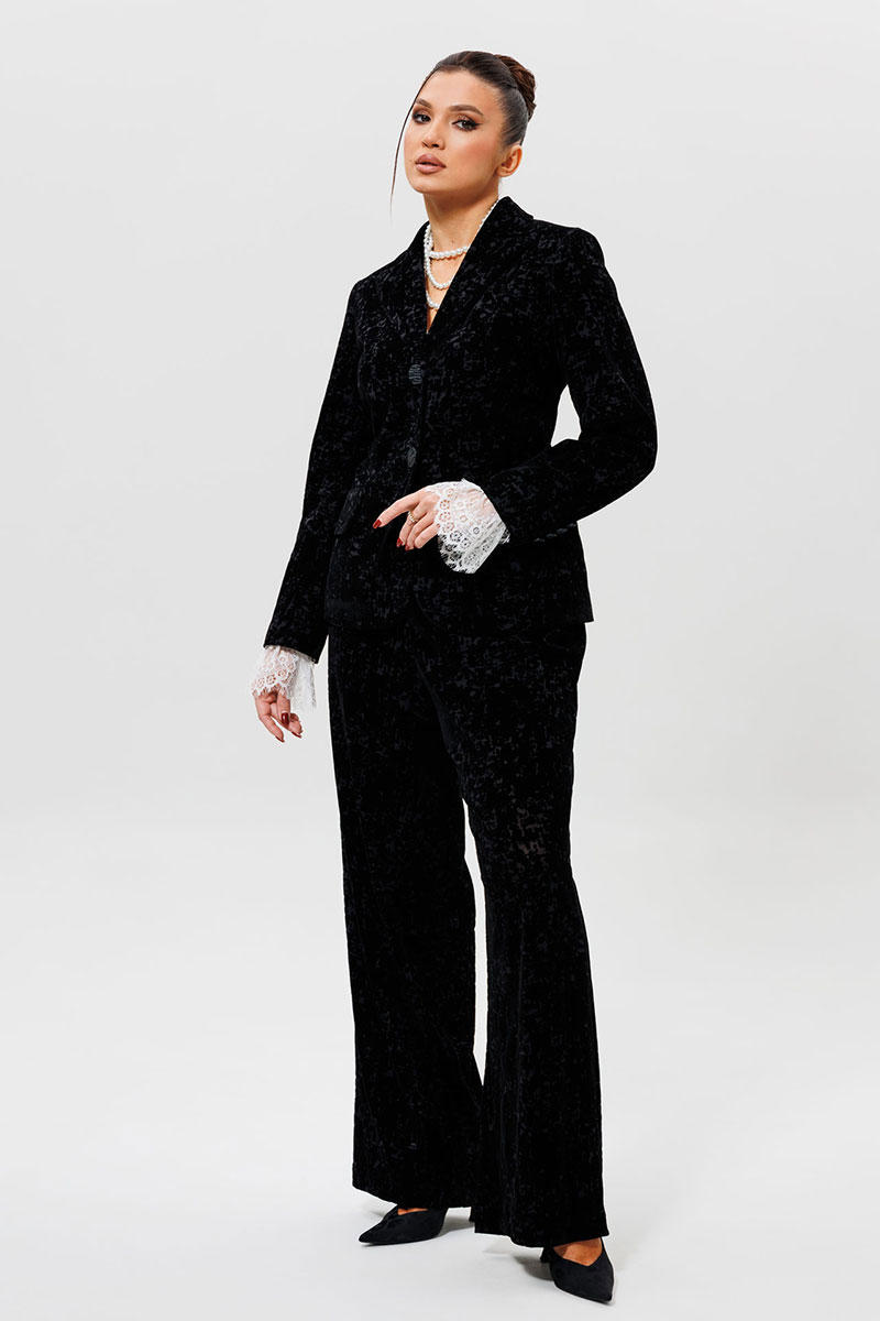 Этот черный бархатный костюм (жакет, манжеты и брюки) — воплощение вечерней элегантности. Комплект из жакета и чуть прямых брюк на подкладке станет основой для безупречного праздничного образа. Жакет с притягивает взгляды и красиво переливается при свете софитов и вечерних огней, делая его идеальным выбором для выхода в ресторан, театр или на новогодний корпоратив. Крой жакета позволяет комбинировать его с брюками и юбками с высокой талией, визуально вытягивая силуэт. Бархатные брюки (на резинке) прямого кроя выгодно оттеняют нарядный верх и обеспечивают комфорт. Такой костюм для праздника можно носить с кружевной или шелковой блузкой, создавая разные стилистические вариации. Этот элегантный костюм подчеркнет ваш безупречный вкус и станет выигрышной инвестицией в гардероб. Дополняют модель кружевные манжеты, которые фиксируются по руке на резинку.
