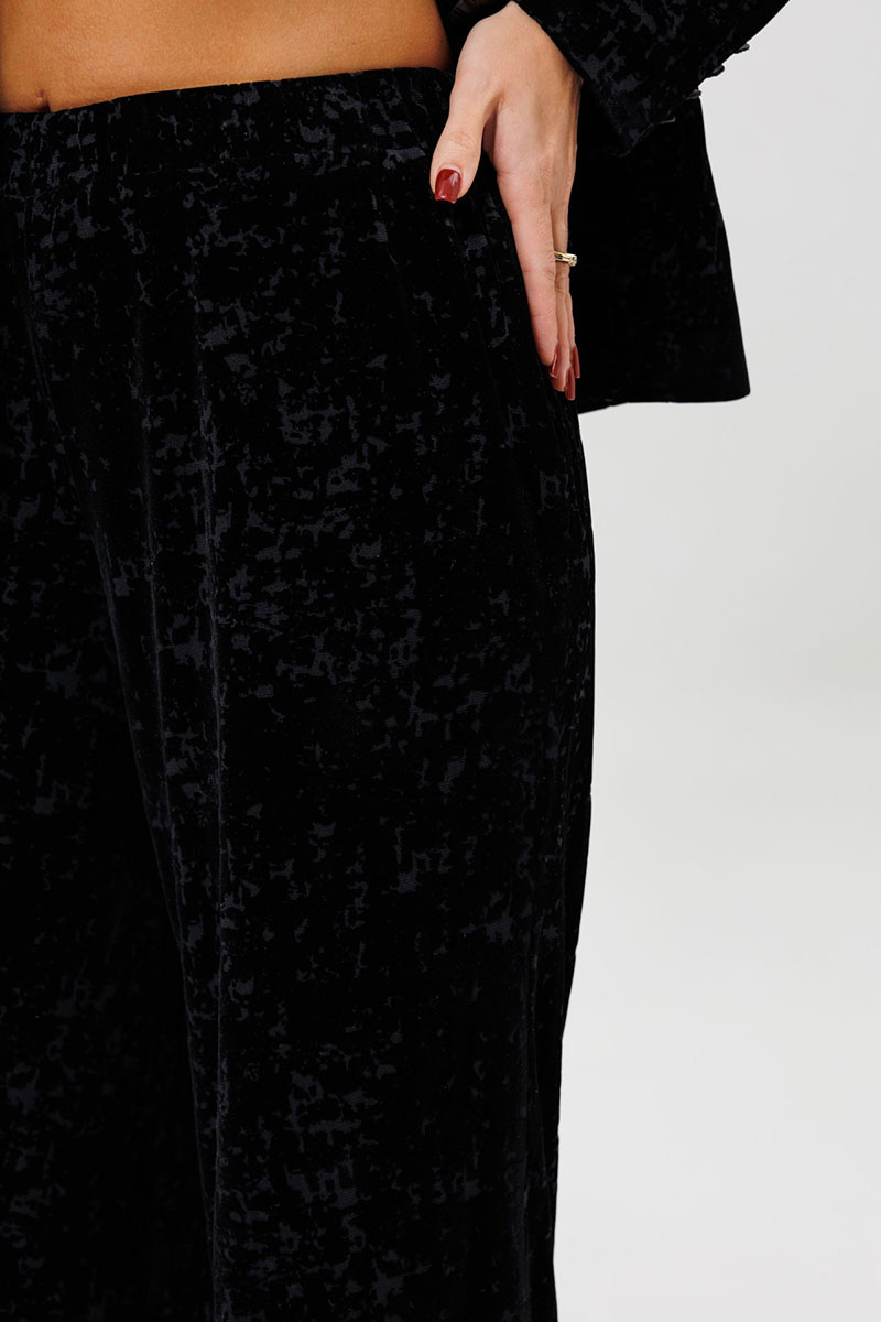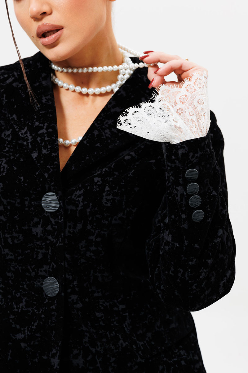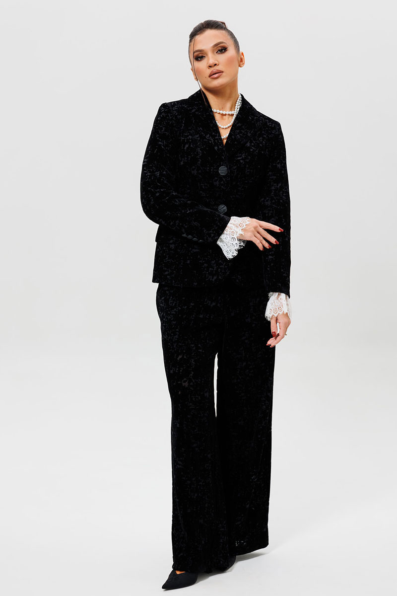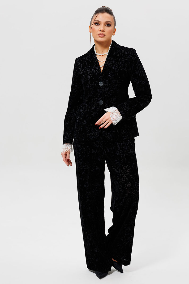 Этот черный бархатный костюм (жакет, манжеты и брюки) — воплощение вечерней элегантности. Комплект из жакета и чуть прямых брюк на подкладке станет основой для безупречного праздничного образа. Жакет с притягивает взгляды и красиво переливается при свете софитов и вечерних огней, делая его идеальным выбором для выхода в ресторан, театр или на новогодний корпоратив. Крой жакета позволяет комбинировать его с брюками и юбками с высокой талией, визуально вытягивая силуэт. Бархатные брюки (на резинке) прямого кроя выгодно оттеняют нарядный верх и обеспечивают комфорт. Такой костюм для праздника можно носить с кружевной или шелковой блузкой, создавая разные стилистические вариации. Этот элегантный костюм подчеркнет ваш безупречный вкус и станет выигрышной инвестицией в гардероб. Дополняют модель кружевные манжеты, которые фиксируются по руке на резинку.