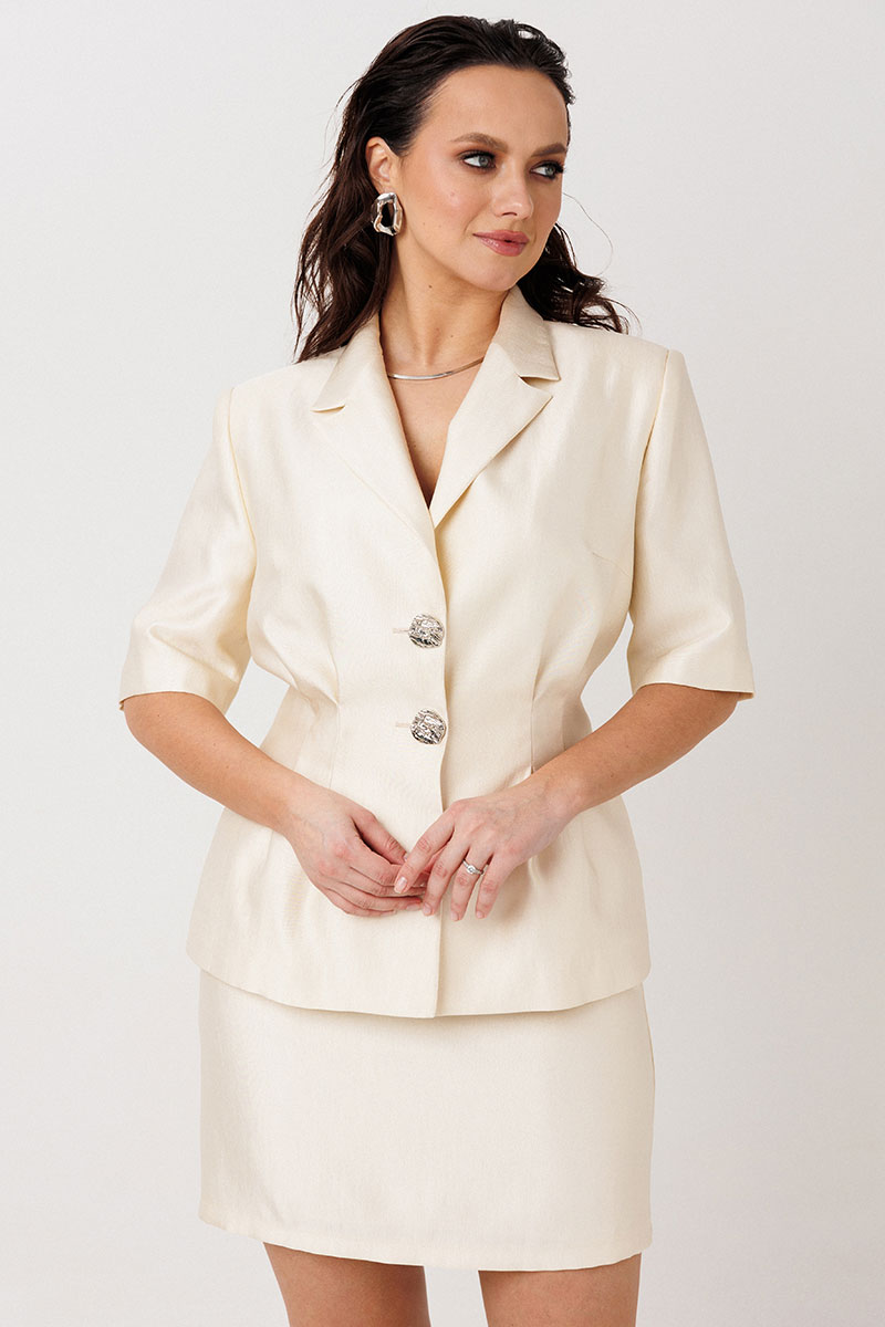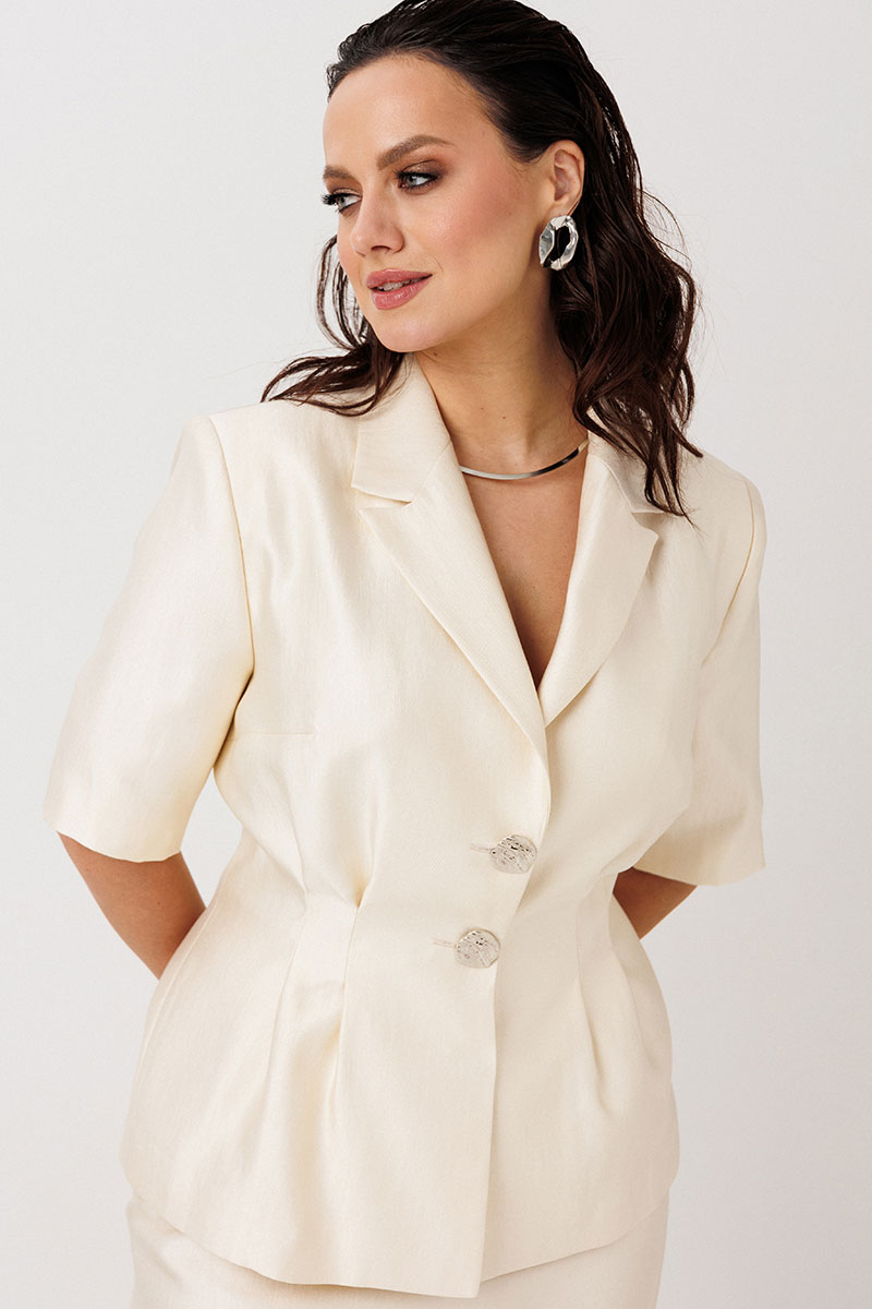 Жакет с V-образным вырезом и приталенным силуэтом застегивается на два декоративных пуговицы, формирующих акцент на талии. Короткие рукава с четкой структурной обработкой краев обеспечивают функциональность и лаконичность.
