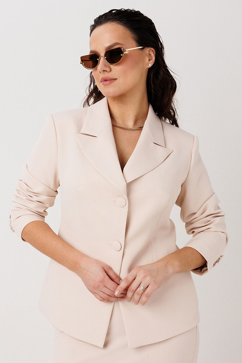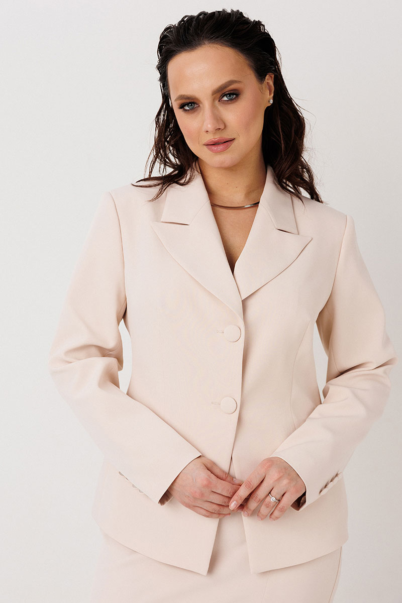 Жакет полуприлегающего силуэта, спинка со средним швом, заканчивающимся шлицей. По конструкции предусмотрен воротник с лацканами. Застежка на две пуговицы. В передней части предусмотрены два прорезных кармана. Рукава втачные, двухшовные, со шлицей на пуговицах.