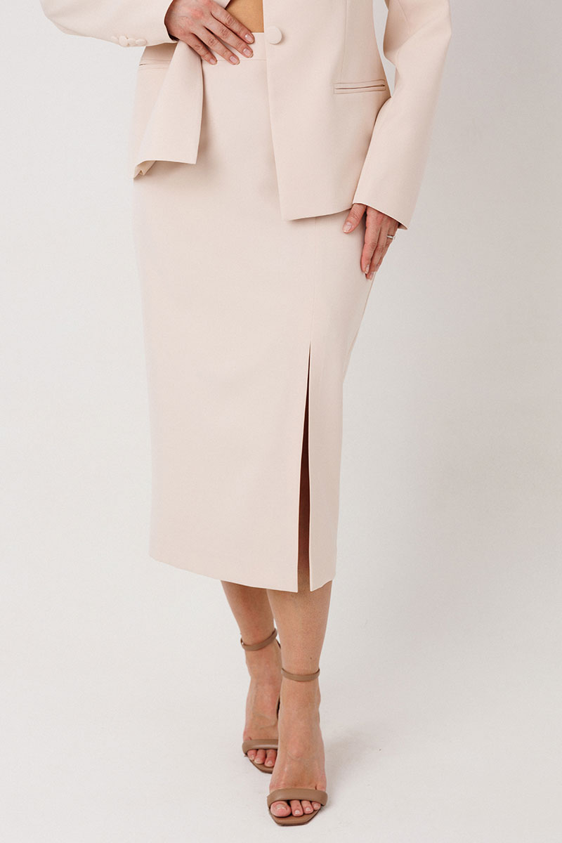 Юбка длиной миди, слегка зауженная к низу. Застежка на молнию в центральном шве. В левой боковой части юбки размещен разрез от колена до низа, что обеспечивает свободу движения и добавляет элегантности.