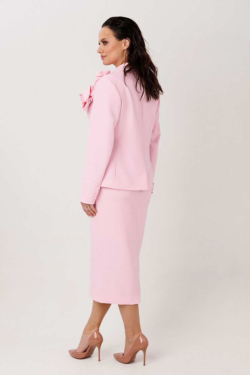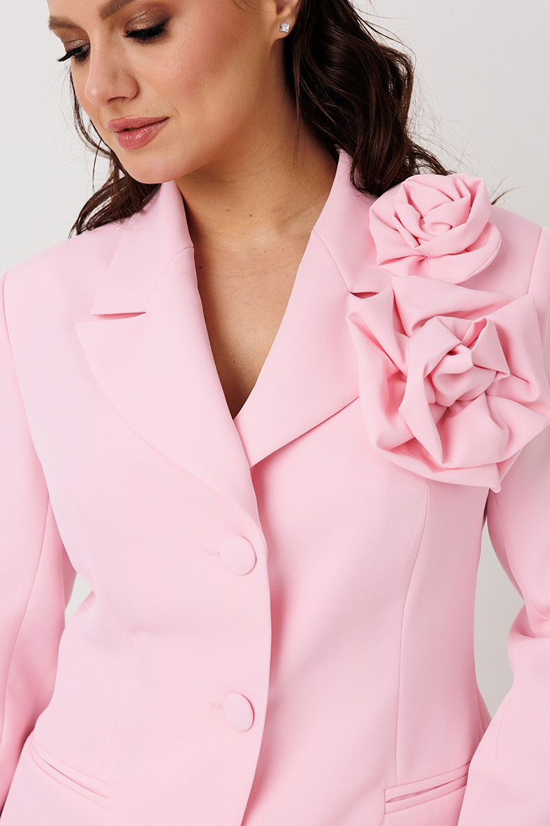 Жакет полуприлегающего силуэта, спинка со средним швом, заканчивающимся шлицей. По конструкции предусмотрен воротник с лацканами. Застежка на две пуговицы. В передней части предусмотрены два прорезных кармана. Рукава втачные, двухшовные, со шлицей на пуговицах.