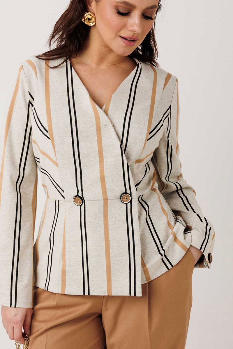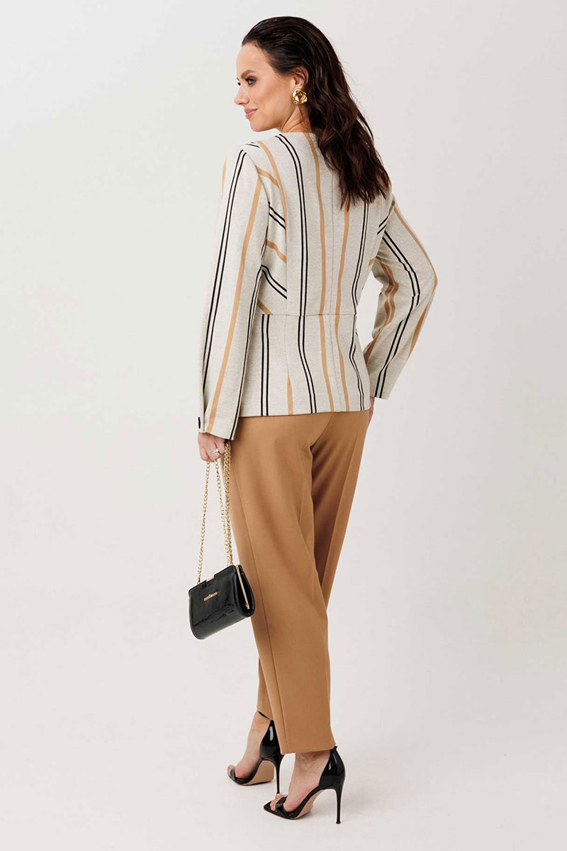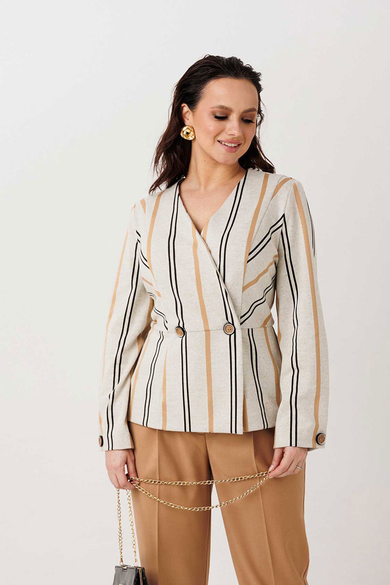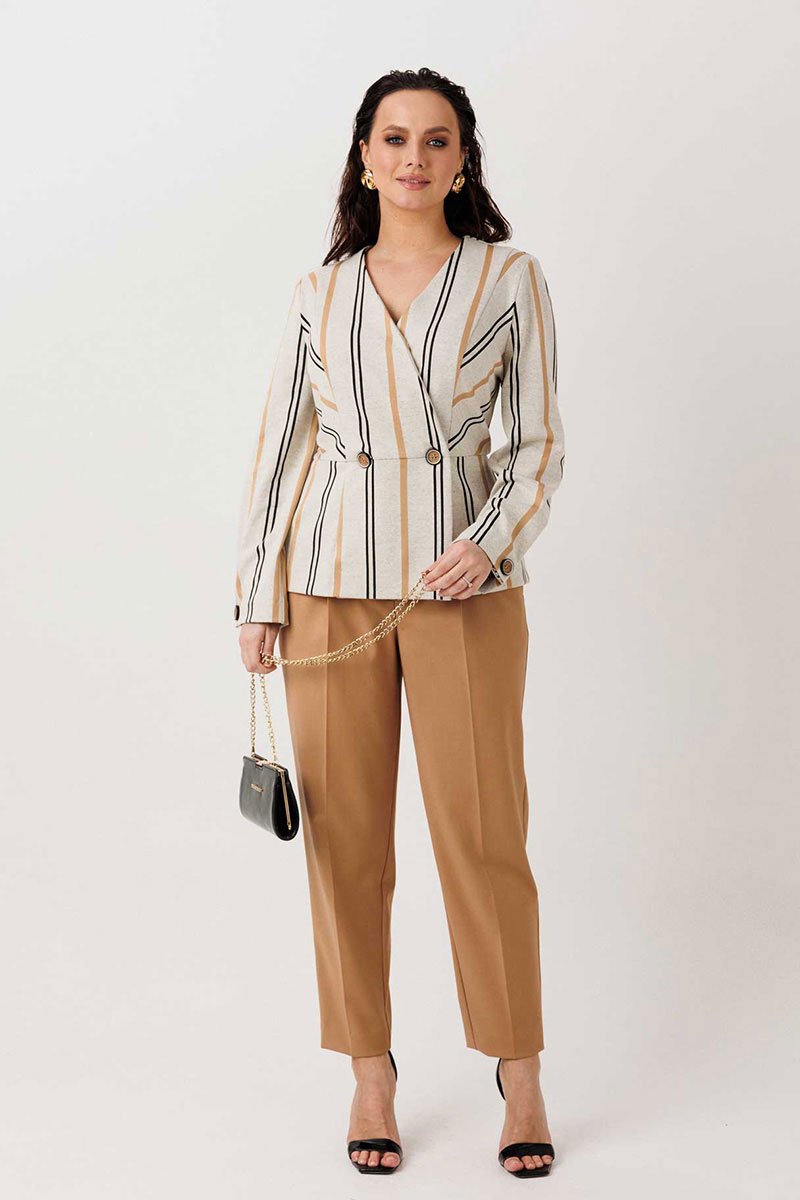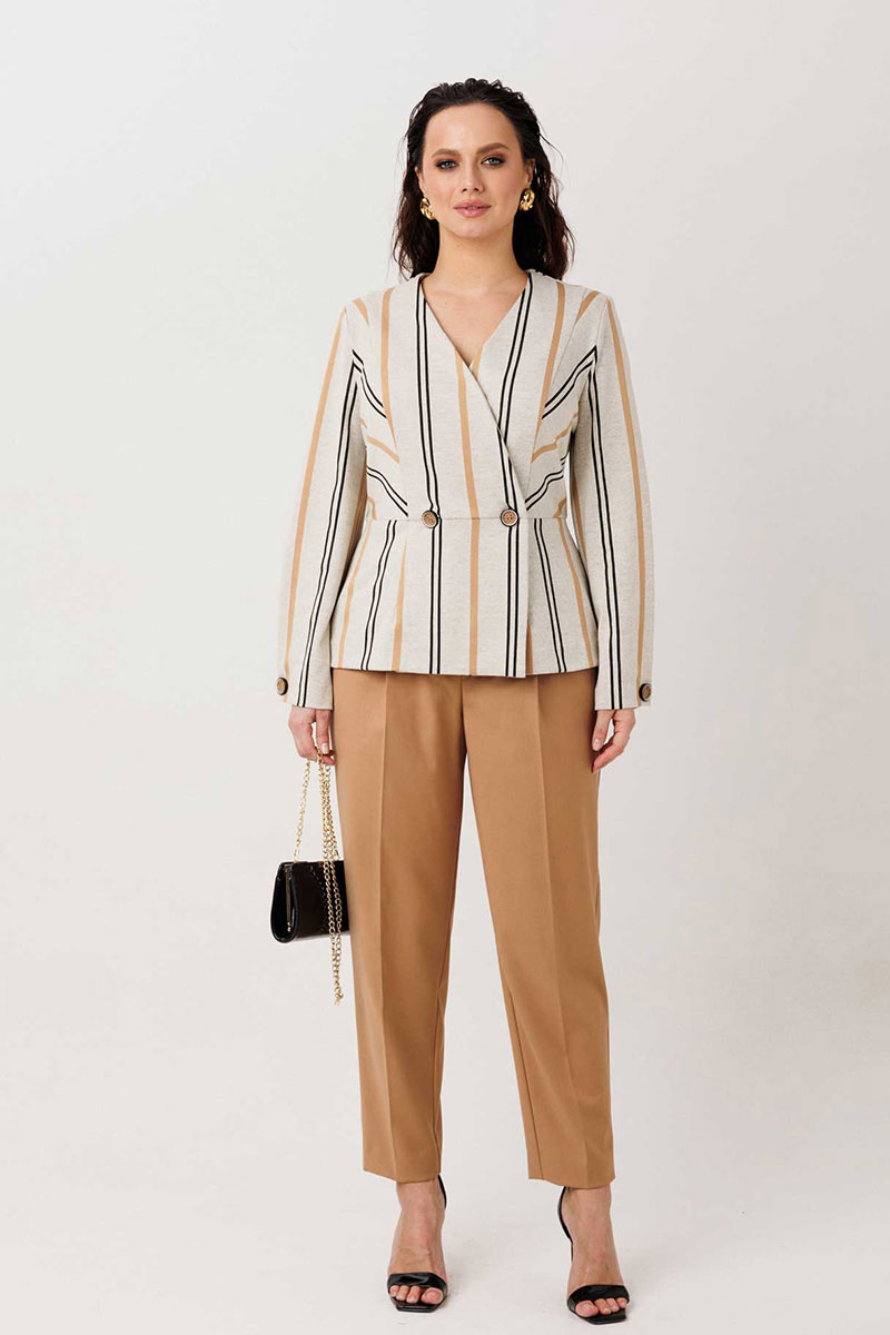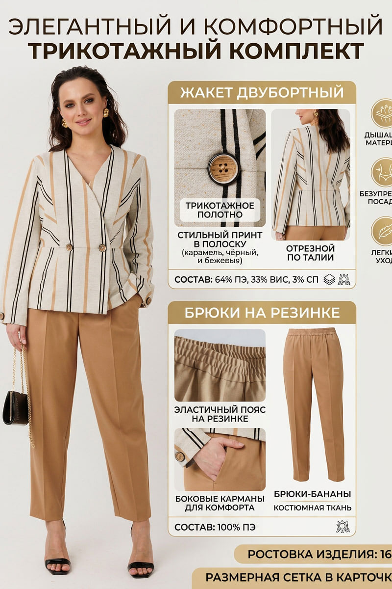 Костюм женский, состоящий из трикотажного жакета без подкладки и брюк. Жакет полуприлегающего силуэта, отрезной по линии талии, с двухбортной застежкой. Перед с рельефами и почками, выкроенными по косой. Спинка с центральным швом, с рельефами и бочками по косой. Рукав втачной, одношовный, внизу со складкой и декоративной пуговицей. Брюки из костюмной ткани, зауженные к низу, на резинке. У брюк пояс на резинке, боковые карманы, имитация гульфика.