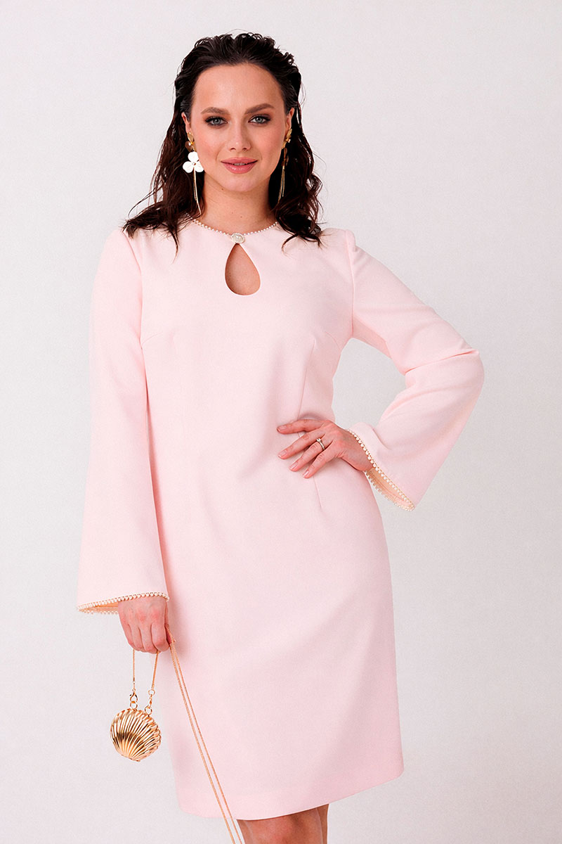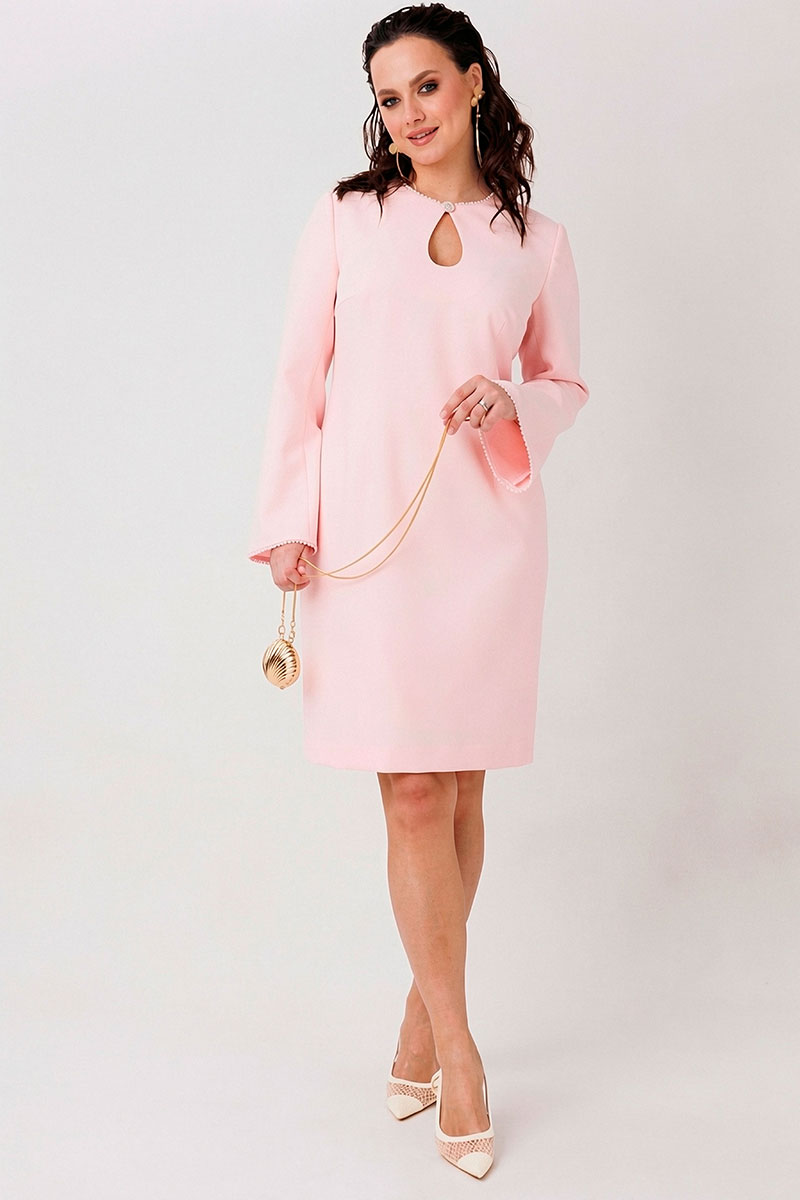 Элегантное платье-футляр, выполненное из плотной плательной ткани на подкладке. Дизайн акцентирован декоративной бейкой с жемчужным оформлением на горловине и манжетах рукавов —