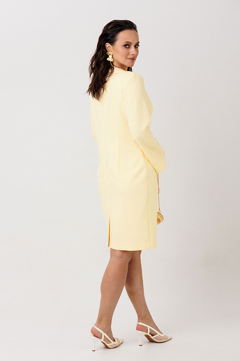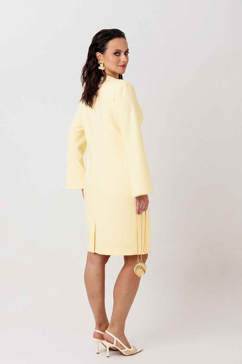 Конструктивные особенности: Прямой крой с приталенным силуэтом подчеркивает фигуру, сохраняя строгую линию. Спинка выполнена без декоративных элементов (простая конструкция,