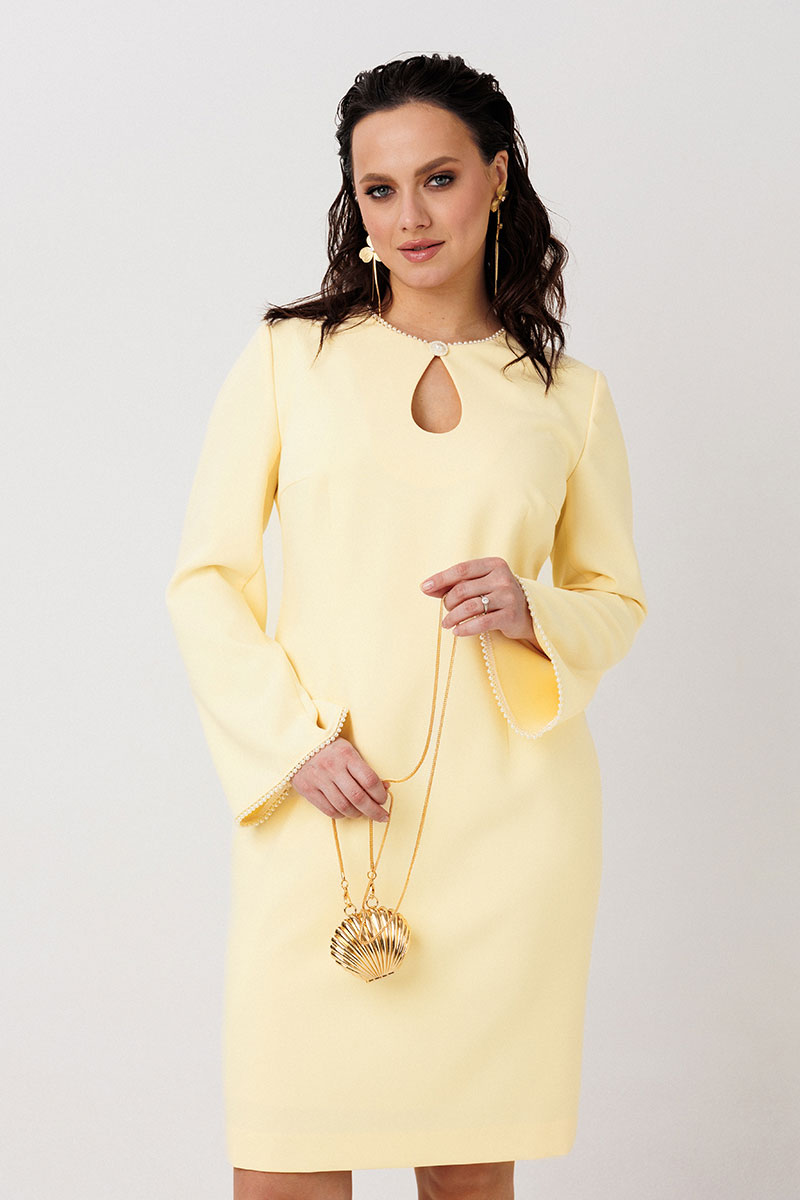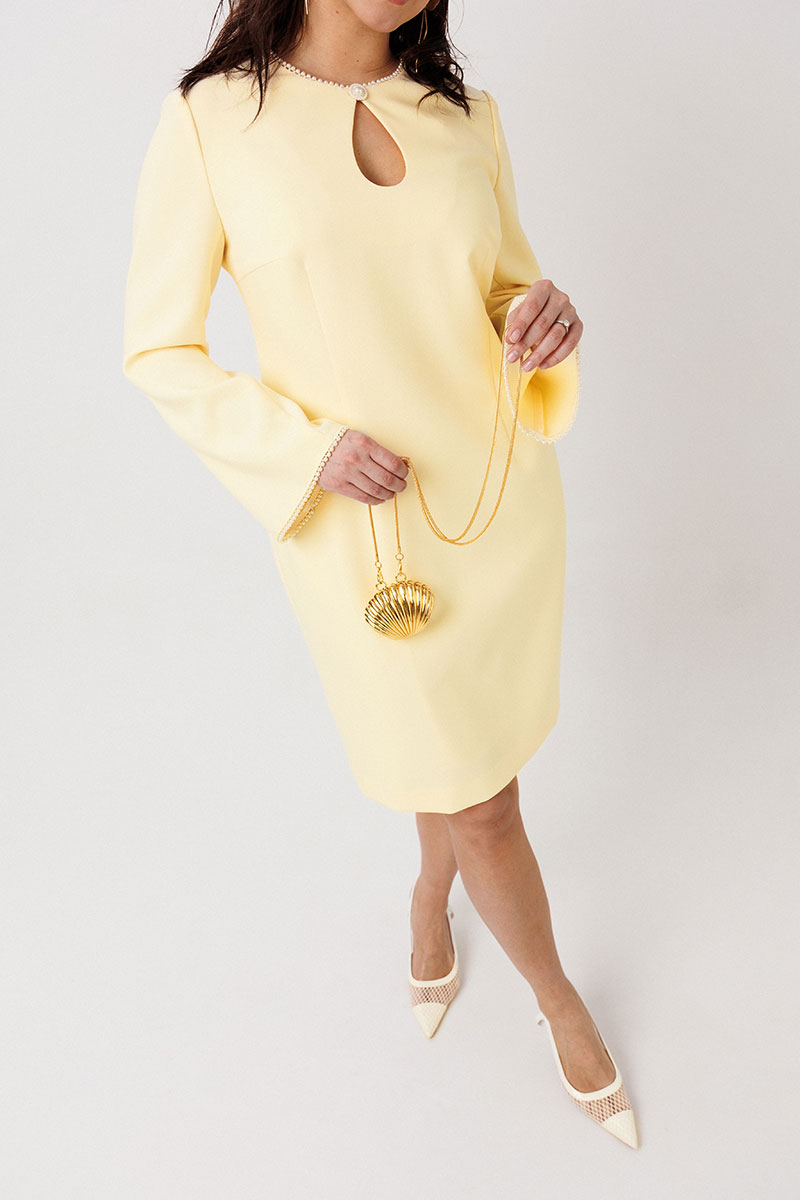 Элегантное платье-футляр, выполненное из плотной плательной ткани на подкладке. Дизайн акцентирован декоративной бейкой с жемчужным оформлением на горловине и манжетах рукавов —