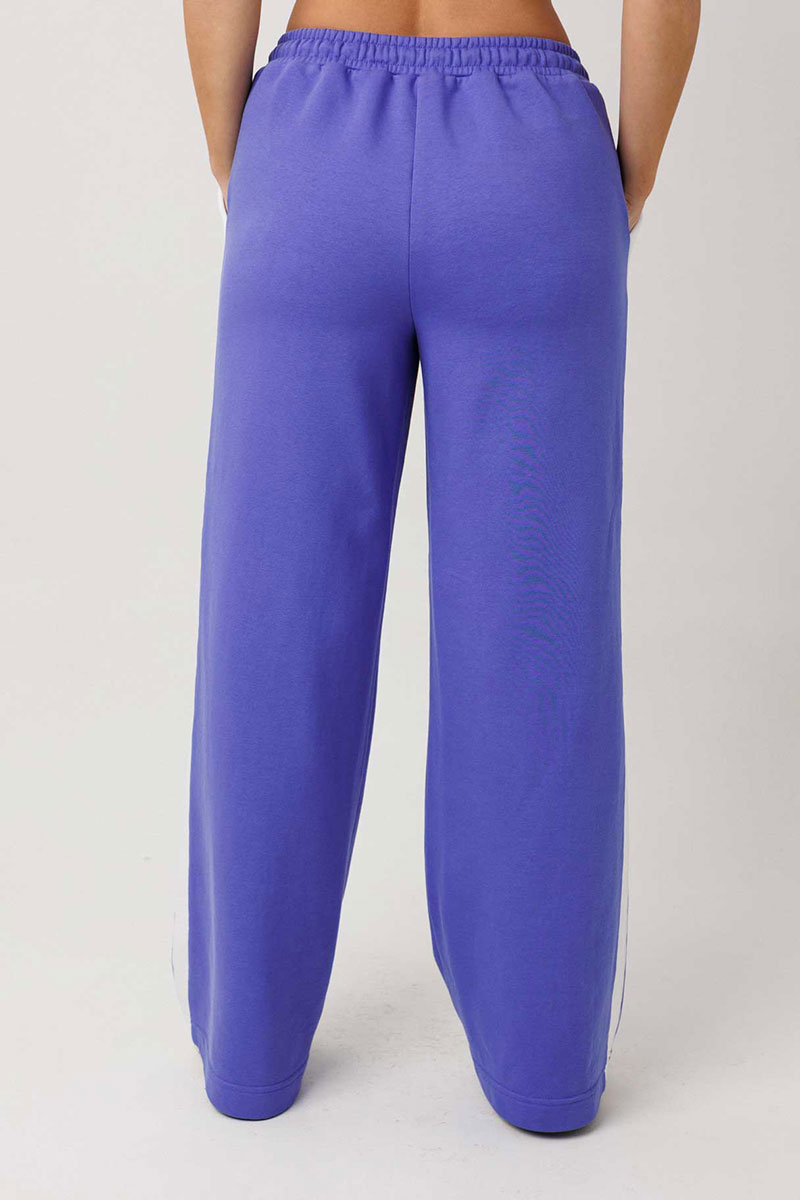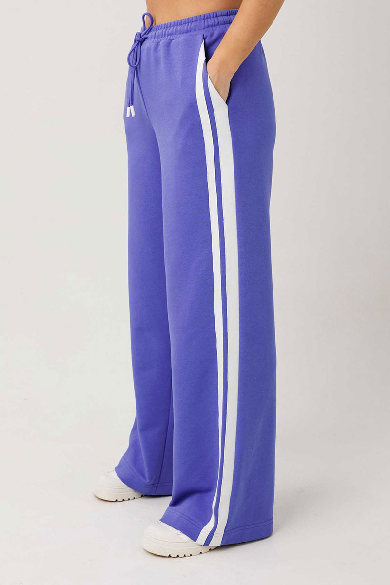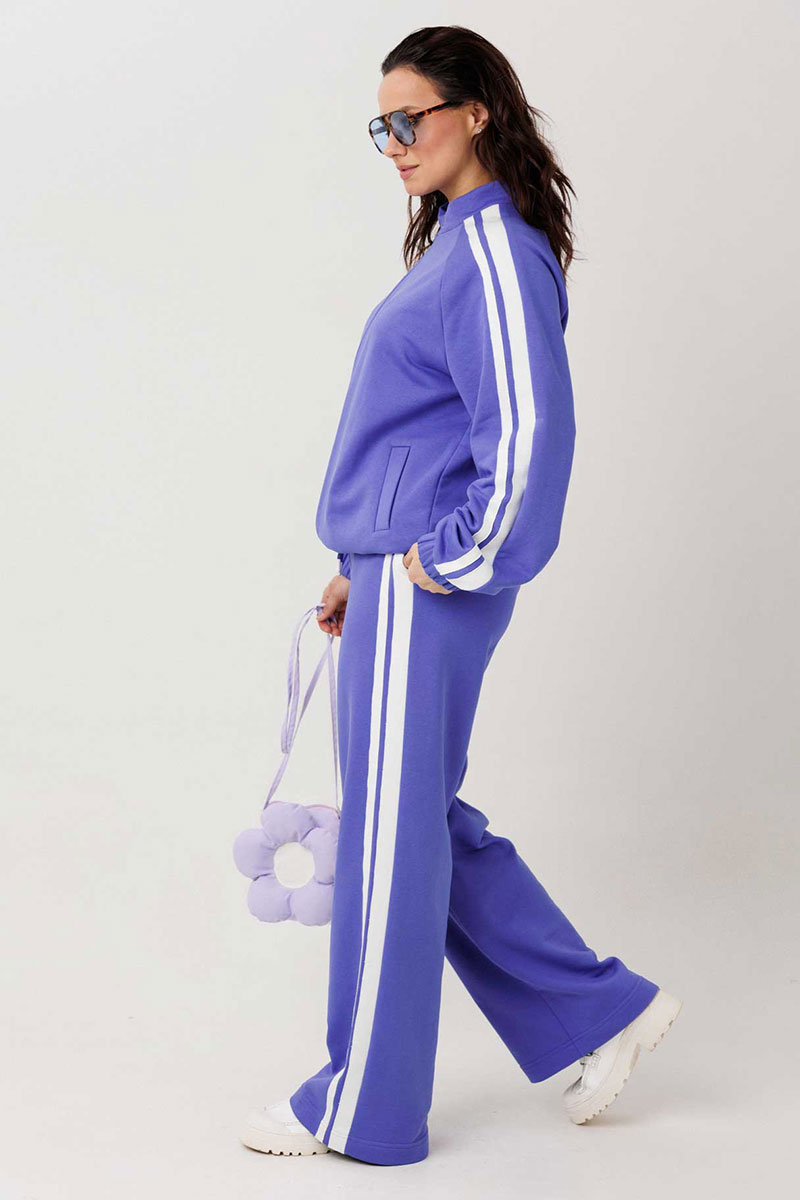 Брюки прямого свободного кроя, с боковыми карманами. Пояс притачной, на широкой резинке с дополнительной регулировкой шнуром. Контрастные лампасы по боковым швам. Низ брюк свободный, без манжет. Костюм представлен в двух цветовых решениях: насыщенный сине-фиолетовый с белыми лампасами и тёмно-серый с бледно-лимонными лампасами. Благодаря продуманной конструкции и качественной обработке швов изделие хорошо держит форму, не деформируется после стирки и подходит для активной носки. Идеальный вариант для тех, кто ценит сочетание функциональности, комфорта и современного спортивного стиля.