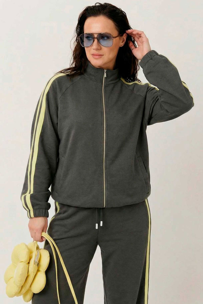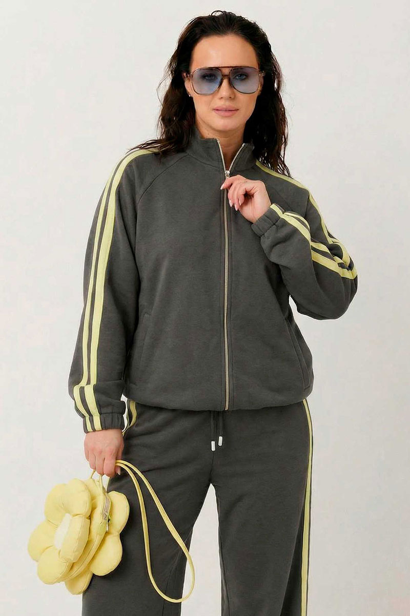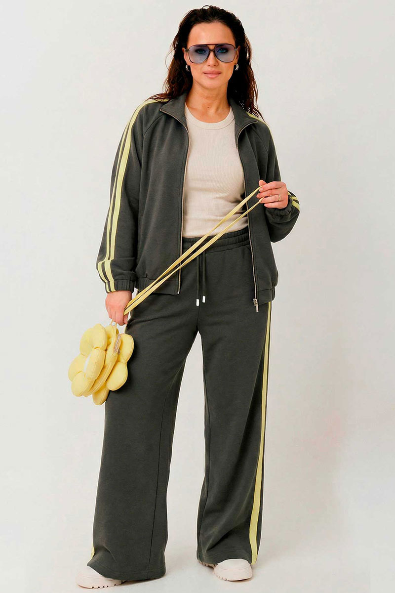 Брюки прямого свободного кроя, с боковыми карманами. Пояс притачной, на широкой резинке с дополнительной регулировкой шнуром. Контрастные лампасы по боковым швам. Низ брюк свободный, без манжет. Костюм представлен в двух цветовых решениях: насыщенный сине-фиолетовый с белыми лампасами и тёмно-серый с бледно-лимонными лампасами. Благодаря продуманной конструкции и качественной обработке швов изделие хорошо держит форму, не деформируется после стирки и подходит для активной носки. Идеальный вариант для тех, кто ценит сочетание функциональности, комфорта и современного спортивного стиля.