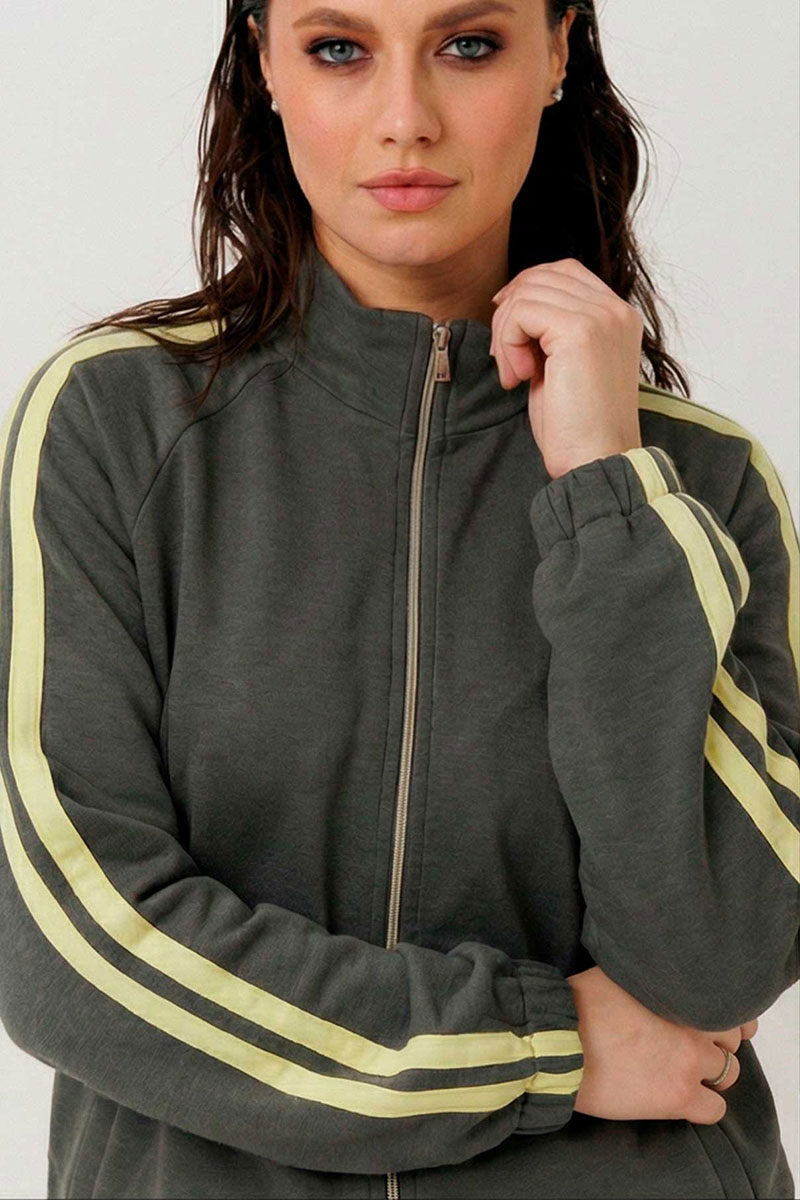 Куртка прямого силуэта, с центральной застёжкой на тесьму-молнию. Рукав-реглан с притачными манжетами на резинке. Низ изделия обработан притачным поясом на резинке. Функциональные боковые карманы с листочками. Контрастные лампасы по линии рукава.