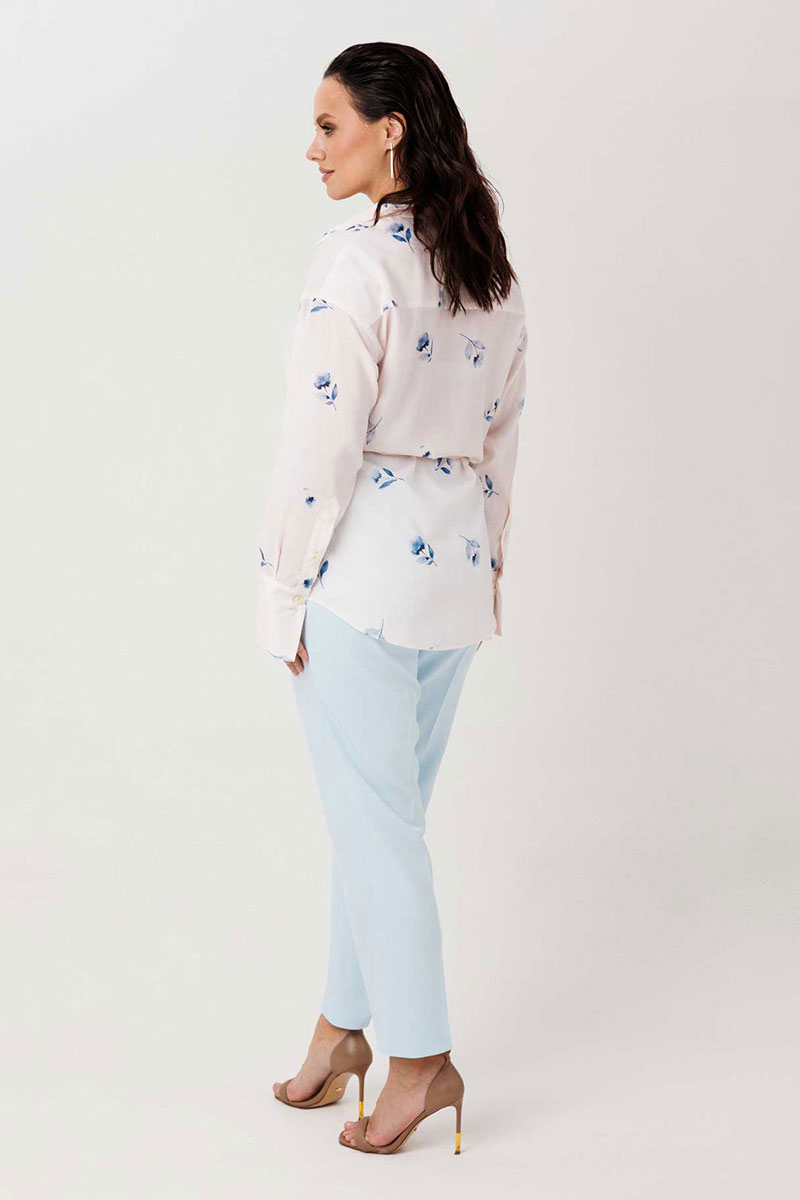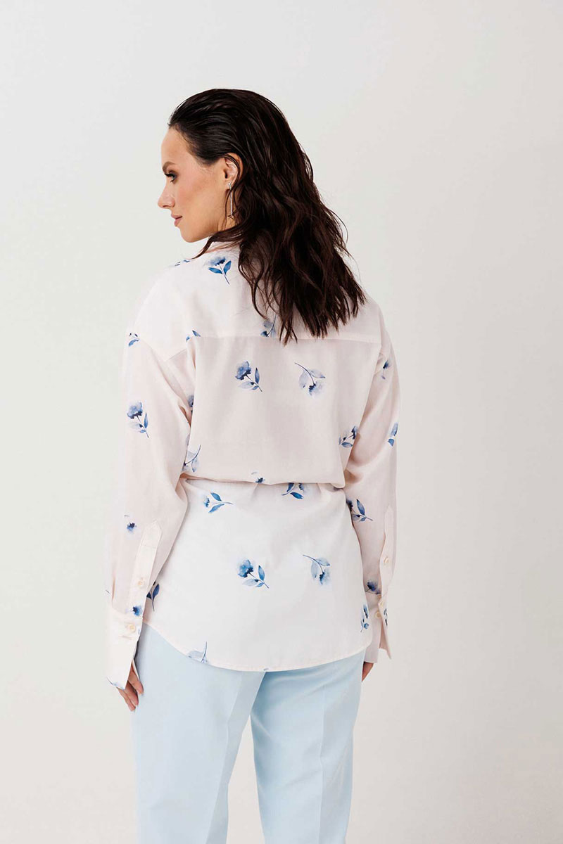 Лёгкая и элегантная блуза прямого силуэта, которая мягко подчёркивает фигуру за счёт завязок по линии талии. Вы сами регулируете посадку — от свободной до более приталенной, в