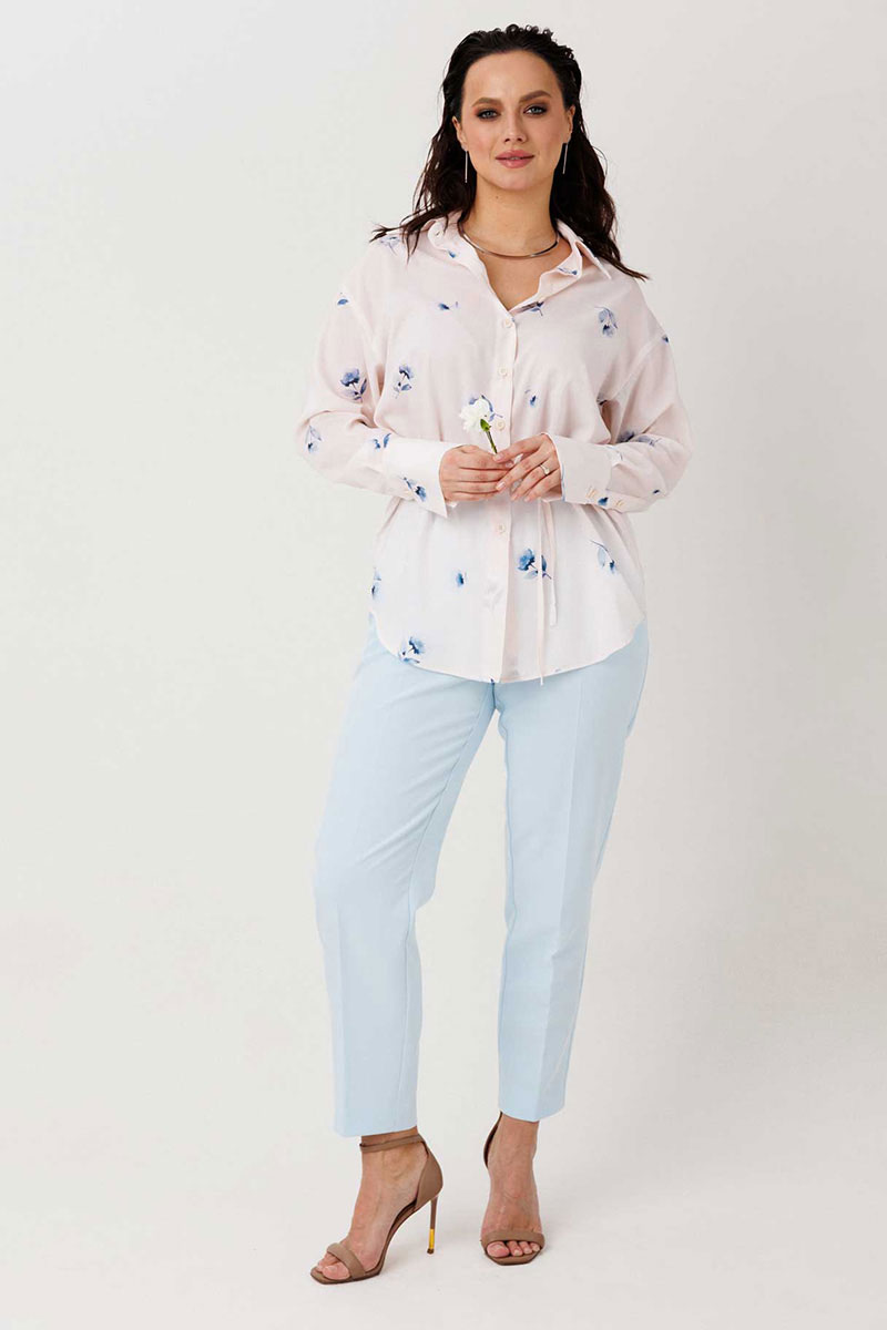 рукава втачные, одношовные с манжетой. Воротник и манжет рубашечного типа с отрезной стойкой. Воротник и манжет из отделочной ткани. Низ фигурный Блуза с акцентом на женственность и