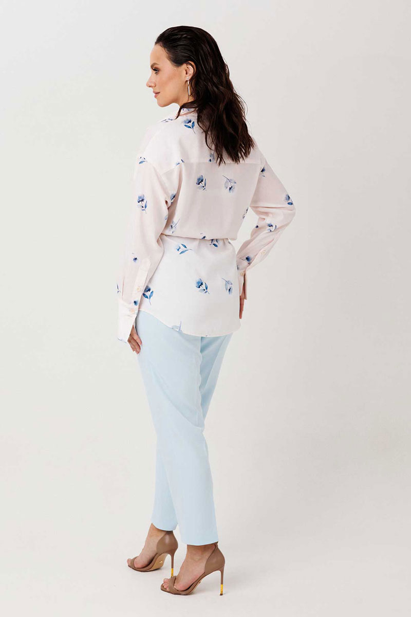 воротник и манжеты с отрезной стойкой — выполнены из отделочной ткани, что добавляет изделию аккуратности и визуального интереса. Центральная застёжка на пуговицы делает блузу удобной