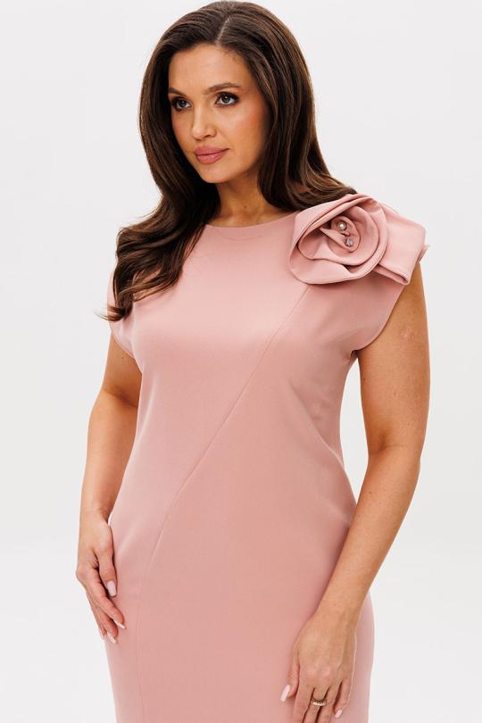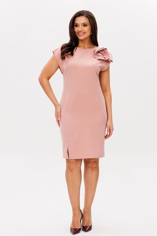 Платье женское полуприлегающего силуэта со спущенным плечом. По переду фигурный рельеф заканчивается небольшим разрезом. Горловина круглая. Застёжка потайная молния по среднему шву спинки. Спинка с четырьмя талевыми вытачками. Платье без подкладки. Украшением платья служит декоративный цветок ручной работы и бусины.