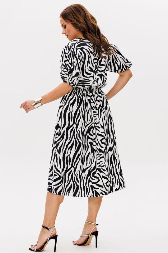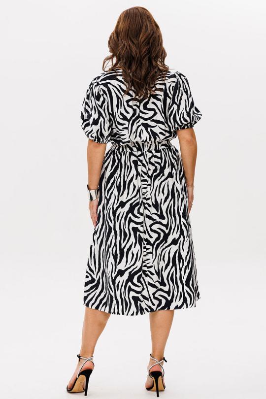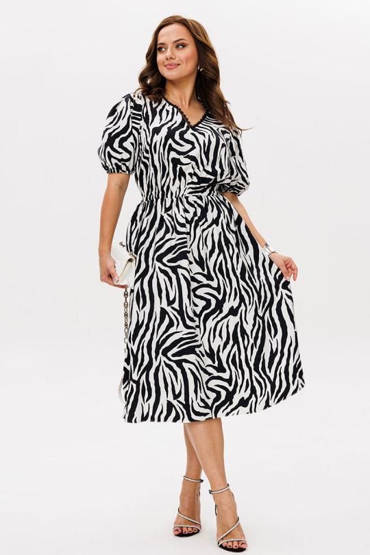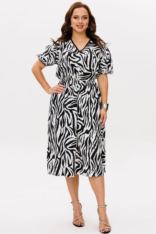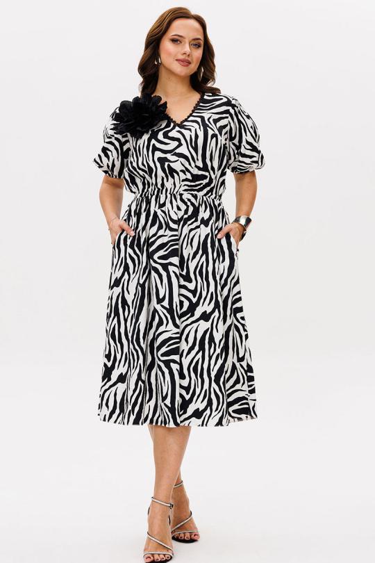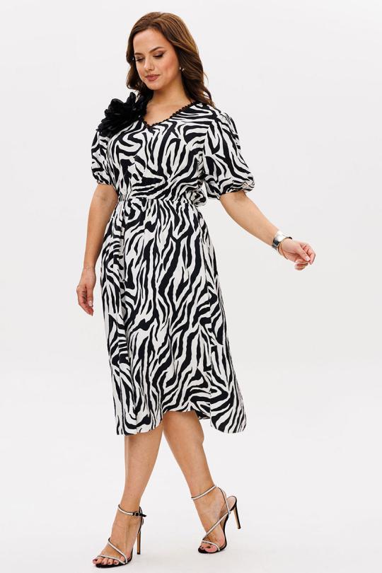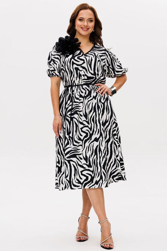 Платье женское полуприлегающего силуэта отрезное по линии талии. Лиф переда с нагрудными вытачками. Горловина V-образная. По среднему шву спинки сверху застёжка потайная молния. Юбка расклешённая. По линии талии эластичная тесьма резинка. Рукава одно шовные втачные. По окату рукава небольшие складки, низ со сборками. Украшает платье кружево. Изделие дополняет пояс кушак. Платье без подкладки.