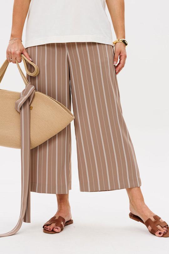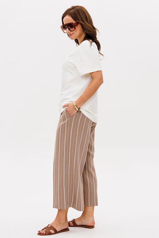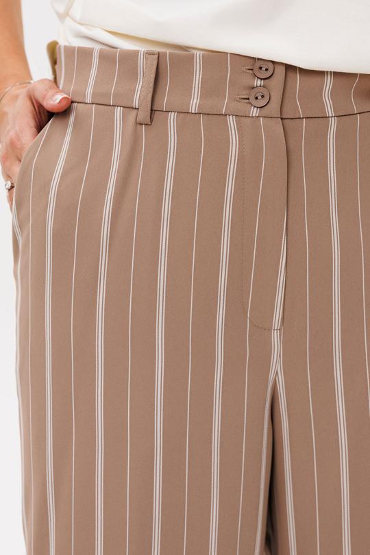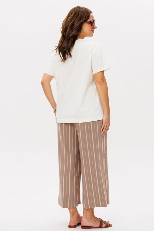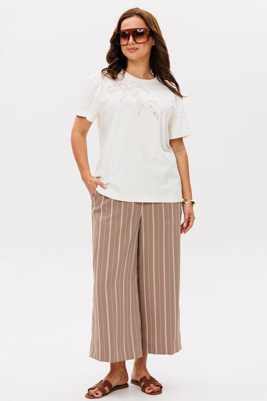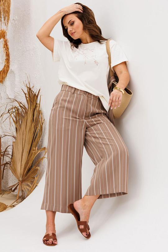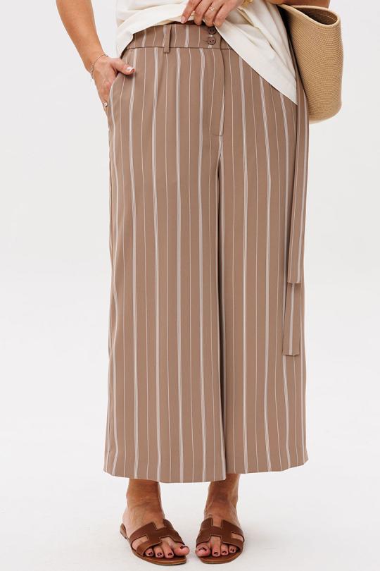 Брюки широкие прямые с высокой посадкой(кюлоты) до середины голени. Брюки на притачном поясе с функциональными боковыми карманами и застёжкой на потайную молнию с гульфиком и откоском. По спинке талевые вытачки.